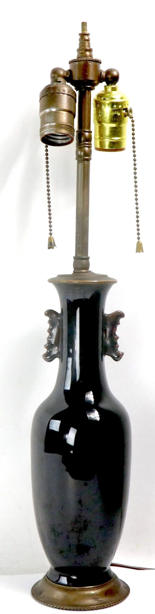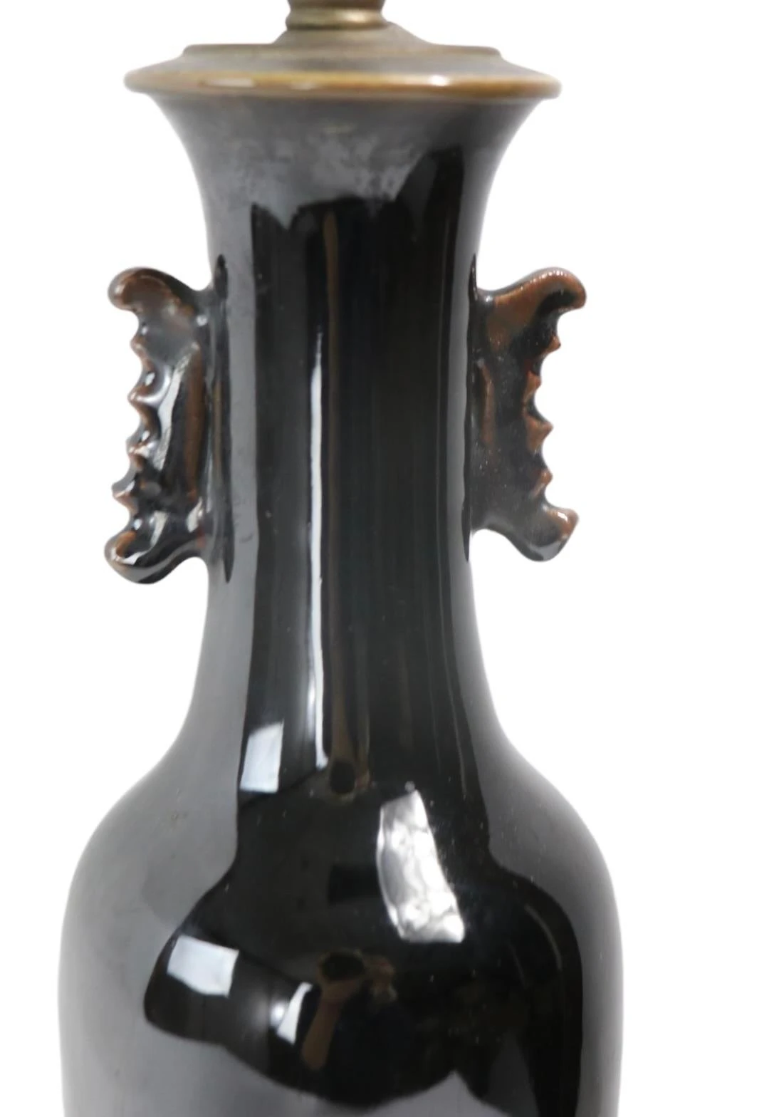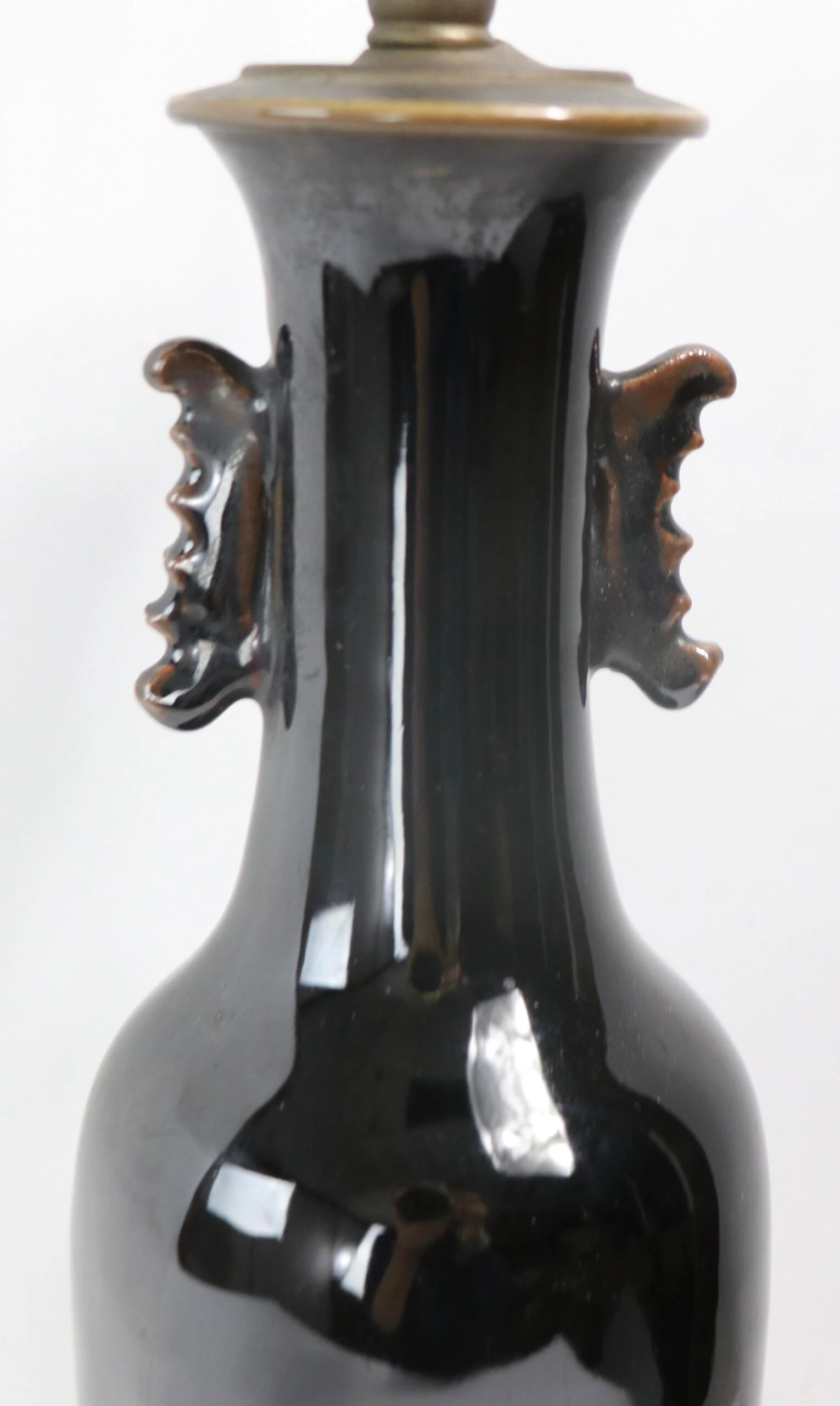 Vintage ceramic table lamp, executed in the Chinese style circa 1920 – 1940’s. The ceramic body has a high gloss glaze, and is dark brown in color. The lamp is in very good, working condition, free of damage or repairs.