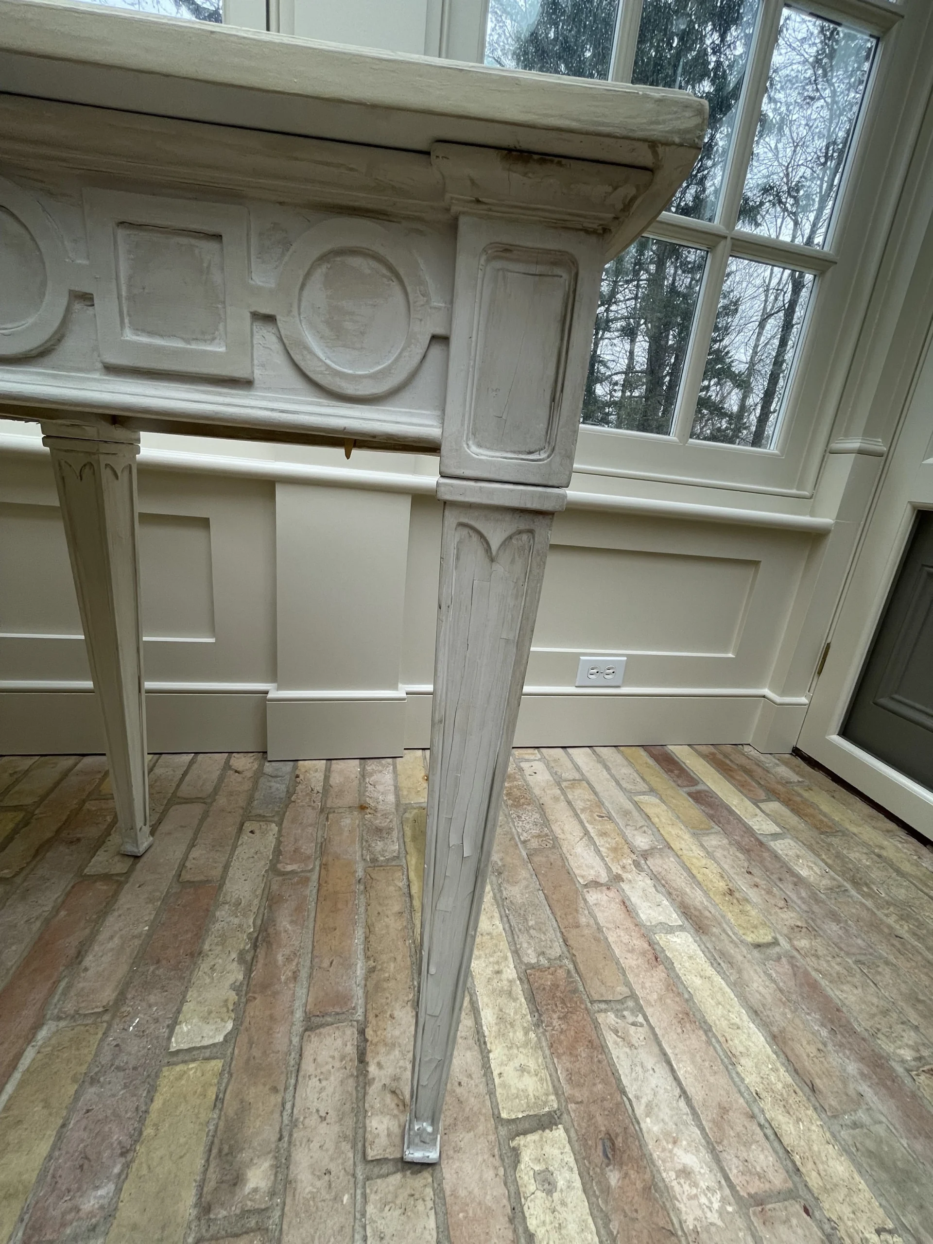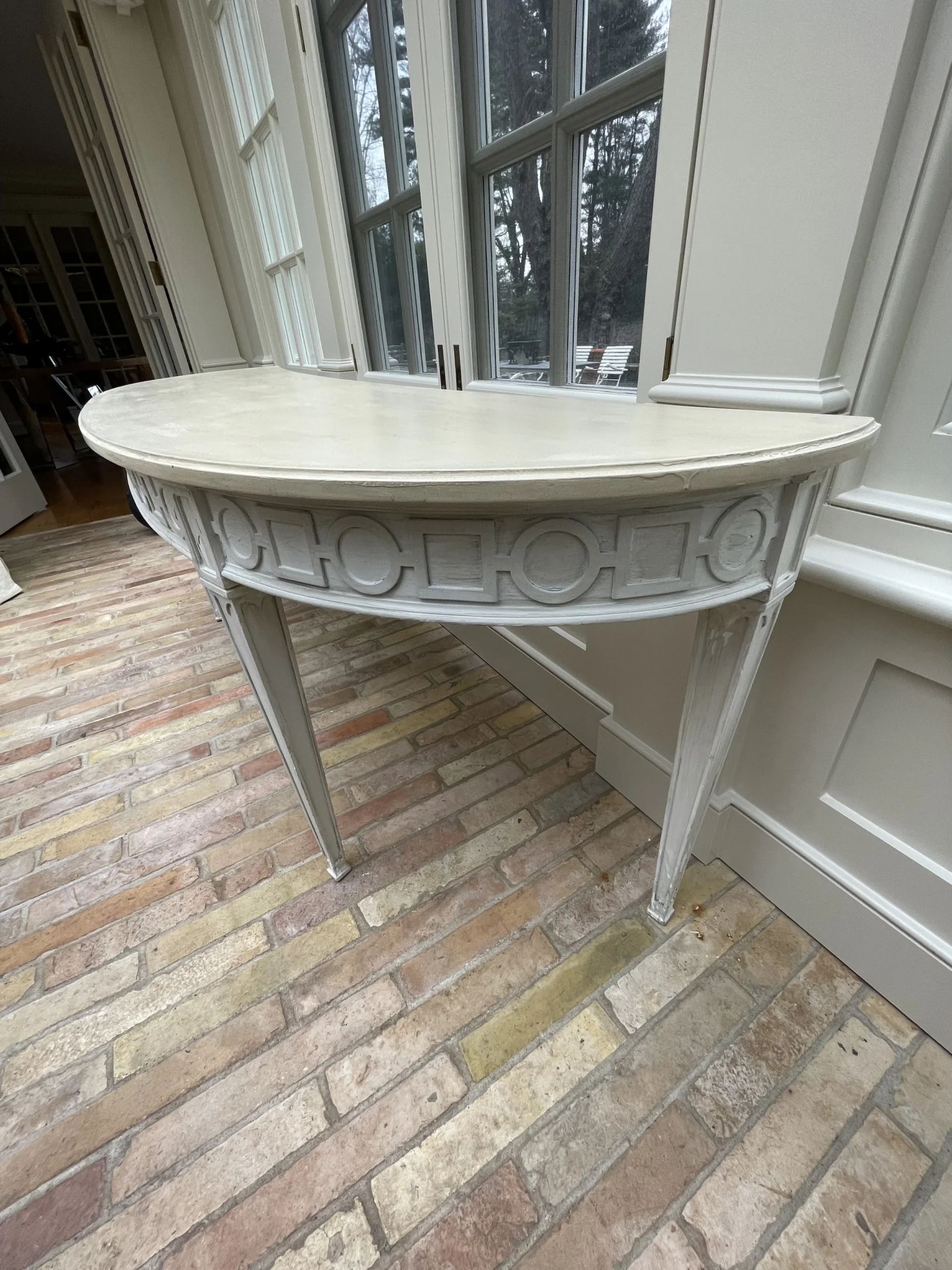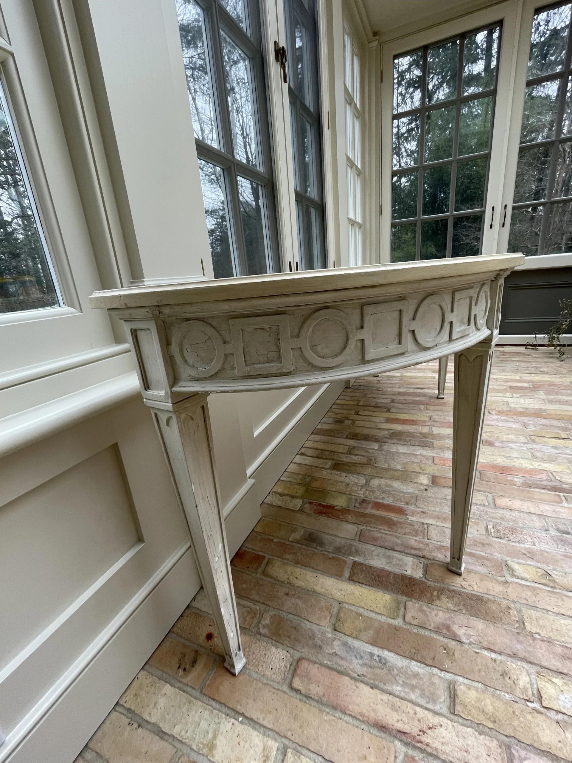 Greige custom made console/sofa table with tapered legs and circle/square carved chain. This piece was made particularly to fit behind …