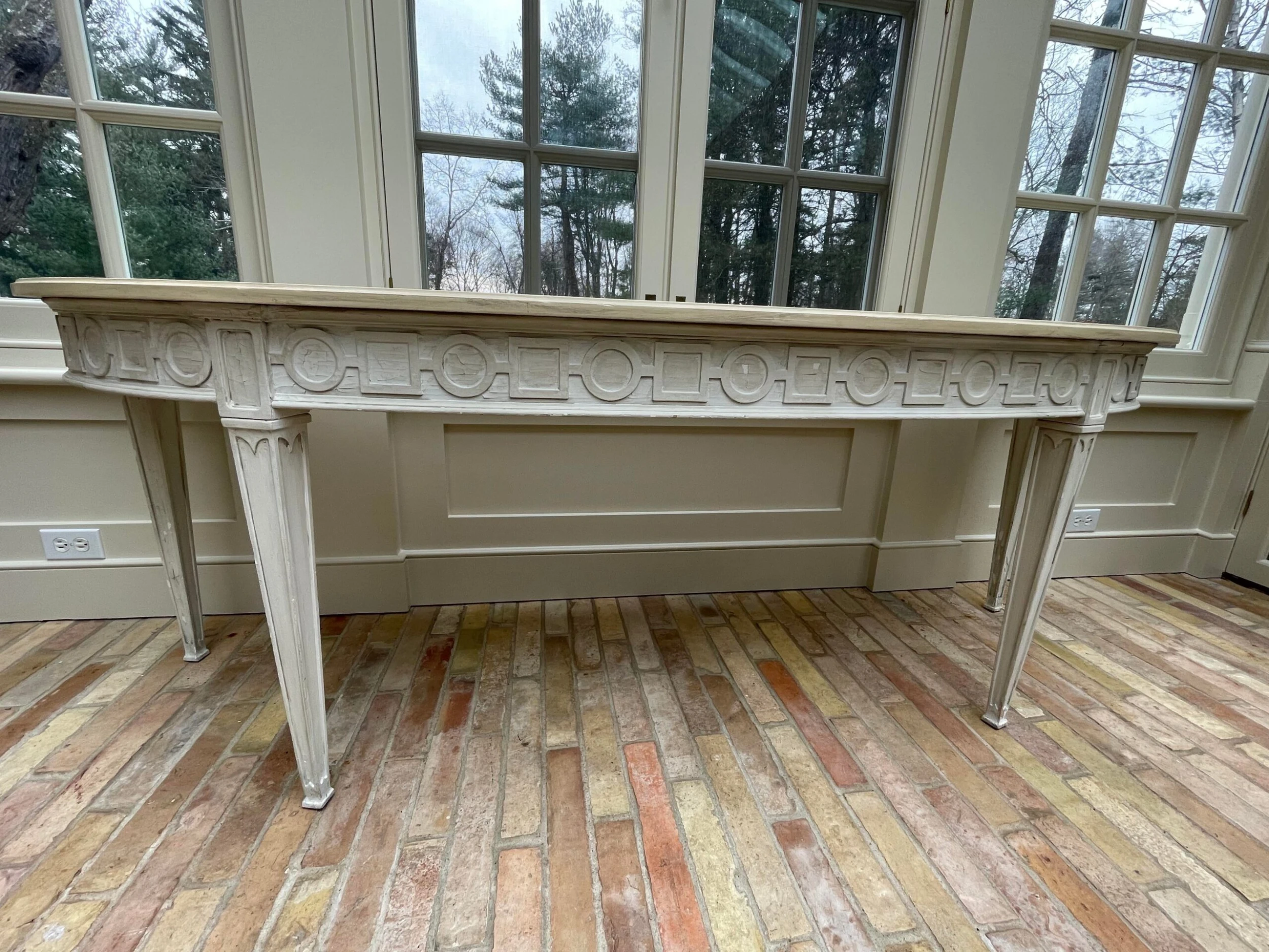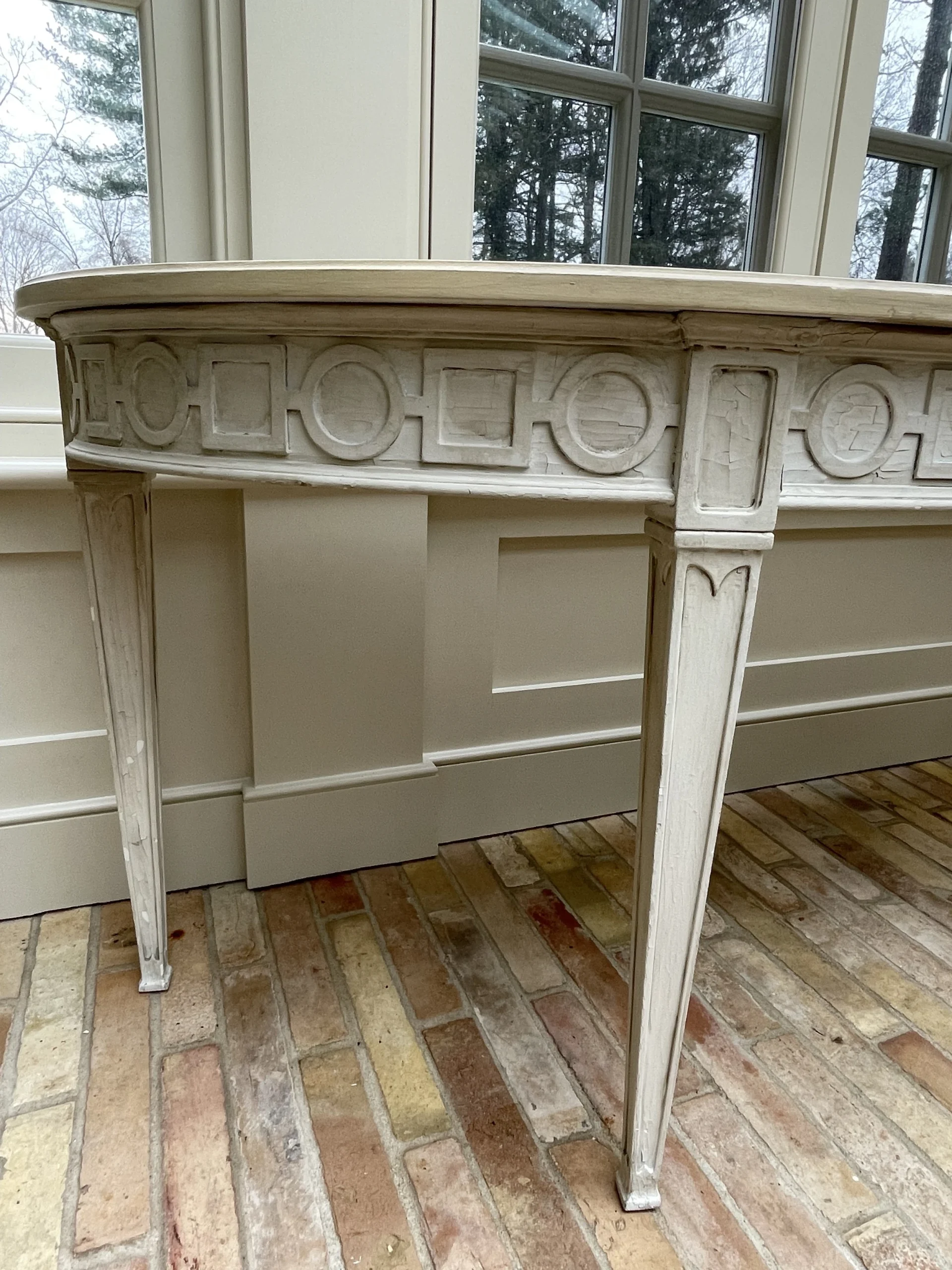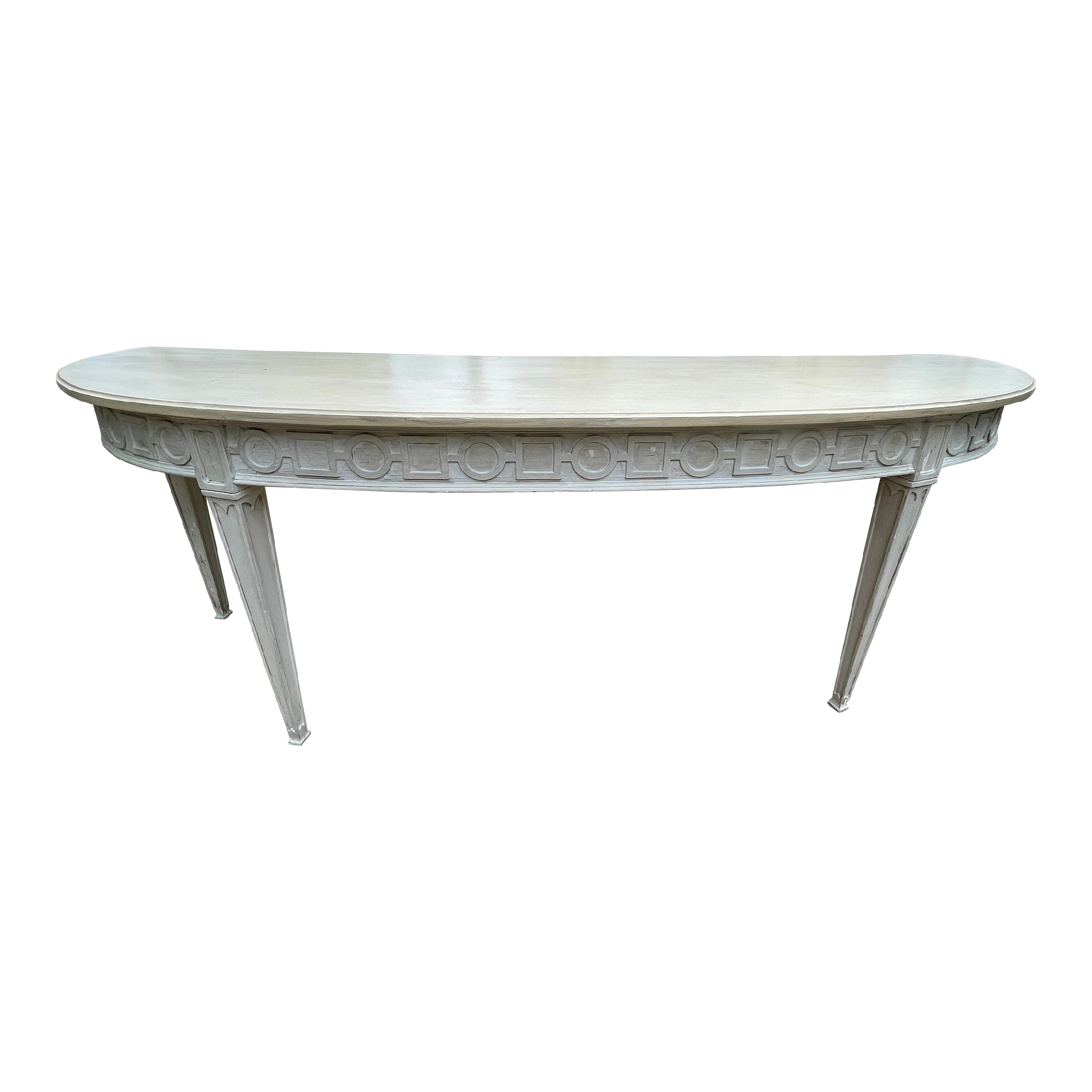 Greige custom made console/sofa table with tapered legs and circle/square carved chain. This piece was made particularly to fit behind a curved/kidney shaped sofa. Continental Italian style.