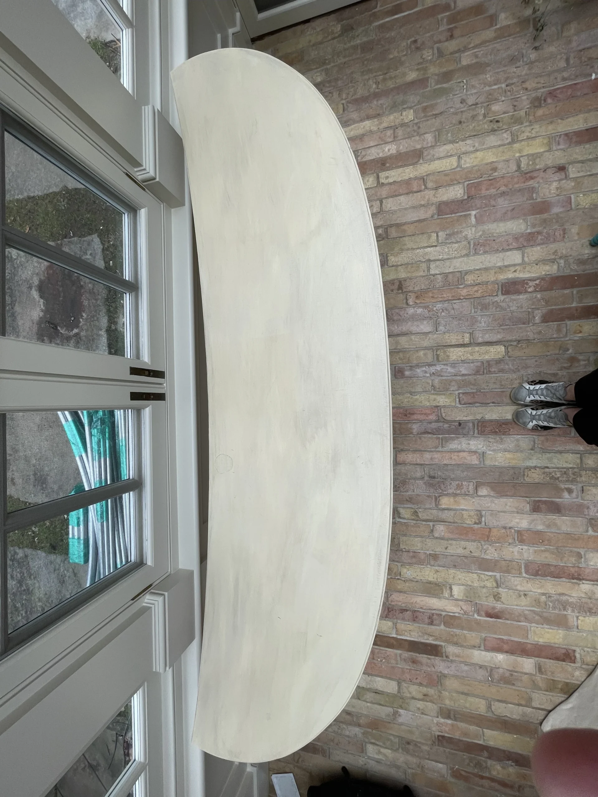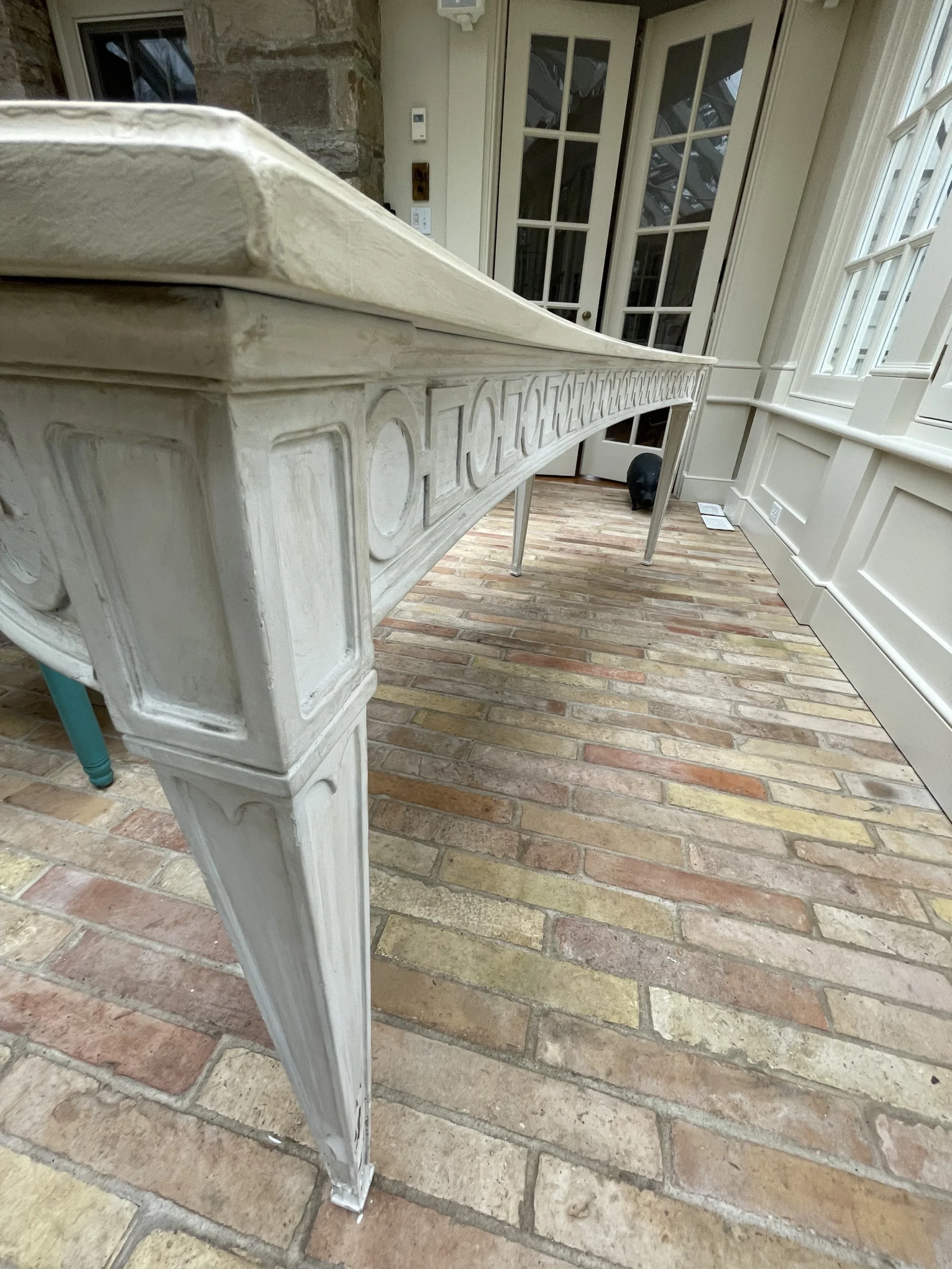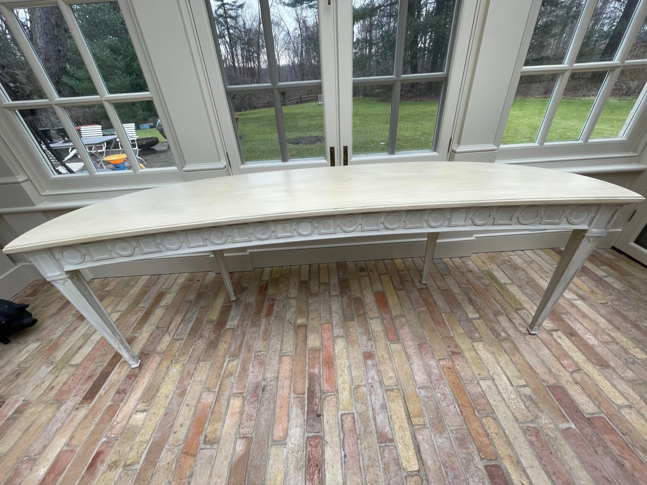 Greige custom made console/sofa table with tapered legs and circle/square carved chain. This piece was made particularly to fit behind a curved/kidney shaped sofa. Continental Italian style.