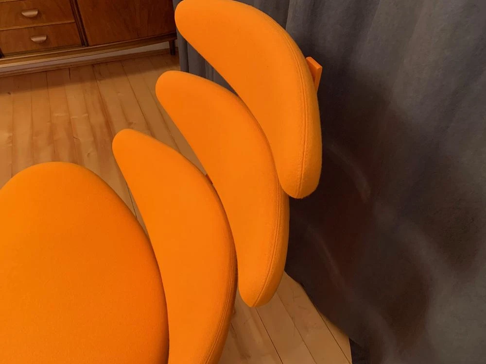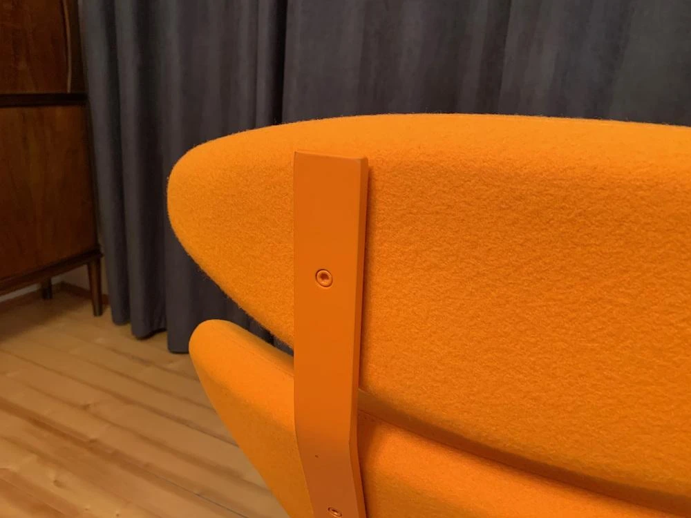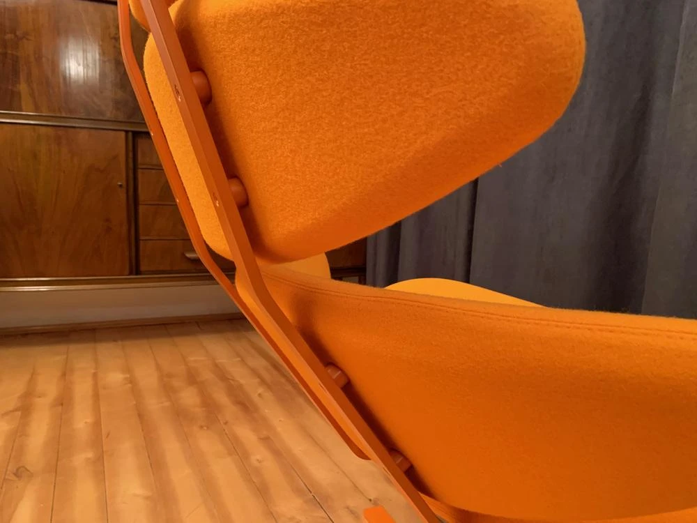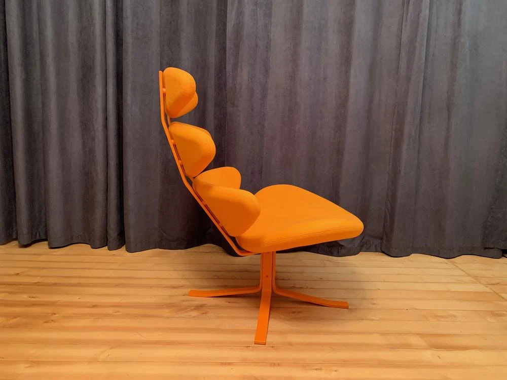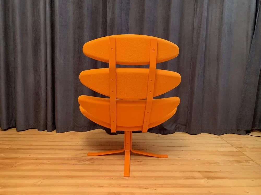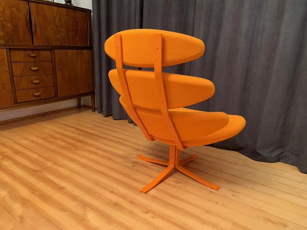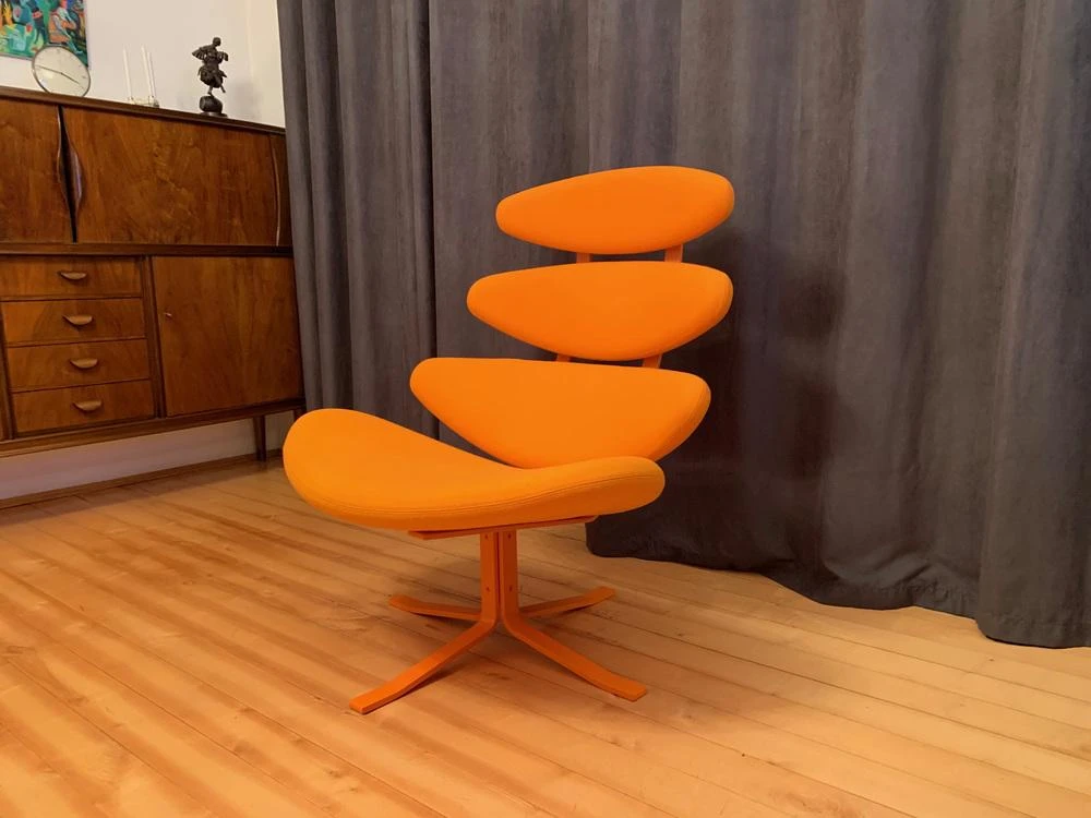 Corona sepctrum swivel armchair model ej 5-s, designed by poul m. Volther for erik jørgensen. In original , very good , almost perfect condition . The corona armchair is a design by poul m. Volther from 1964. The armchair achieved a global success quite late, because it was only in 1997 at the furniture fair in cologne. The armchair has achieved iconic status and is erik jørgensen’s most recognizable product. Excellent workmanship in steel and kvadrat fabric. The color of the chair is pearl orange. Very attractive and comfortable style. The armchair is signed and fully original. This piece has an attribution mark,