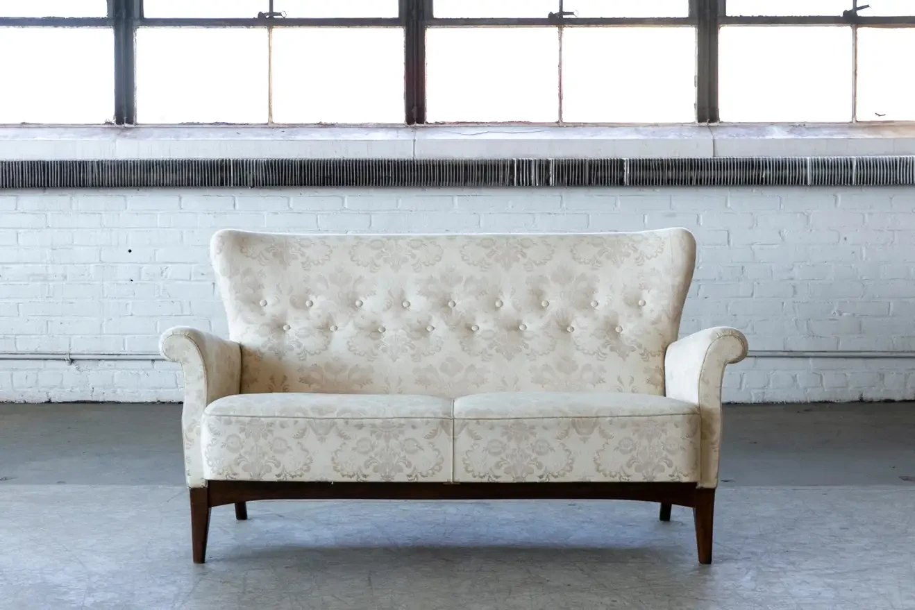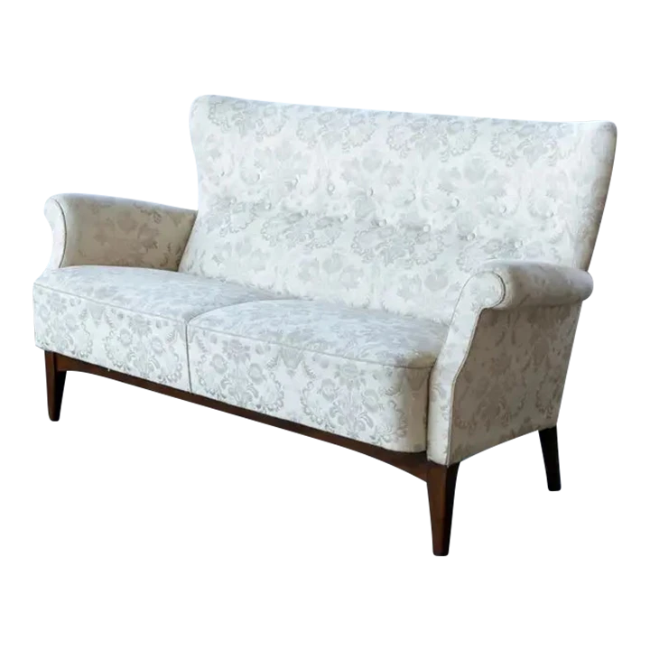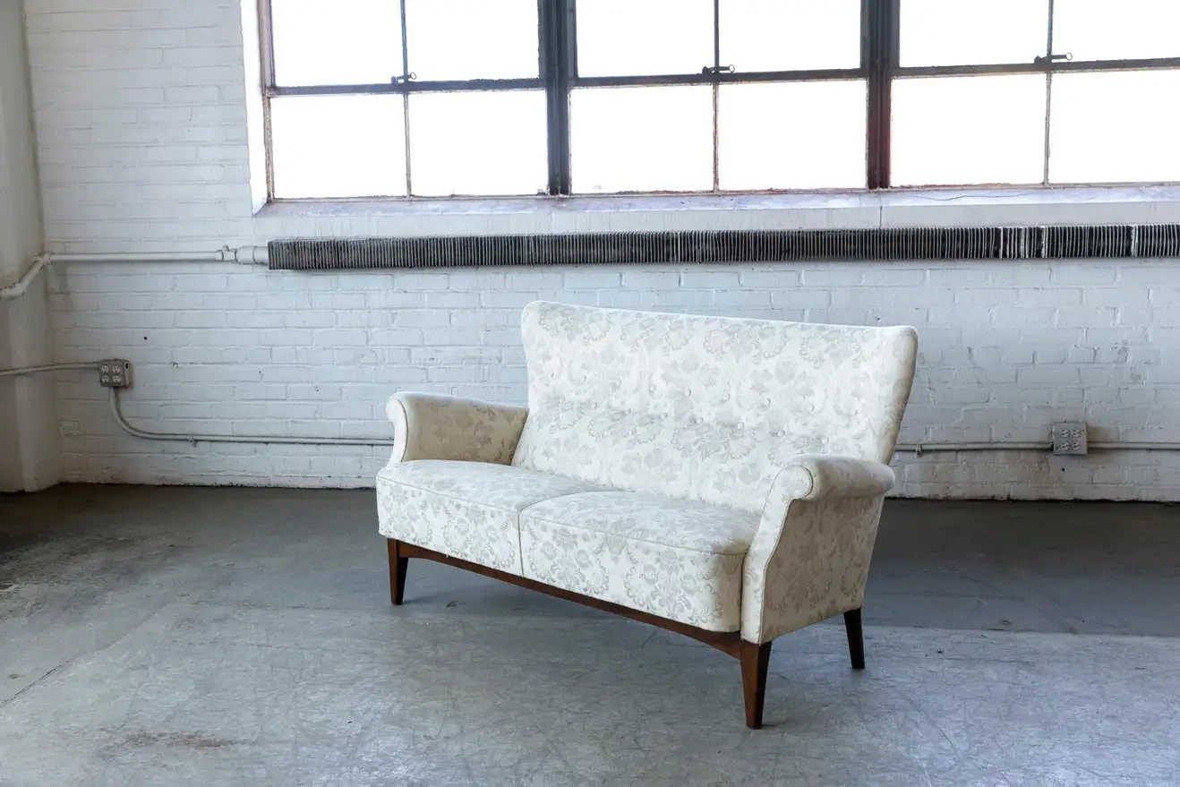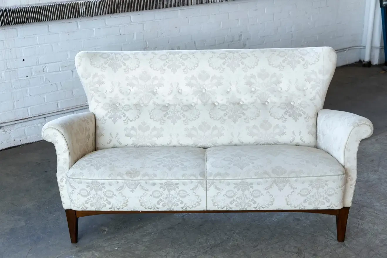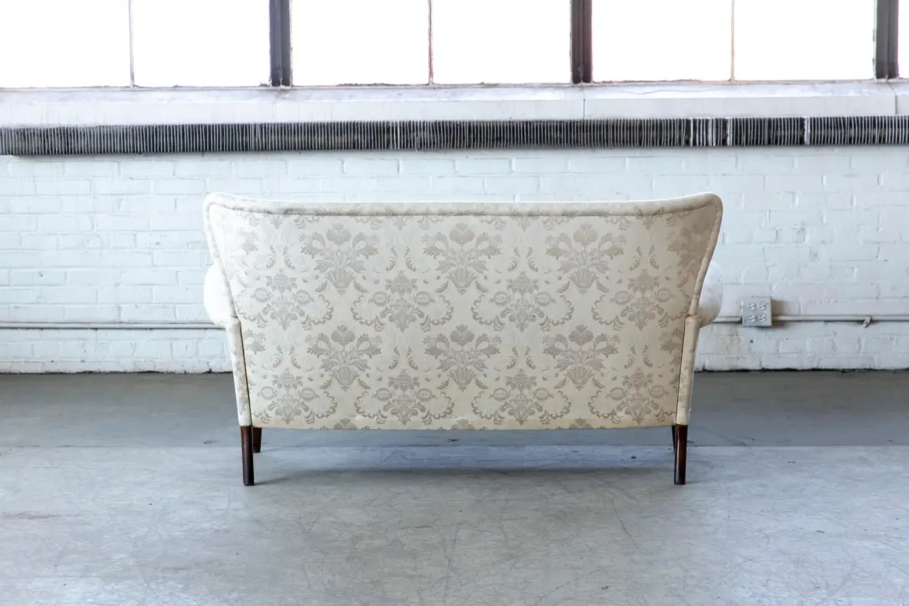 Very elegant settee or two-seat sofa model 8112 made by Fritz Hansen sometime in the early to mid-1950s in Copenhagen, Denmark. The frame is construed similar to Fritz Hansen’s armchairs of the 1940s allowing it to be disassembled without use of tools. It has the stamp of the manufacturer “FH” underneath on the frame. The sofa is sturdy and in overall very good condition. The fabric shows wear and needs to be replaced.