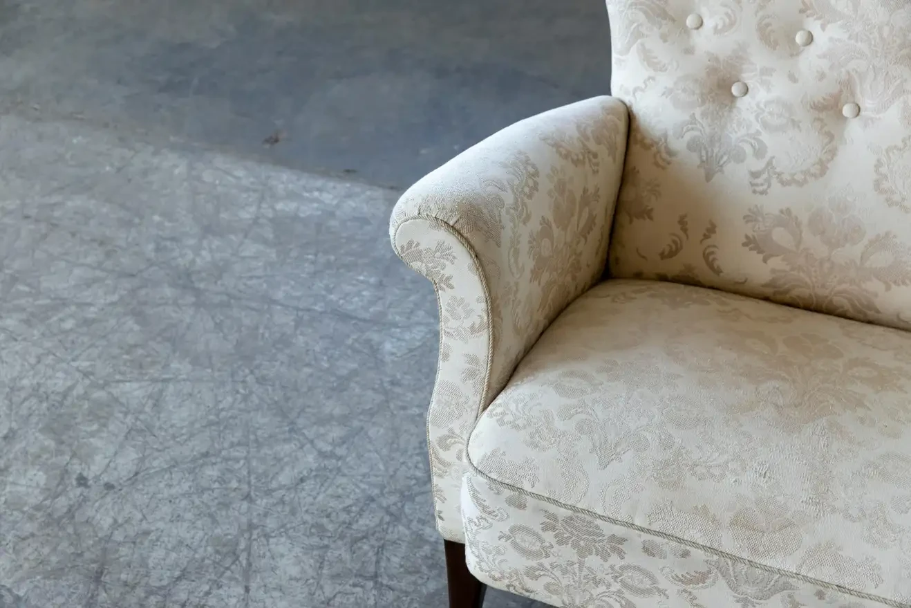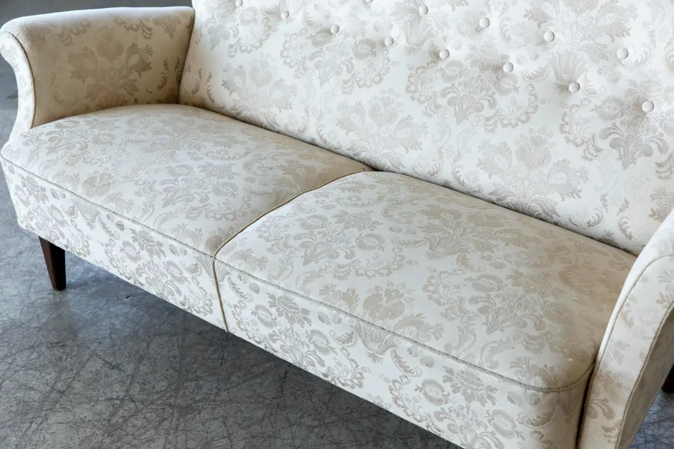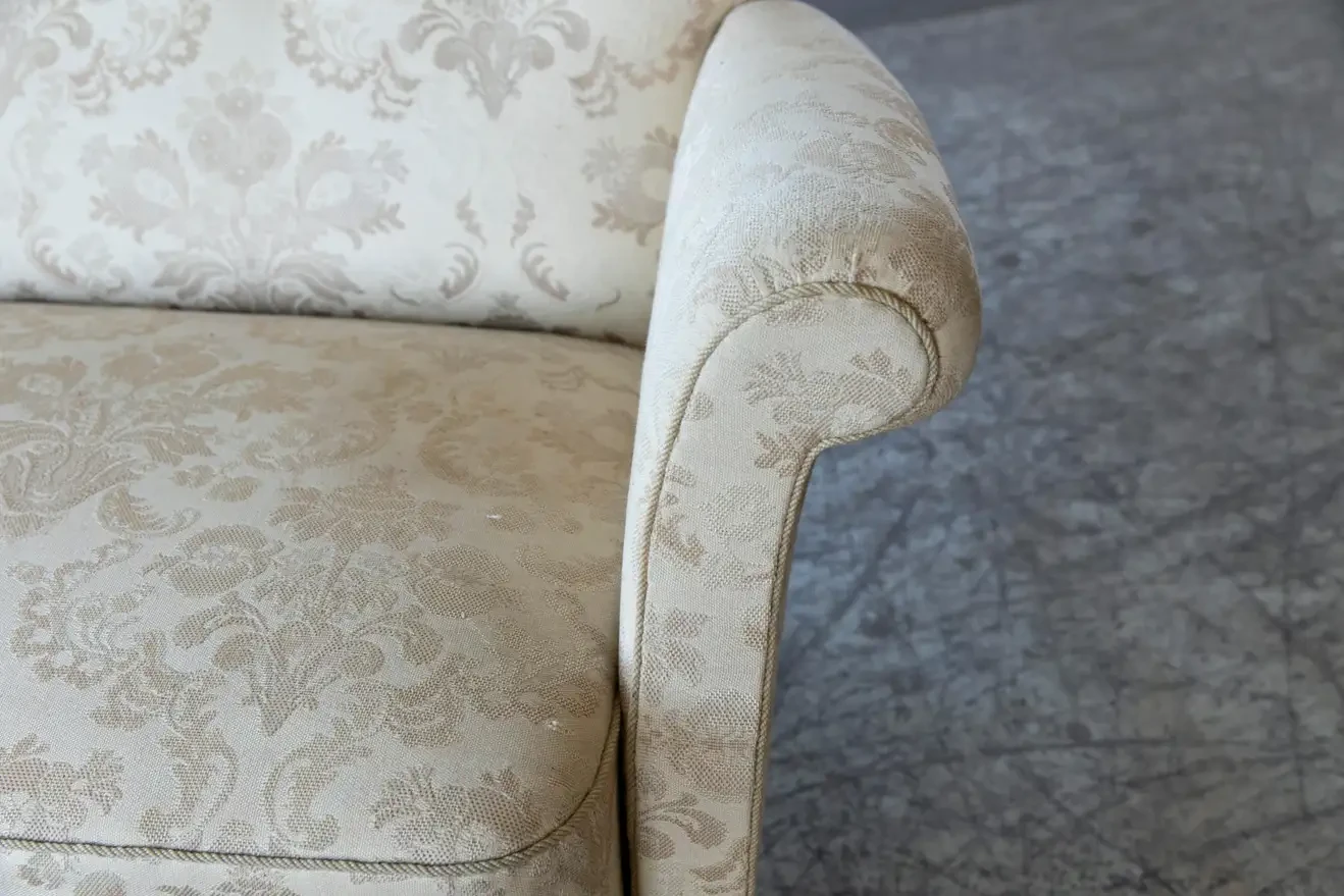 The sofa is sturdy and in overall very good condition. The fabric shows wear and needs to be replaced.