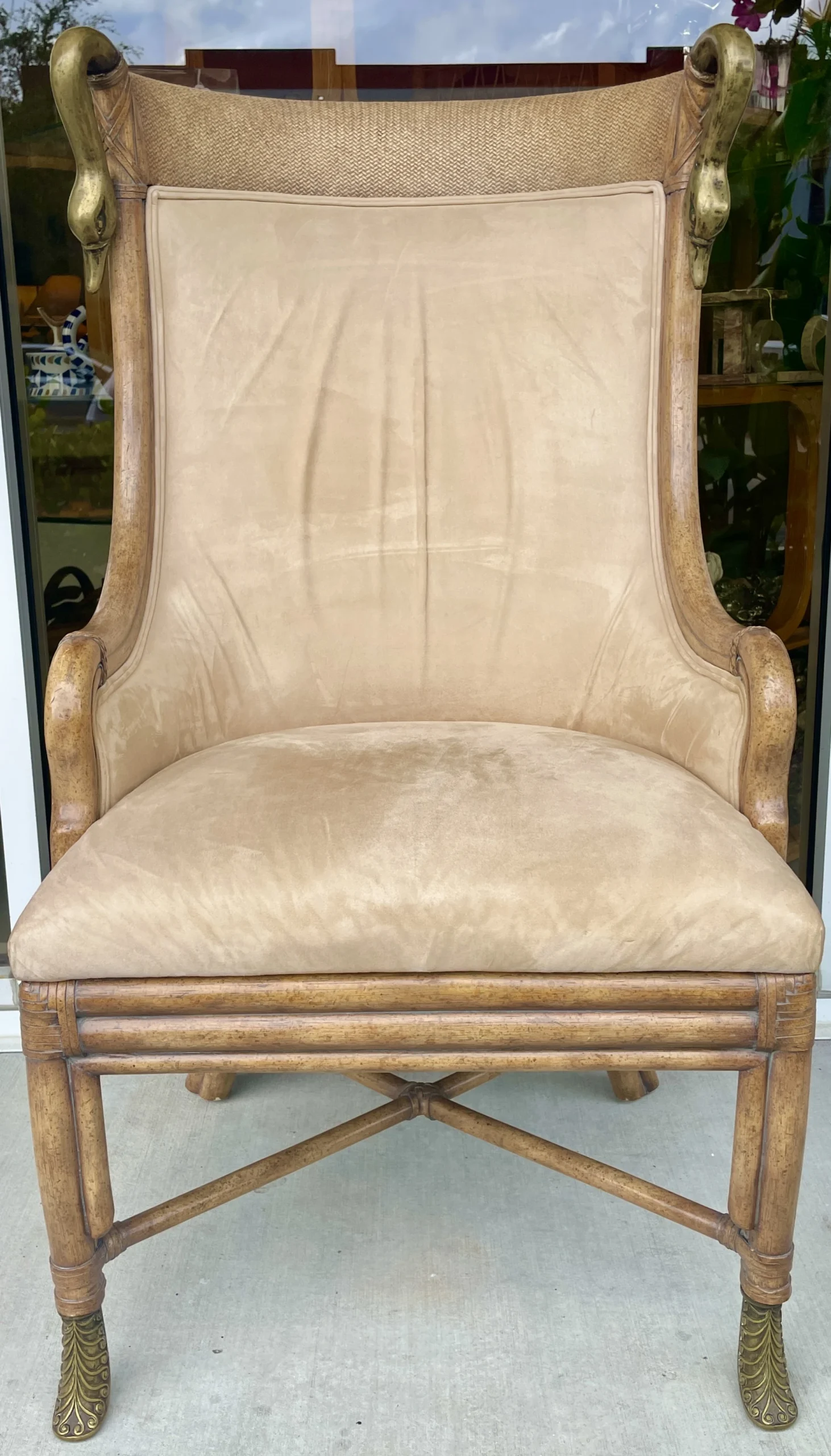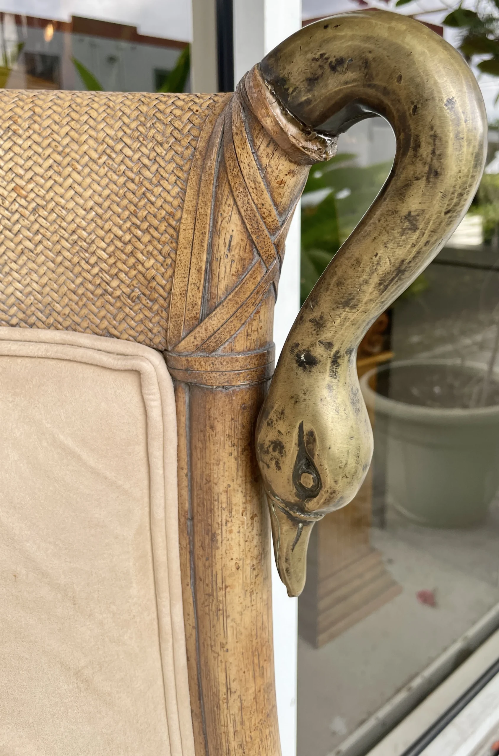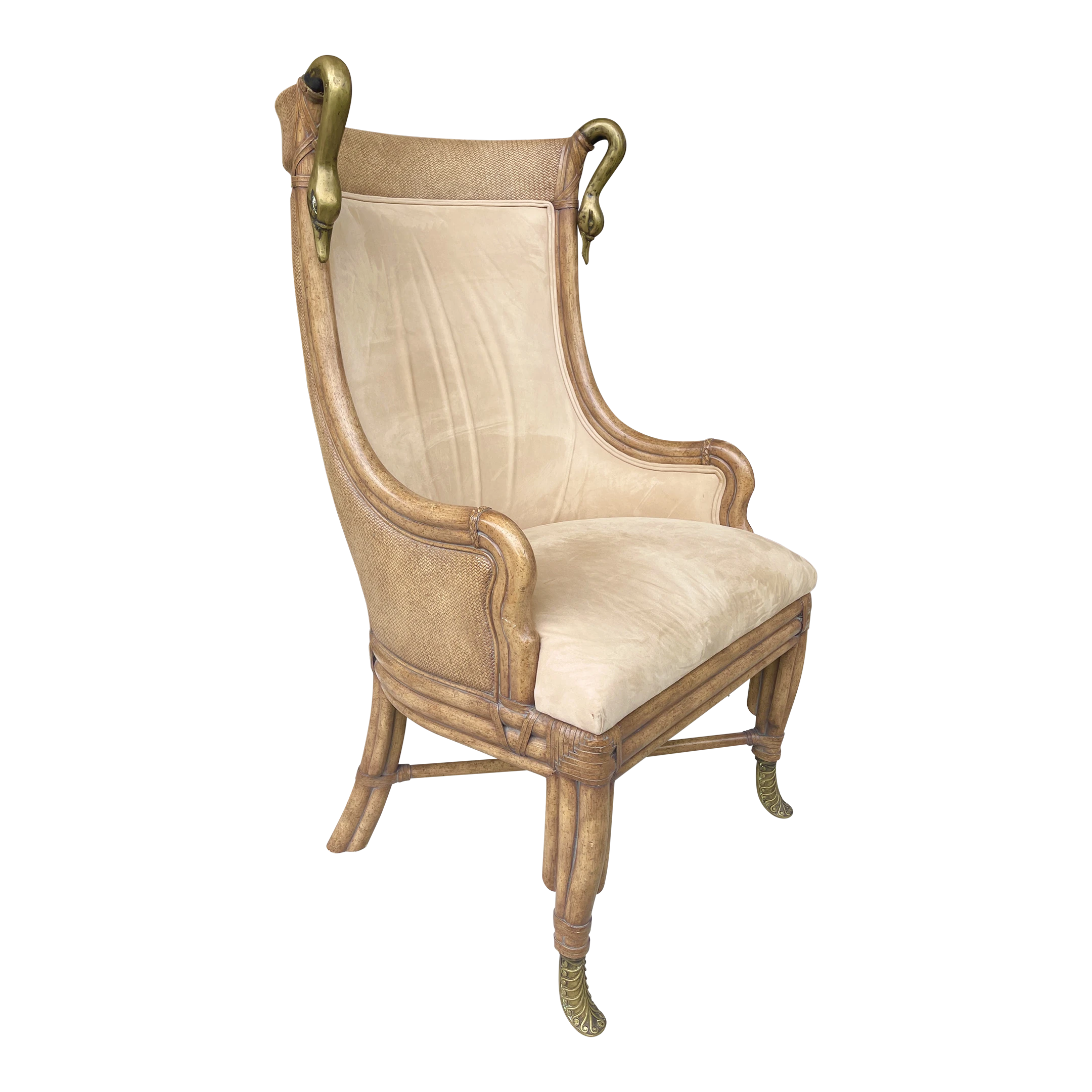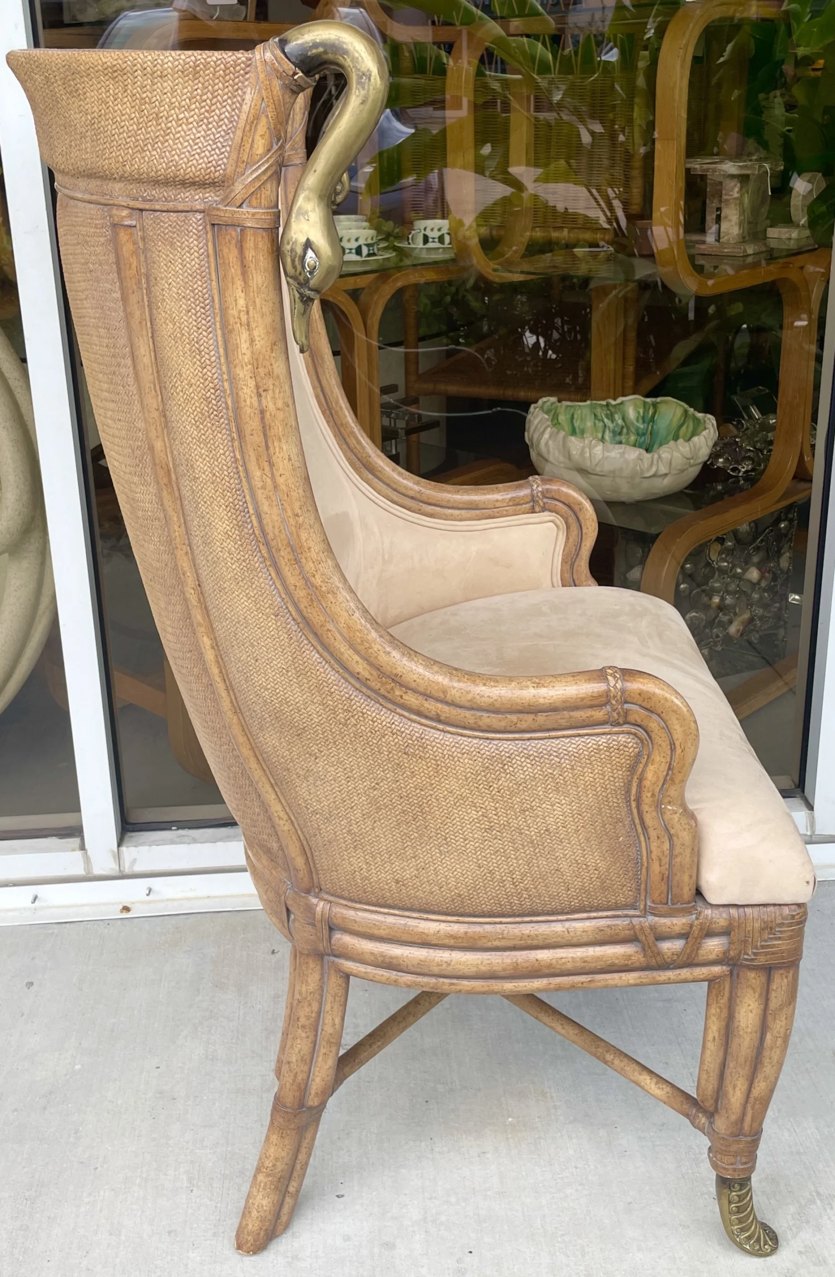 Elegant Empire Style revival wingback chair by Kreiss Collection. Incredibly well made and good quality. Structure is in wood with rattan and leather stripes. Swans and ornate feet are in brass and they show charming patina. Fabric need to be replaced as it has lost its stretch and has few small stains.