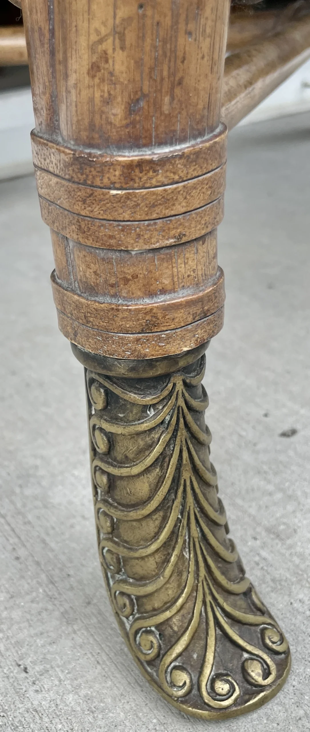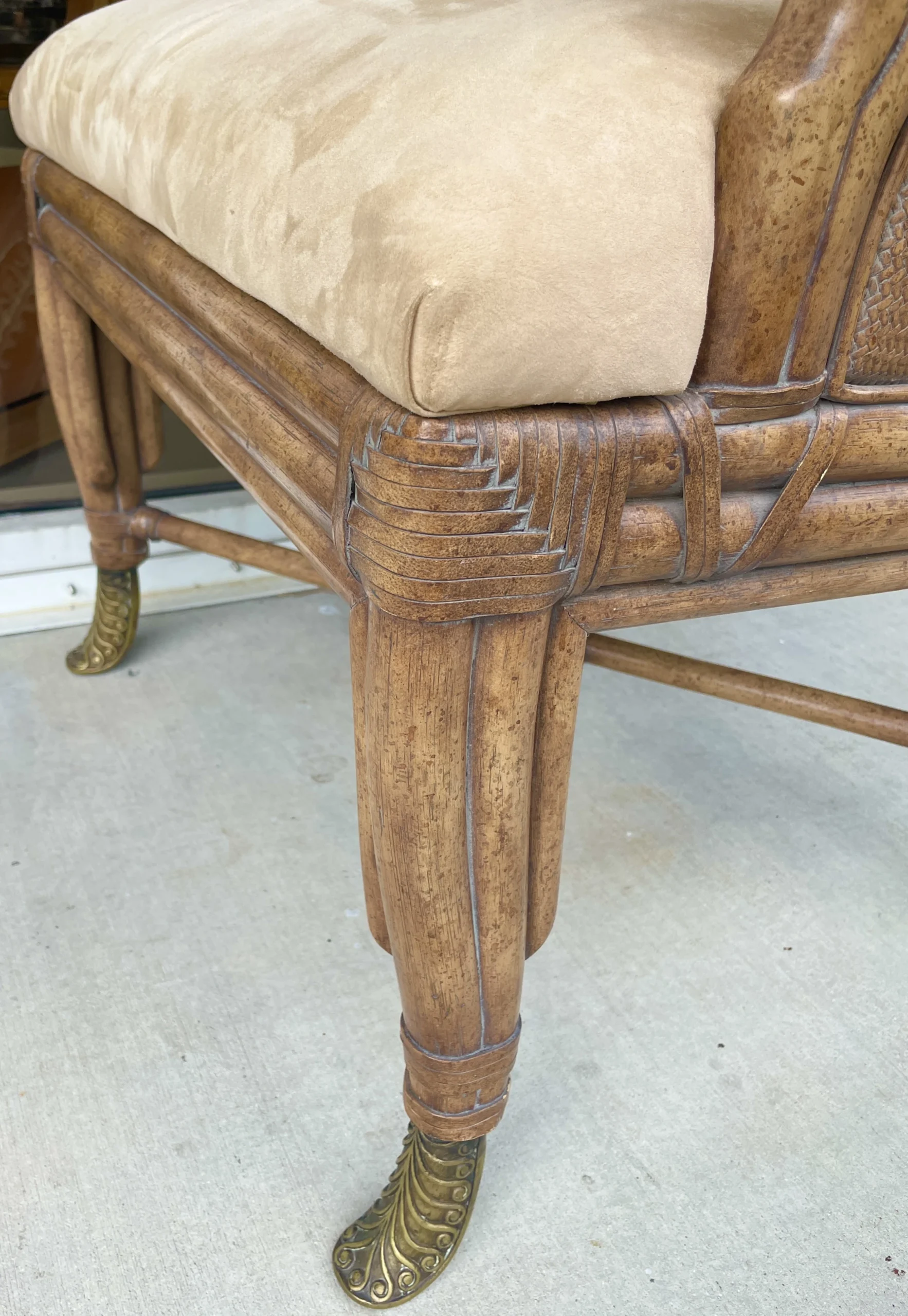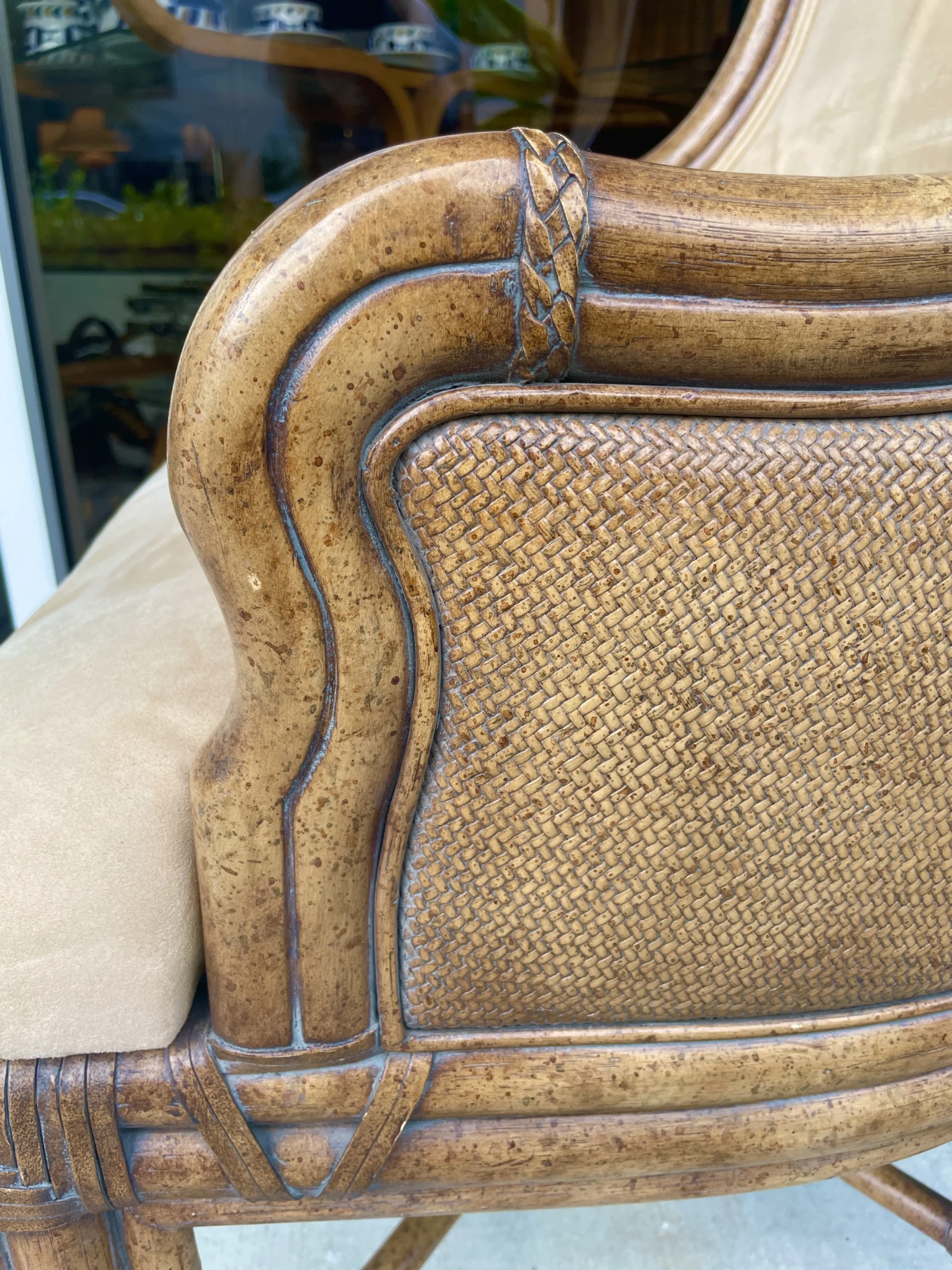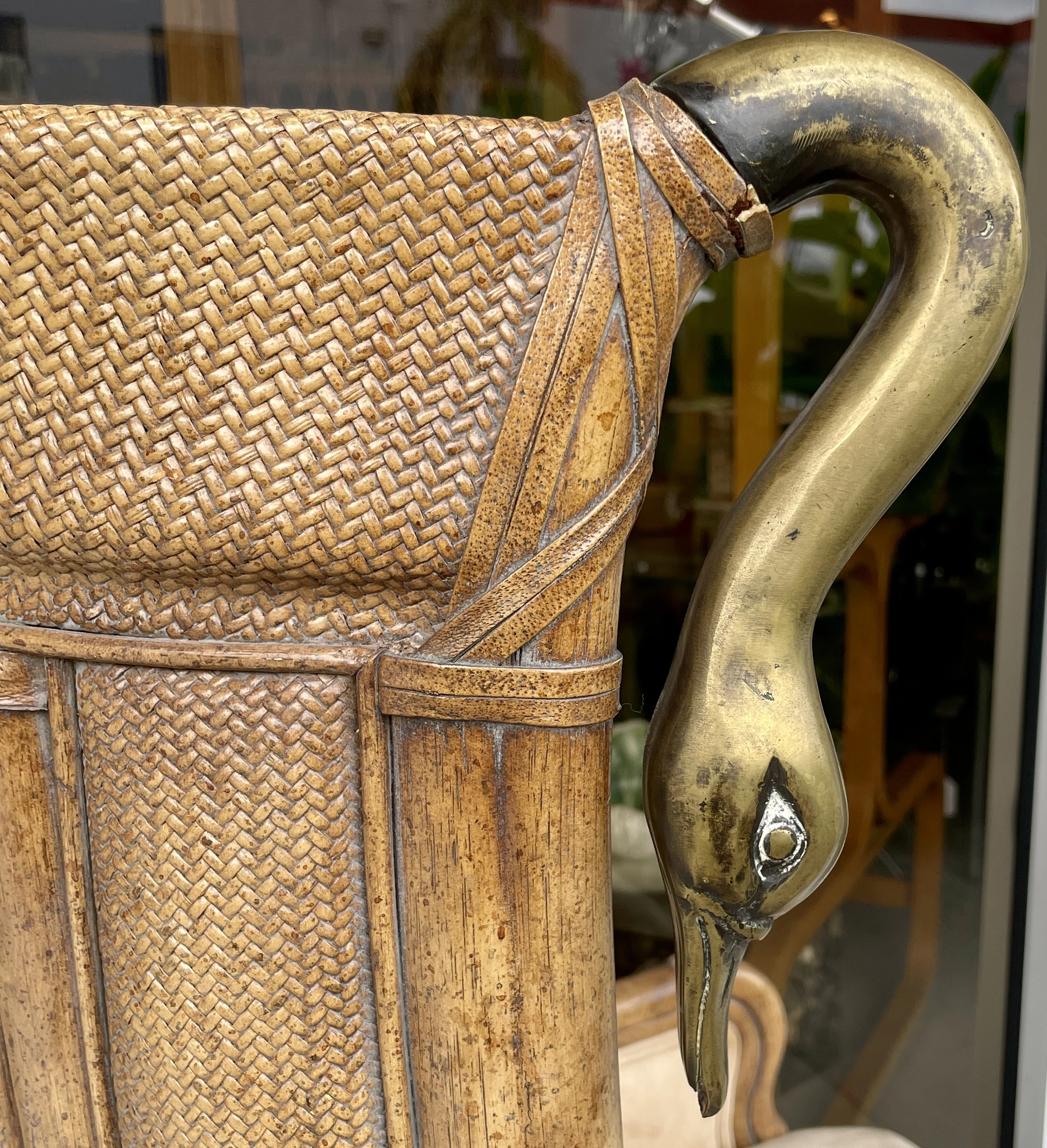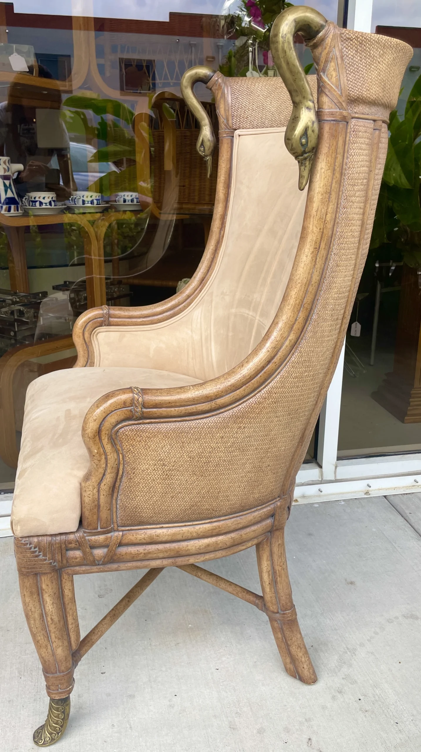 Elegant Empire Style revival wingback chair by Kreiss Collection. Incredibly well made and good quality. Structure is in wood with rattan and leather stripes. Swans and ornate feet are in brass and they show charming patina. Fabric need to be replaced as it has lost its stretch and has few small stains.