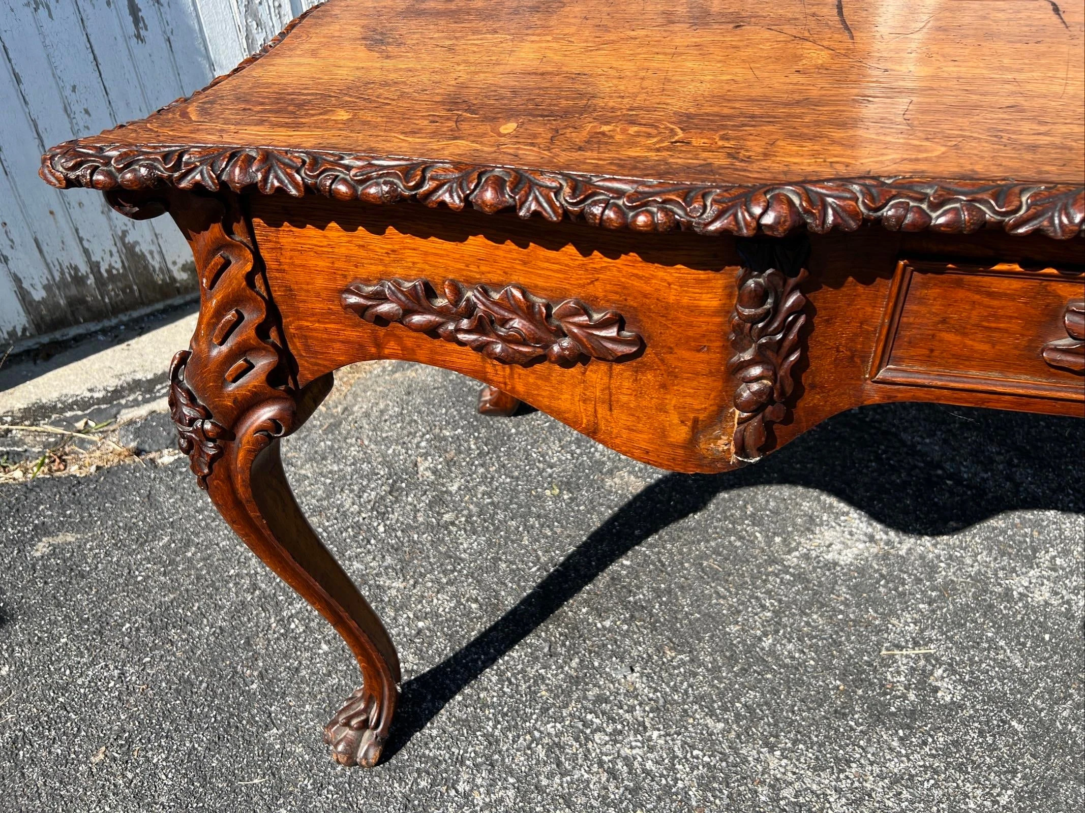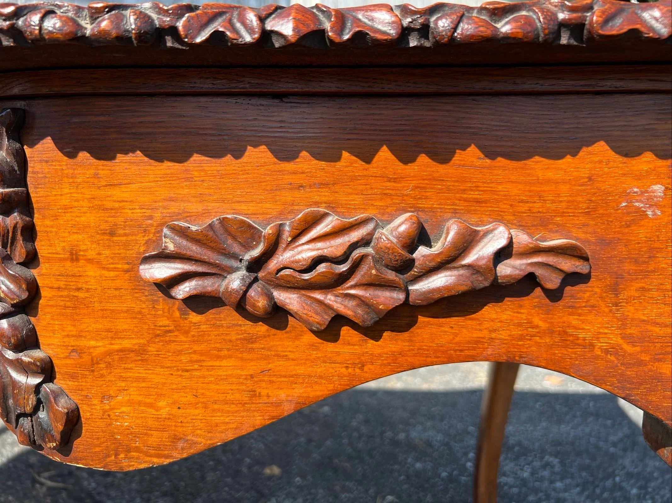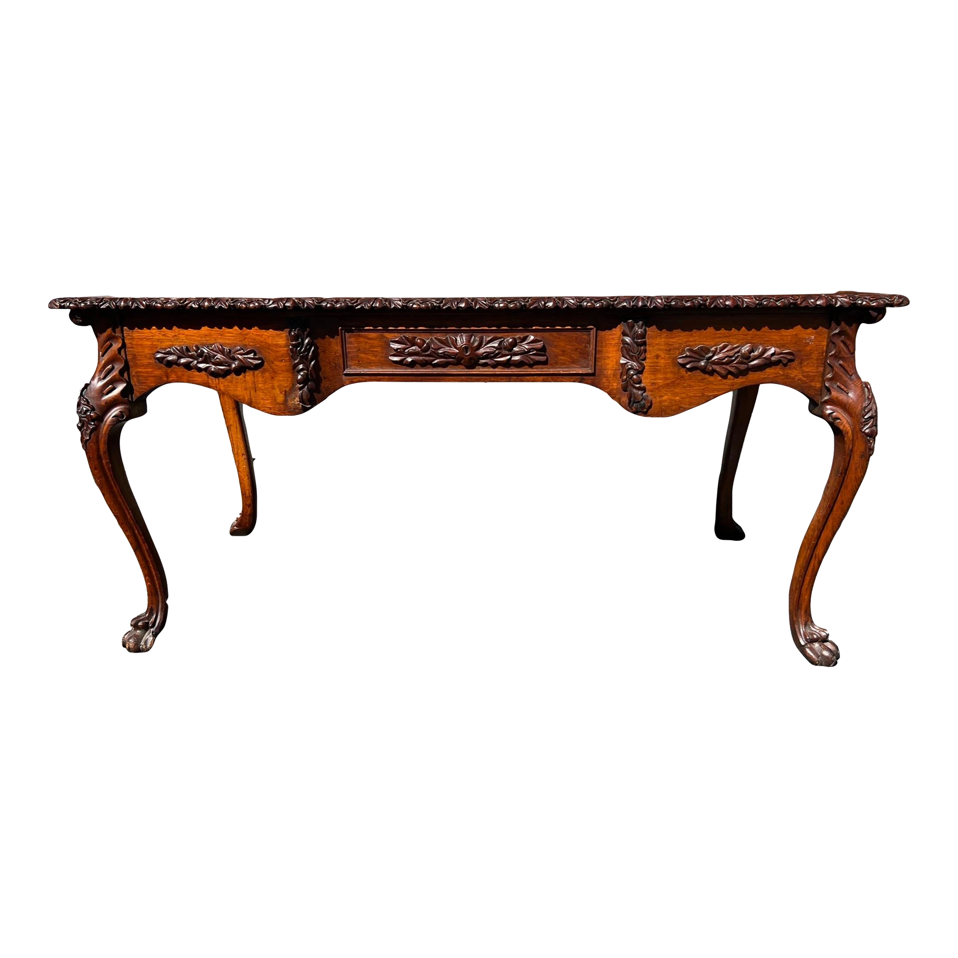 Very nice table, carved acorn and oak leaf motif edge banding around the top, and carved acorn and oak leaf motifs throughout the table, including the drawer handles, and on the leg knees. The cabriole type form legs terminate in carved claw feet. Veneered quarter sawn top over a what appears to me a mahogany or other tropical hardwood substrate. 2 drawers on the ends on the table, the centre does not have drawers. The drawers are dovetailed construction with oak linings. The underside of the table secondary woods are pine and mahogany. Very well designed and crafted table. We absolutely love the carvings. This is a nice piece of furniture, and would make a great addition to a proper study or library.