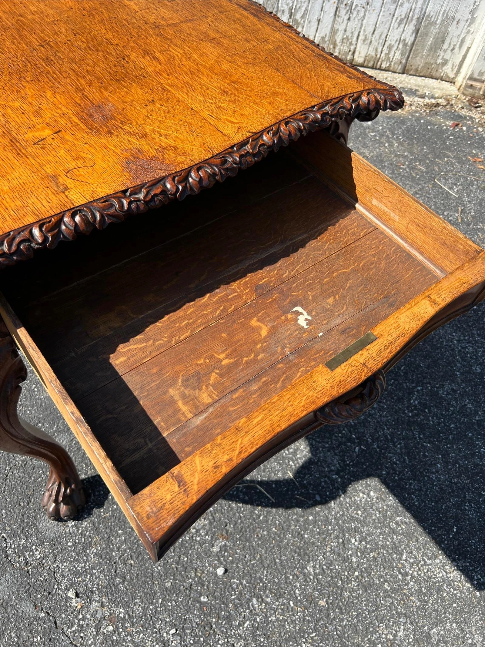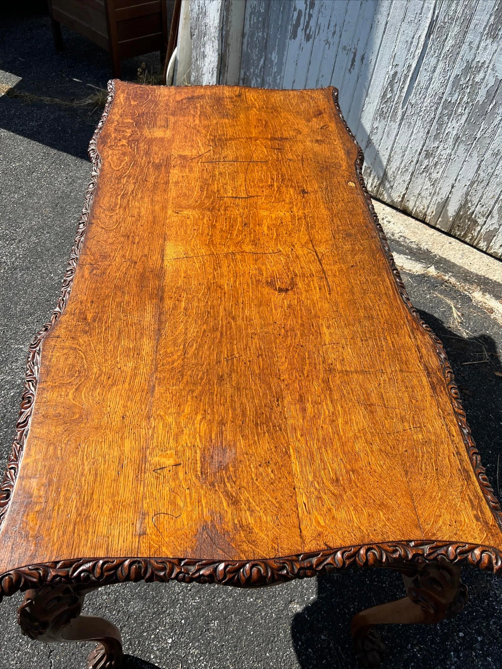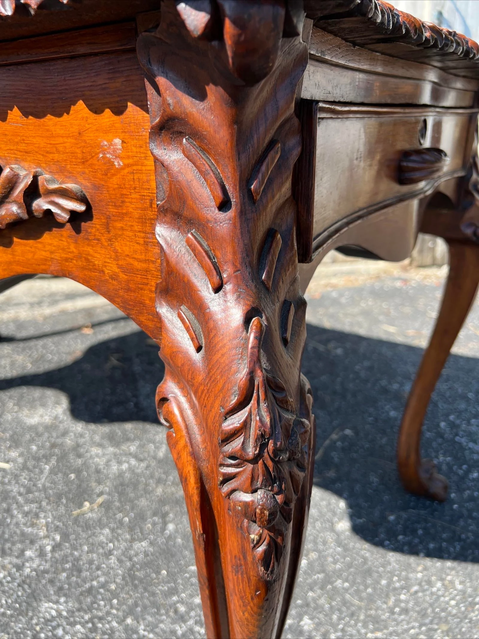 Very nice table, carved acorn and oak leaf motif edge banding around the top, and carved acorn and oak leaf motifs throughout the table, including the drawer handles, and on the leg knees. The cabriole type form legs terminate in carved claw feet. Veneered quarter sawn top over a what appears to me a mahogany or other tropical hardwood substrate. 2 drawers on the ends on the table, the centre does not have drawers. The drawers are dovetailed construction with oak linings. The underside of the table secondary woods are pine and mahogany. Very well designed and crafted table. We absolutely love the carvings. This is a nice piece of furniture, and would make a great addition to a proper study or library.