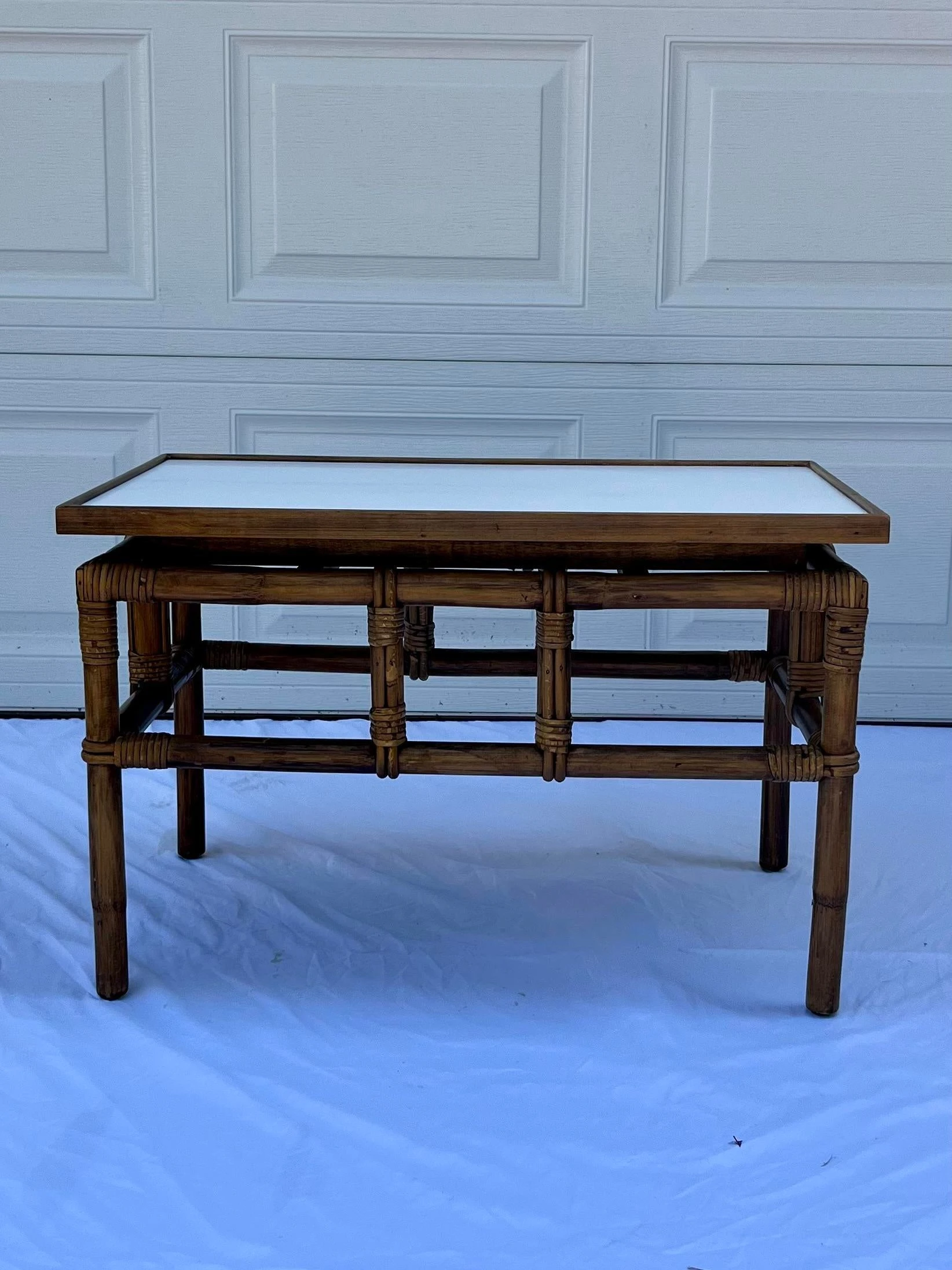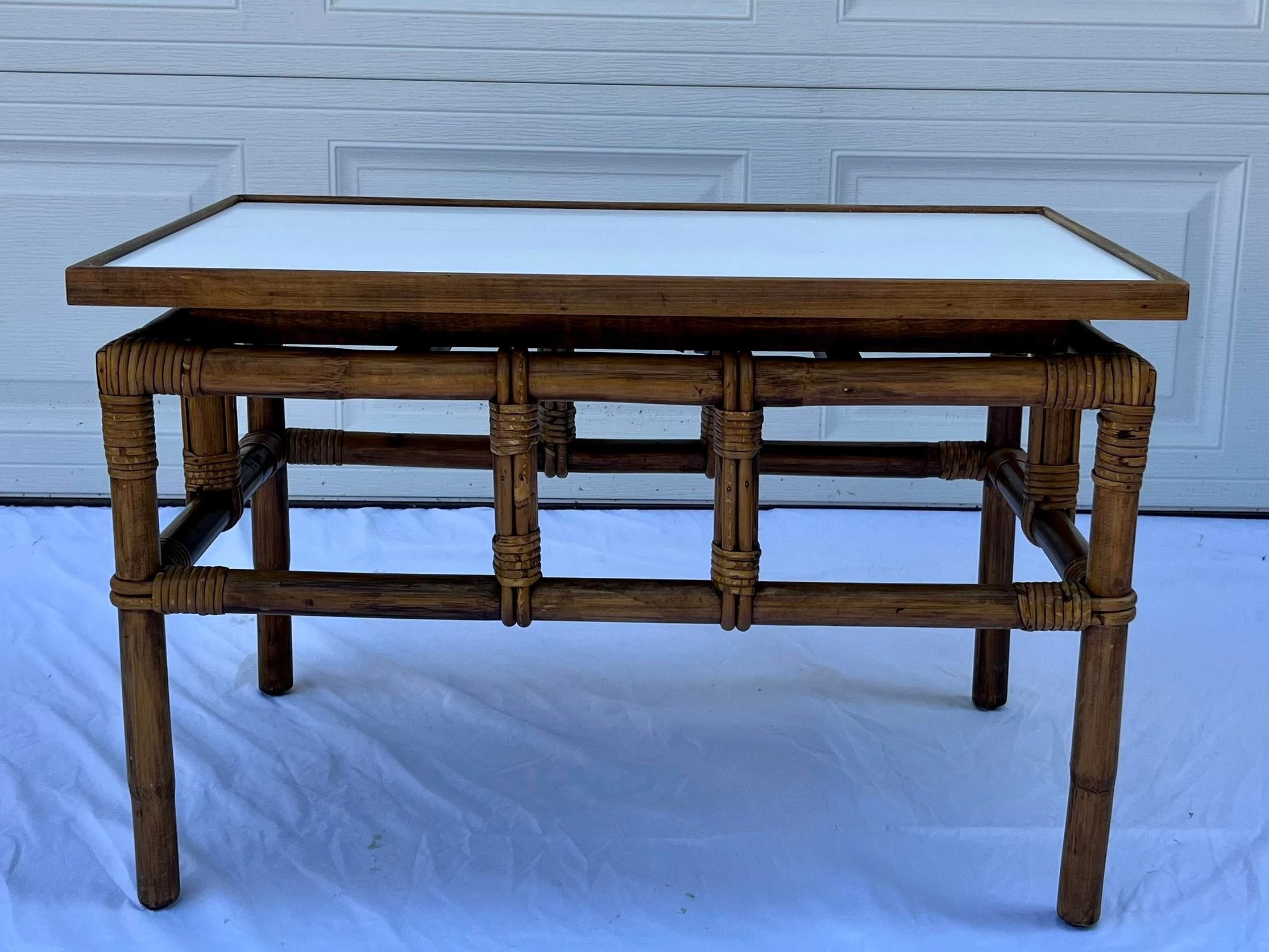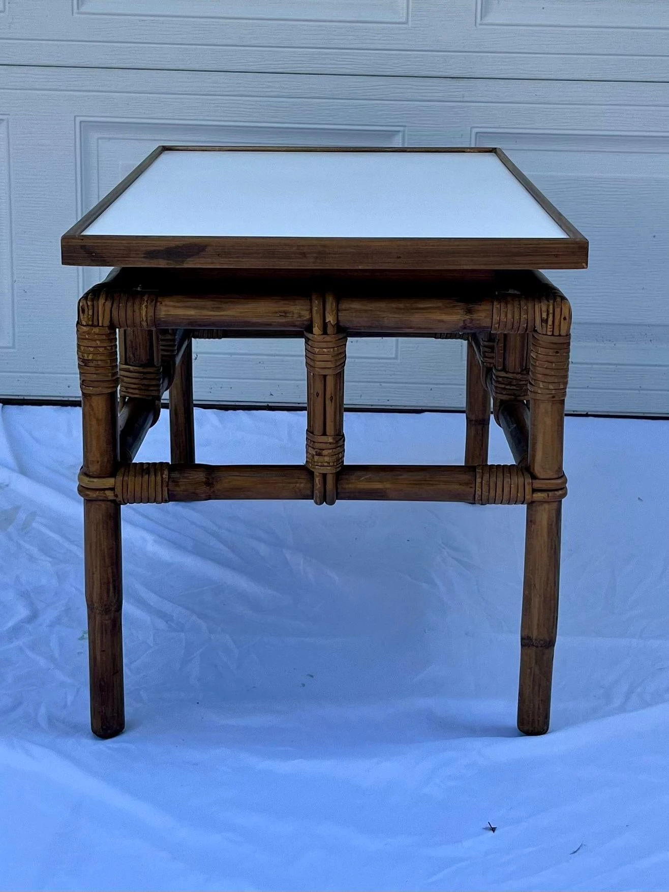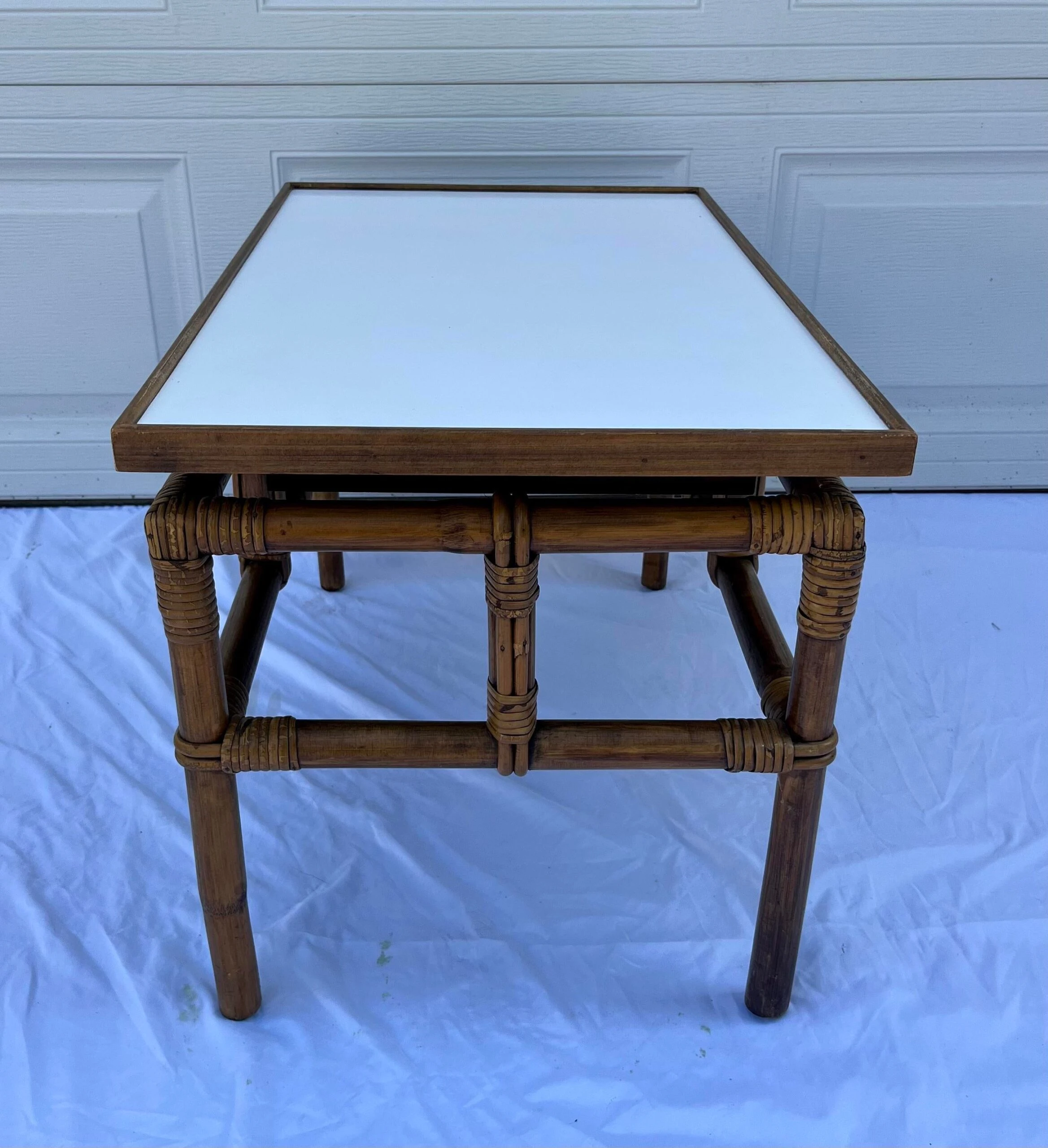 Awesome vintage rattan Campaign Style Ficks Reed Far Horizons Collection end table with white formica top. It is designed with …