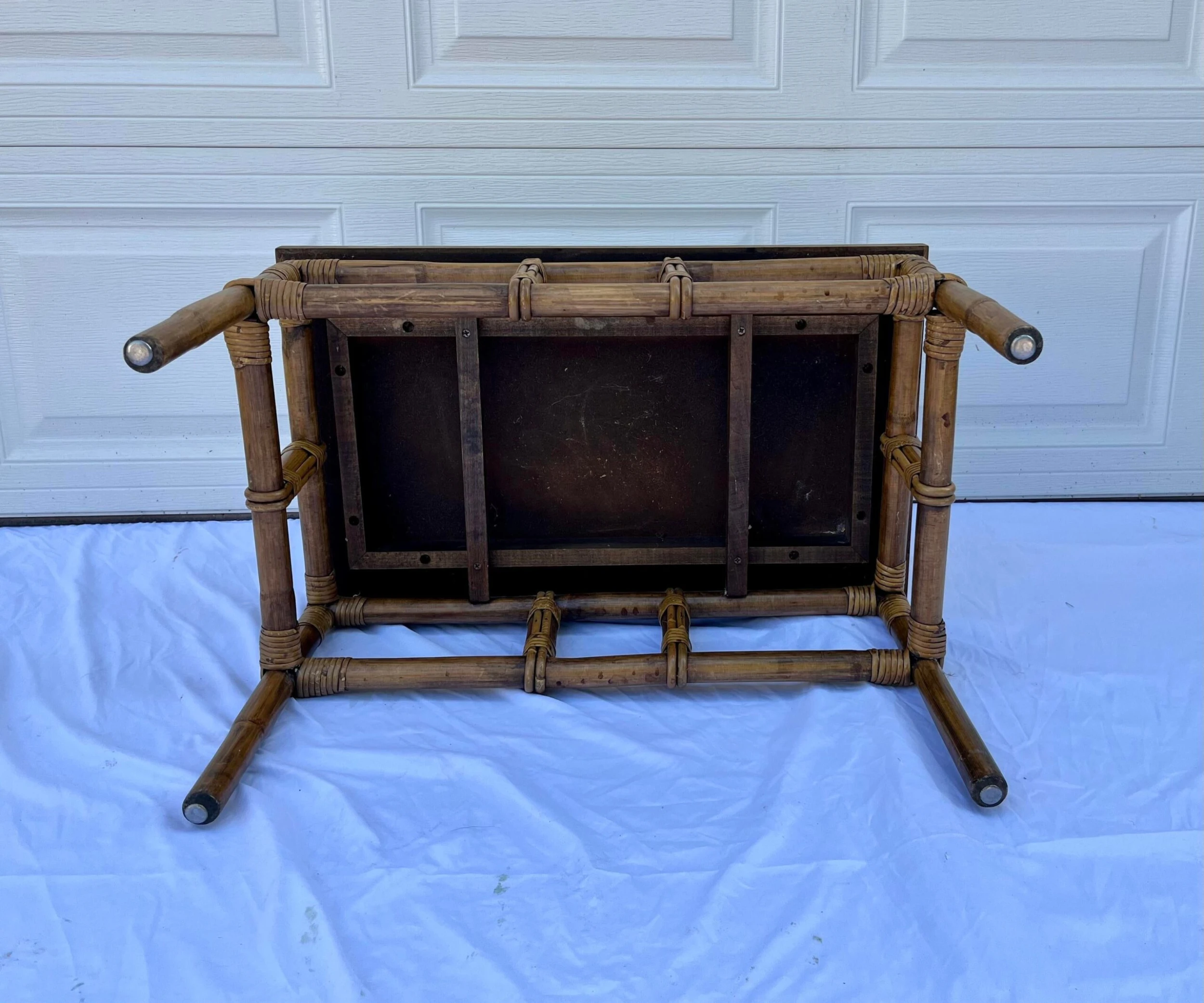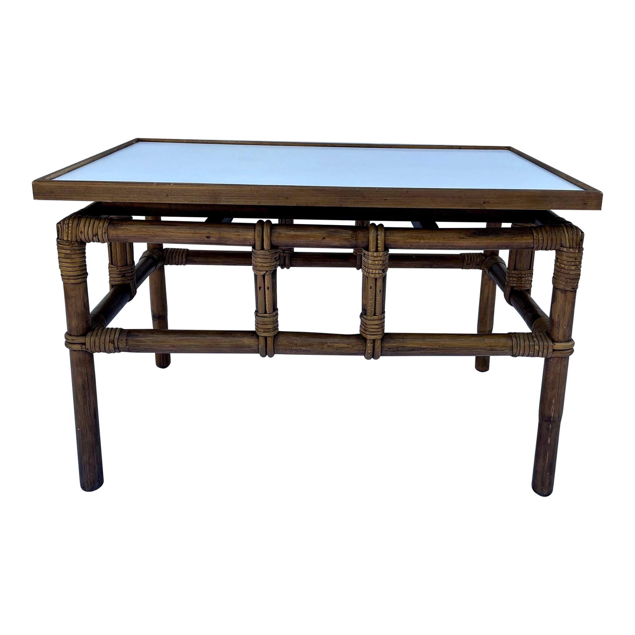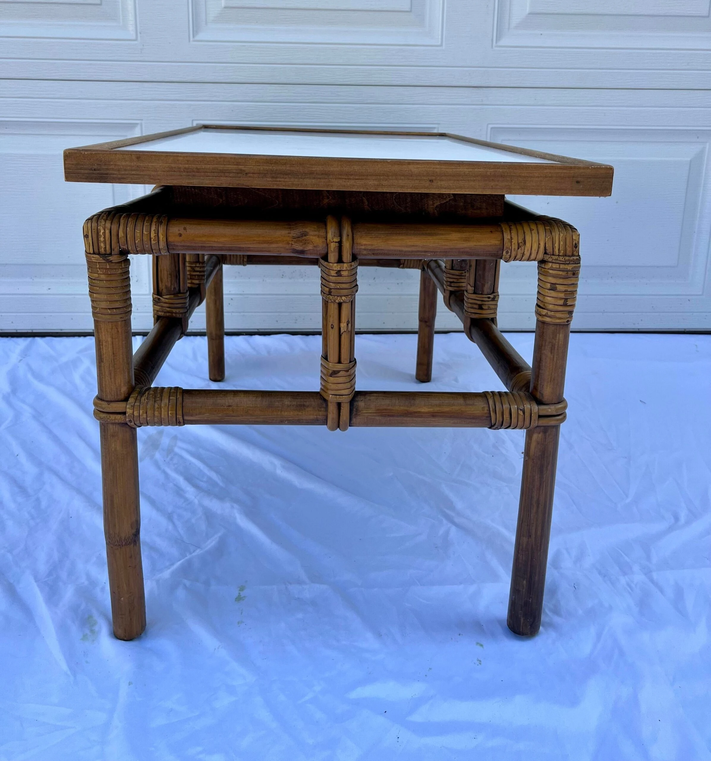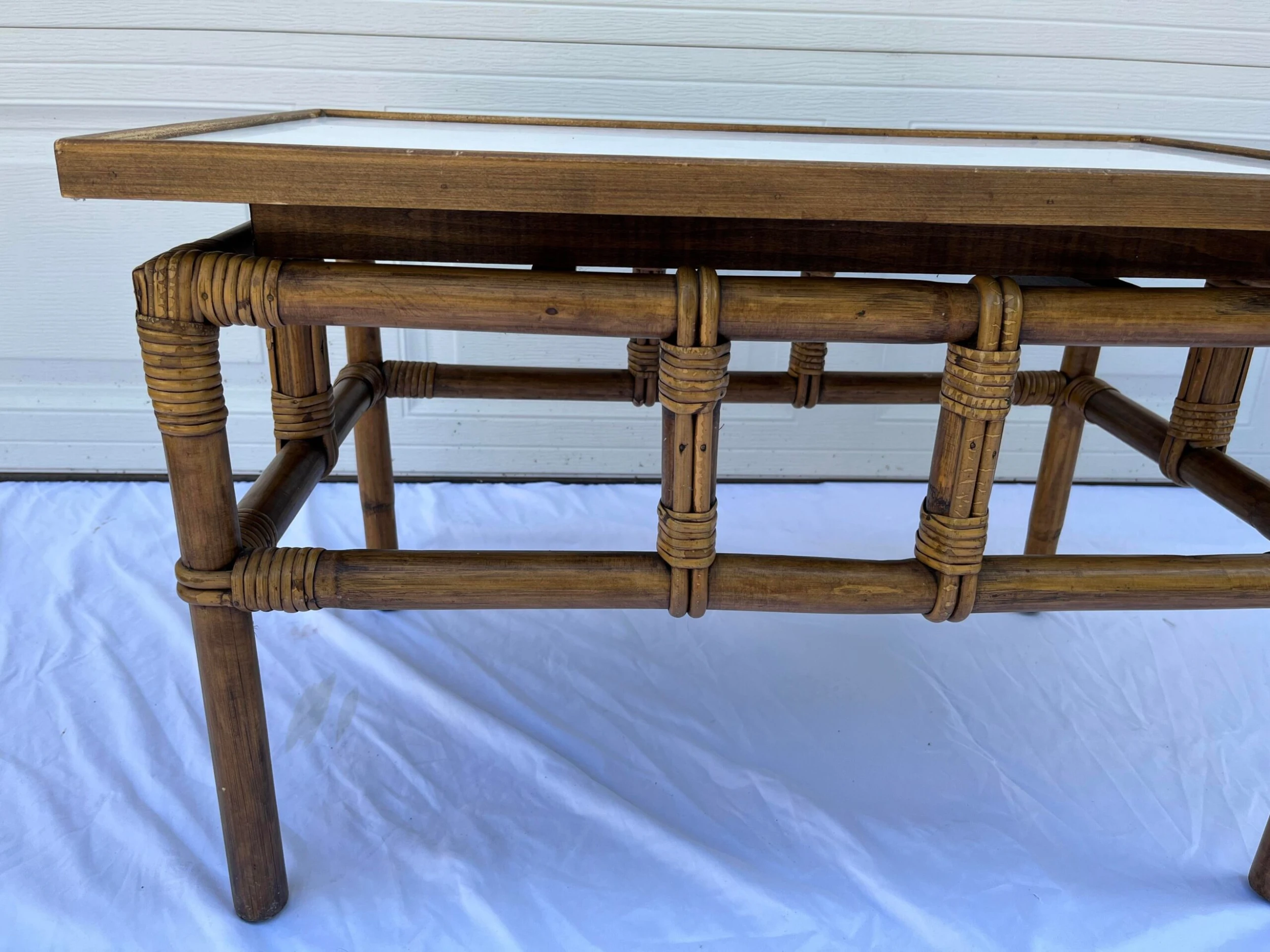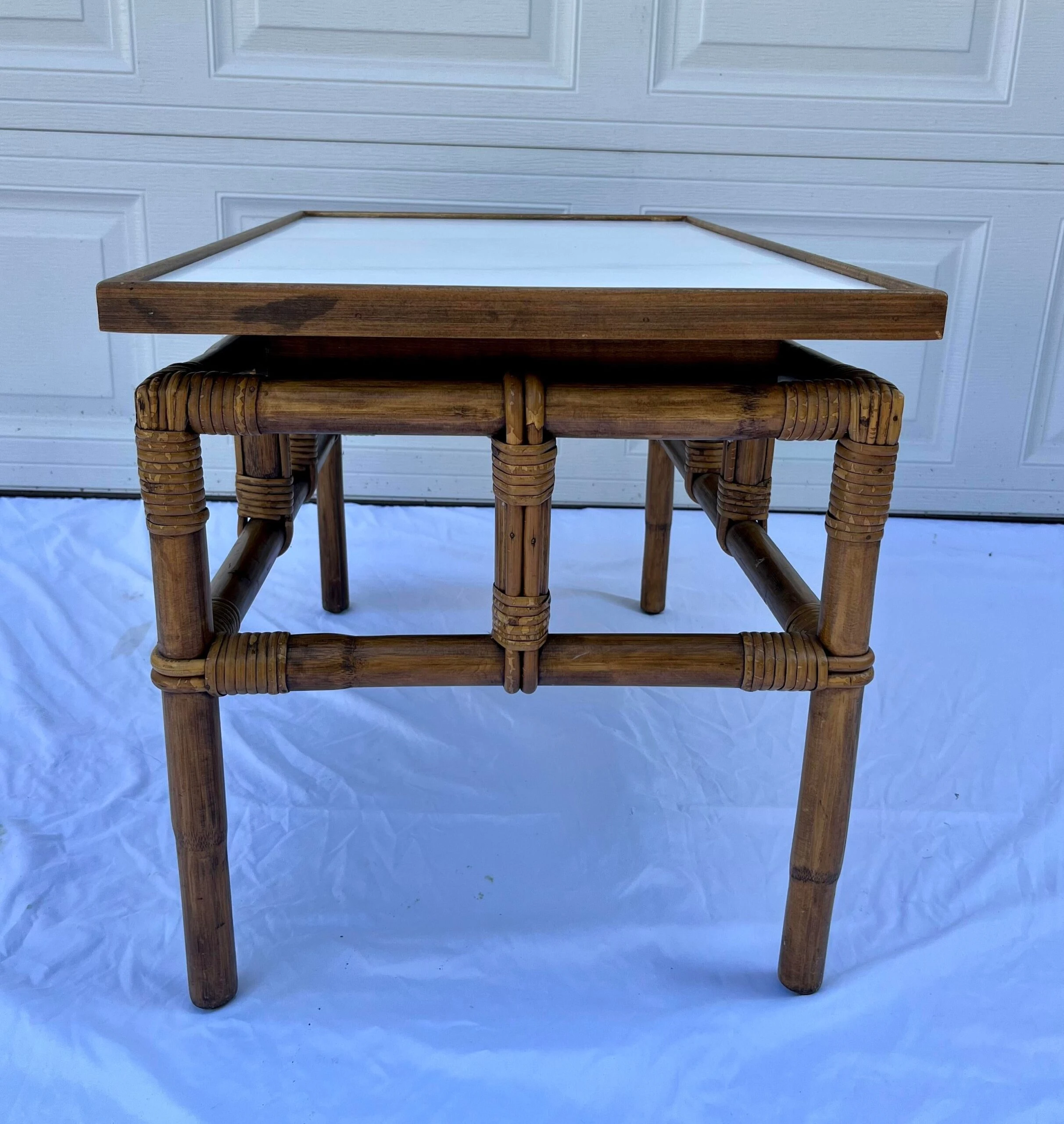 Awesome vintage rattan Campaign Style Ficks Reed Far Horizons Collection end table with white formica top. It is designed with …