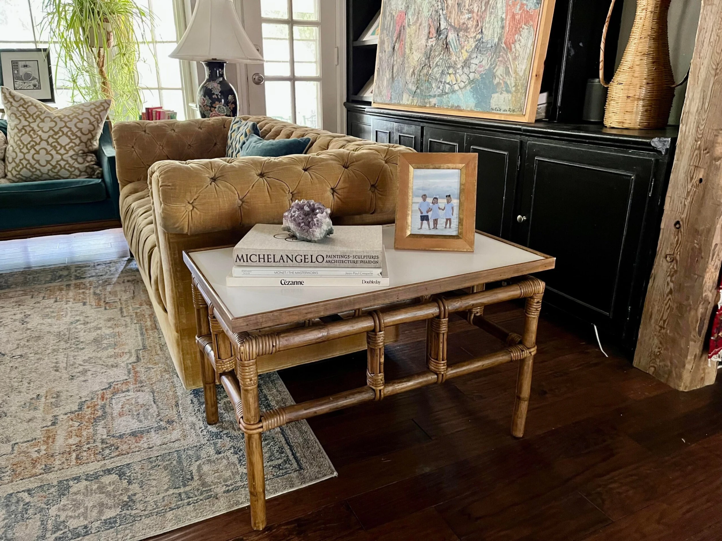 Awesome vintage rattan Campaign Style Ficks Reed Far Horizons Collection end table with white formica top. It is designed with sturdy and stylish crossbars with rattan ties on the corners on all four sides of the table. And the design of this awesome Campaign style end table is classic allowing it to work with many decor aesthetics and styles from traditional to mid-century modern. It will be wonderful in your living room next to a lounge chair or in the family room aside a comfortable chaise or loveseat. Or, maybe on its own in an entry or hallway adorned with foliage. Beautiful condition