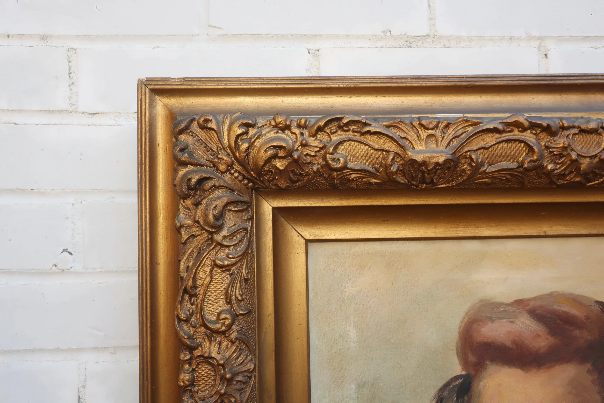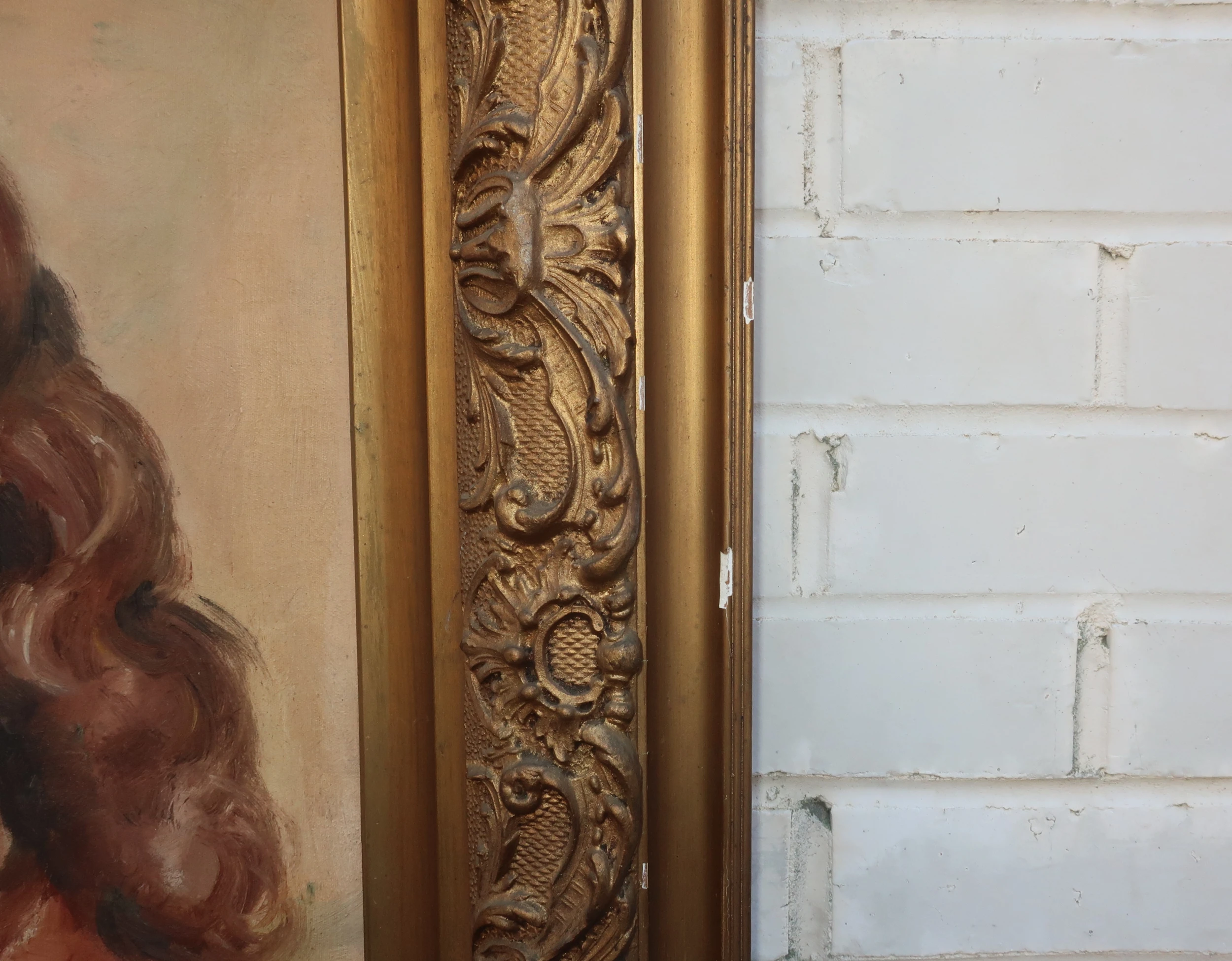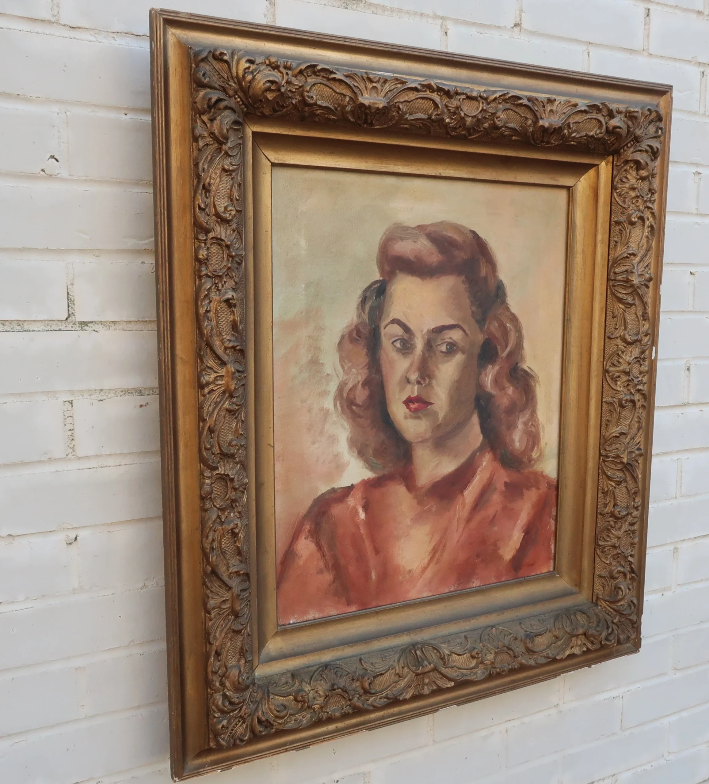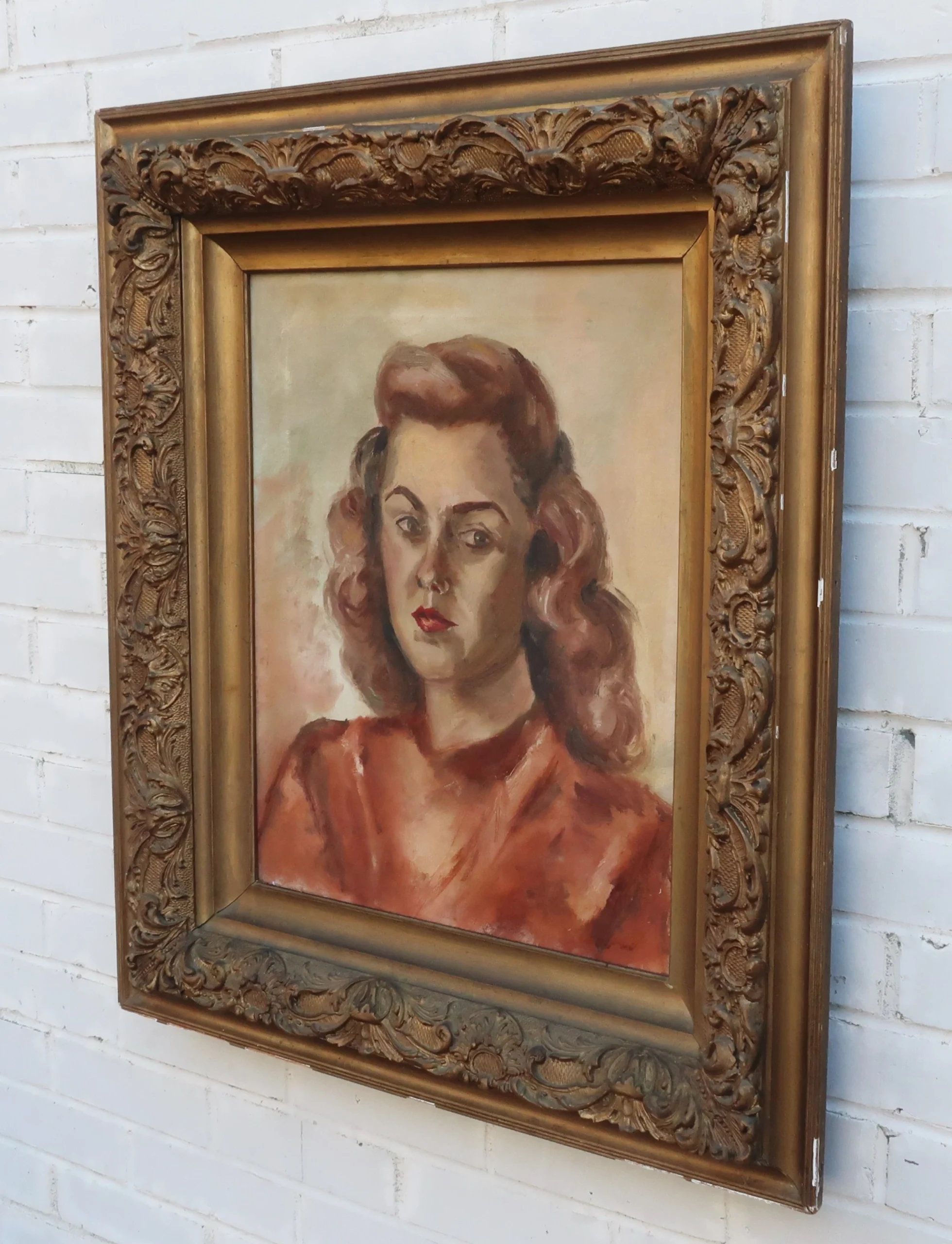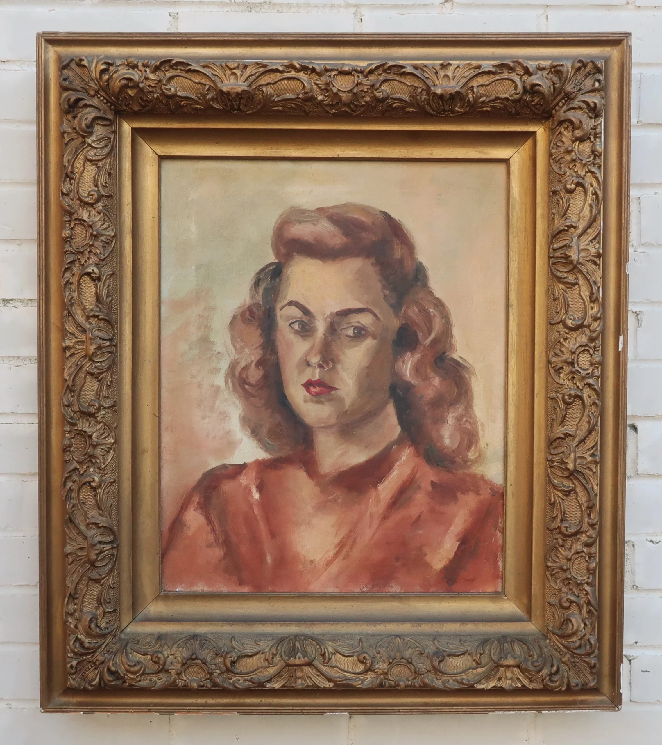 1940’s framed oil painting on canvas of a lovely young woman in shades of red, brown and brownish-red. The painting is unsigned but it is from the estate of Betty Foy Sanders, artist, philanthropist and former first lady of Georgia, and presumably a self portrait executed during her years as a student of Lamar Dodd at the University of Georgia. The ornate gilt gold frame is outfitted with wire for hanging.