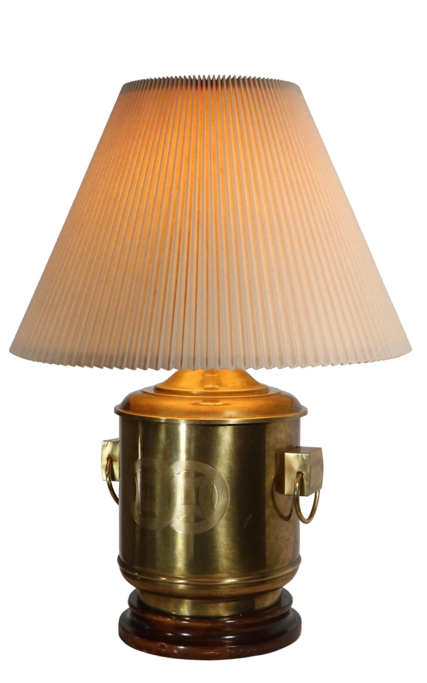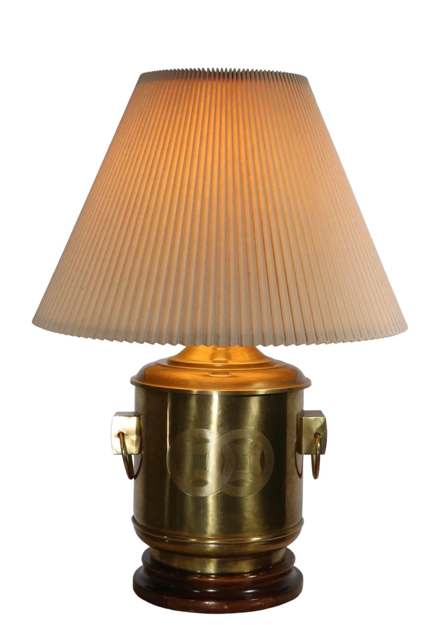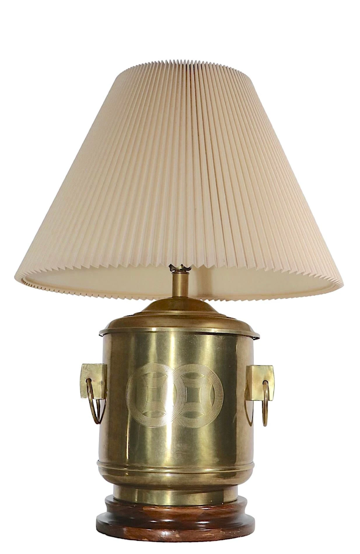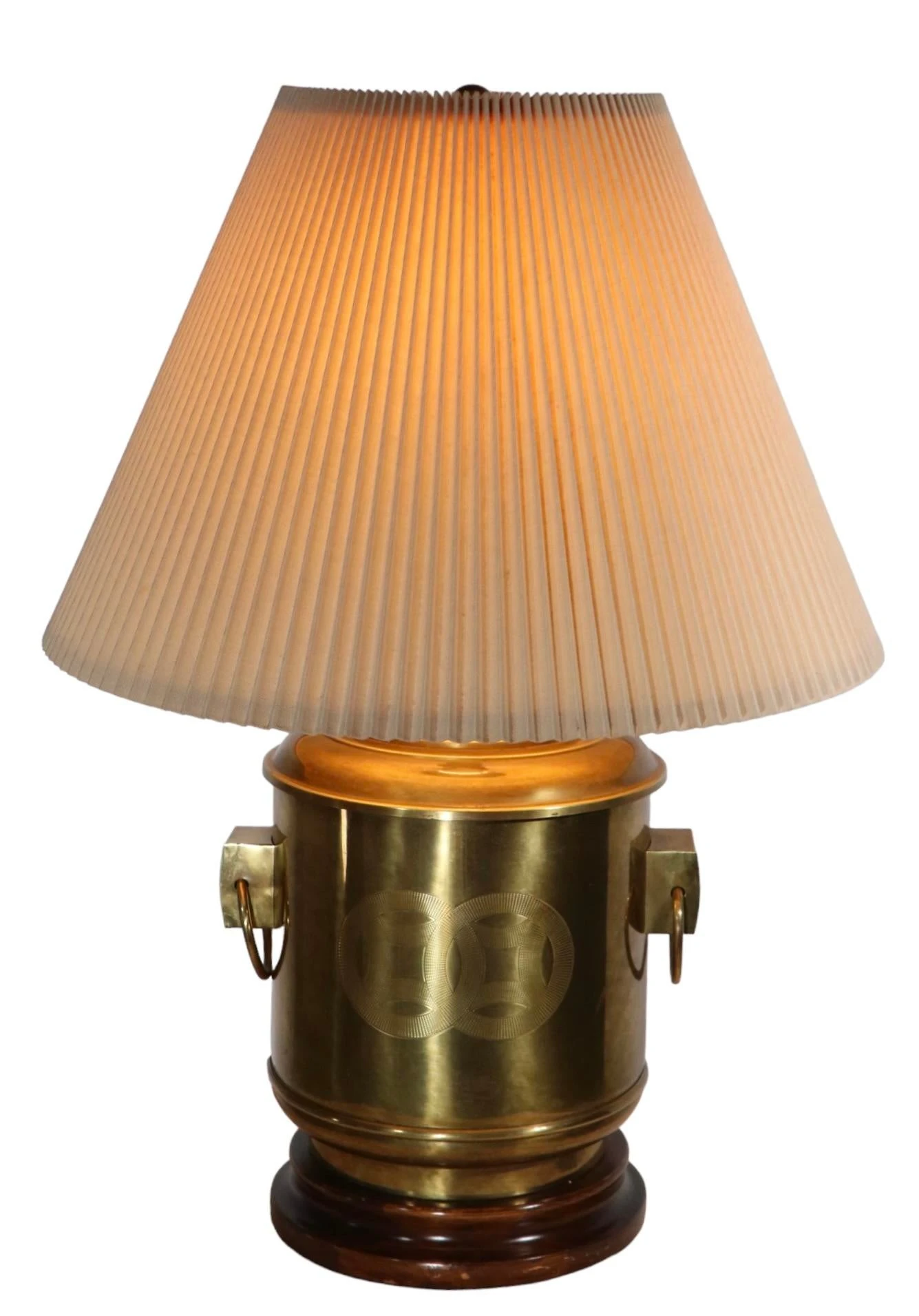 Chic brass table lamp by Frederick Cooper in the Chinese style, circa 1960/1970’s The lamp features a stylized interpretation of a Chinese symbol, Double Happiness , I believe, two decorative ring handles, on a brass body, which rests on a wood base. This example includes its original pleated shade, and it is in very good, original, clean and working condition.