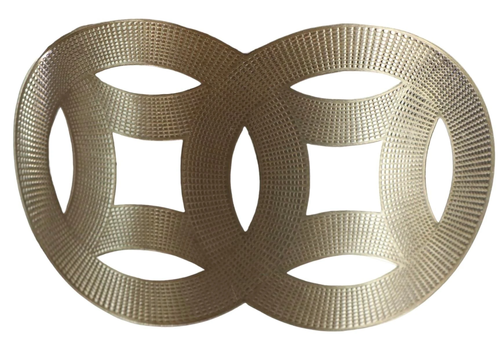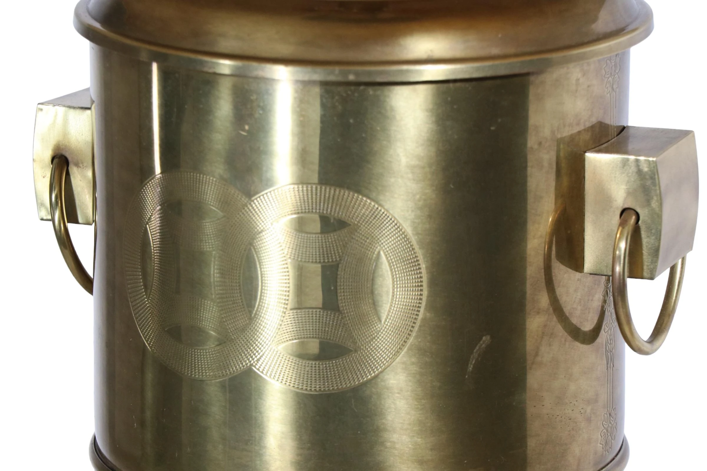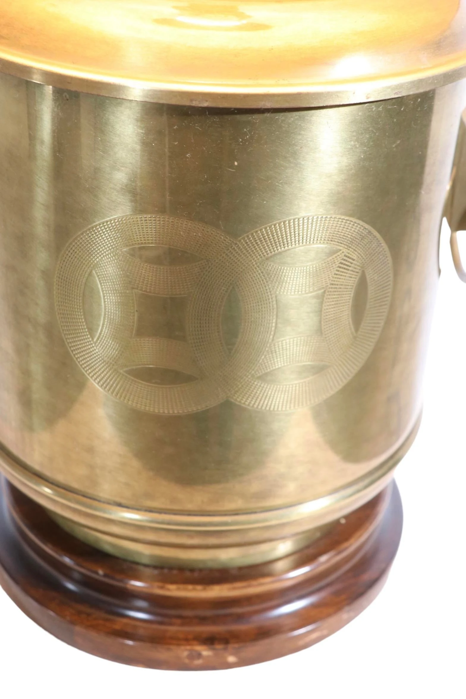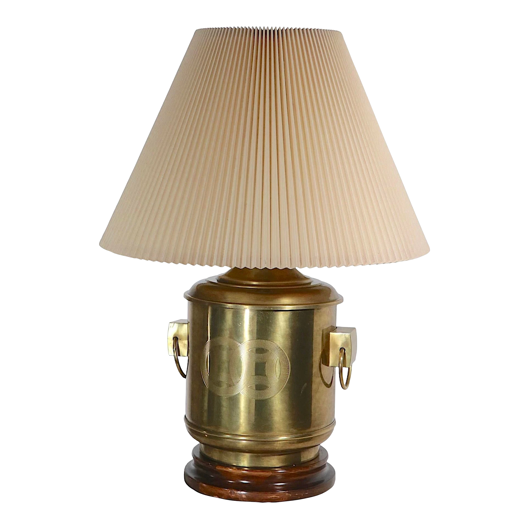 Chic brass table lamp by Frederick Cooper in the Chinese style, circa 1960/1970’s The lamp features a stylized interpretation of a Chinese symbol, Double Happiness , I believe, two decorative ring handles, on a brass body, which rests on a wood base. This example includes its original pleated shade, and it is in very good, original, clean and working condition.