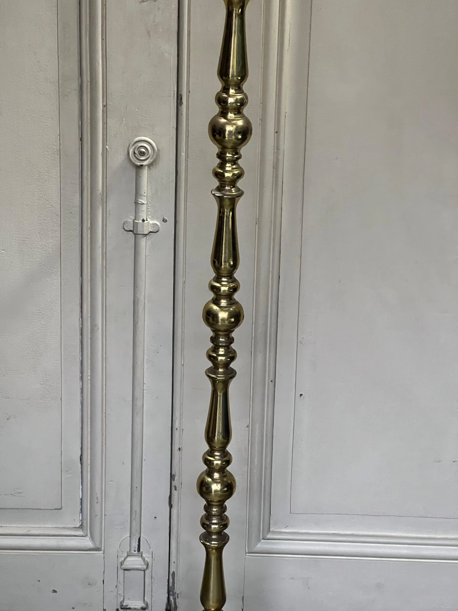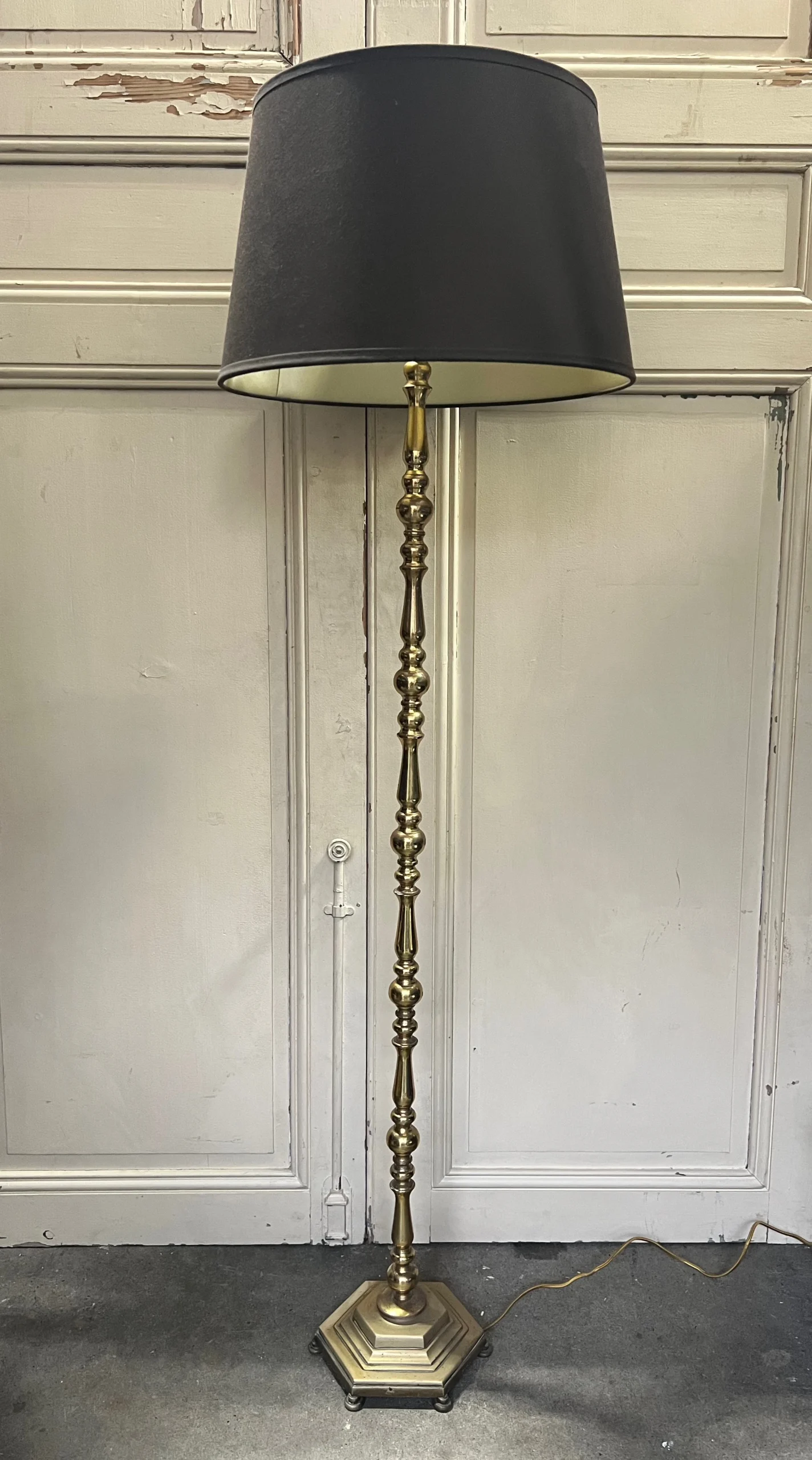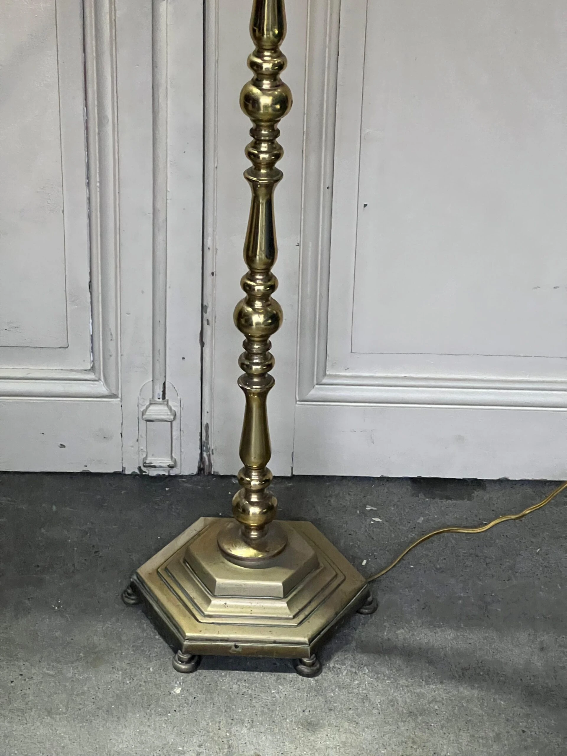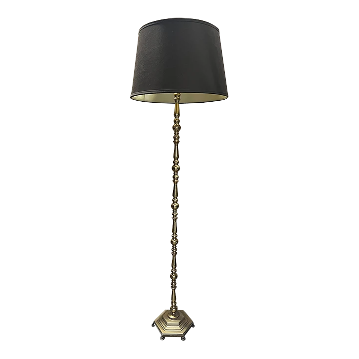 Introducing a stunning French 1940’s floor lamp, expertly fashioned from high-quality brass and bronze. This captivating piece showcases a cast hexagonal base and meticulously turned components. The entire lamp has been meticulously hand-polished, resulting in a captivating low luster dark brass finish. To honor its history, we have carefully preserved as much of the original patina as possible, revealing charming variations that reflect its age and previous use. Recently rewired with a professional-quality double socket and adorned with a black silk wrapped cord, this floor lamp seamlessly blends vintage charm with modern functionality. In very good vintage condition, this remarkable lamp does not come with a shade; however, it is displayed with a shade measuring 15 inches at the top, 19 inches at the bottom, and standing 11 inches tall. With dimensions of 63 inches in height and a 10-inch diameter base, this distinctive floor lamp is just one of the many exceptional offerings in our extensive collection at 145 Antiques. We take pride in curating a comprehensive selection of vintage and one-of-a-kind tables, furniture, and decorative items. Each piece in our collection embodies the utmost quality and craftsmanship. Our online assortment of vintage floor lamps is truly unparalleled, featuring unique designs that have the ability to transform your home into a personal sanctuary. If you seek extraordinary vintage pieces, we invite you to explore our website and uncover more incredible finds.
