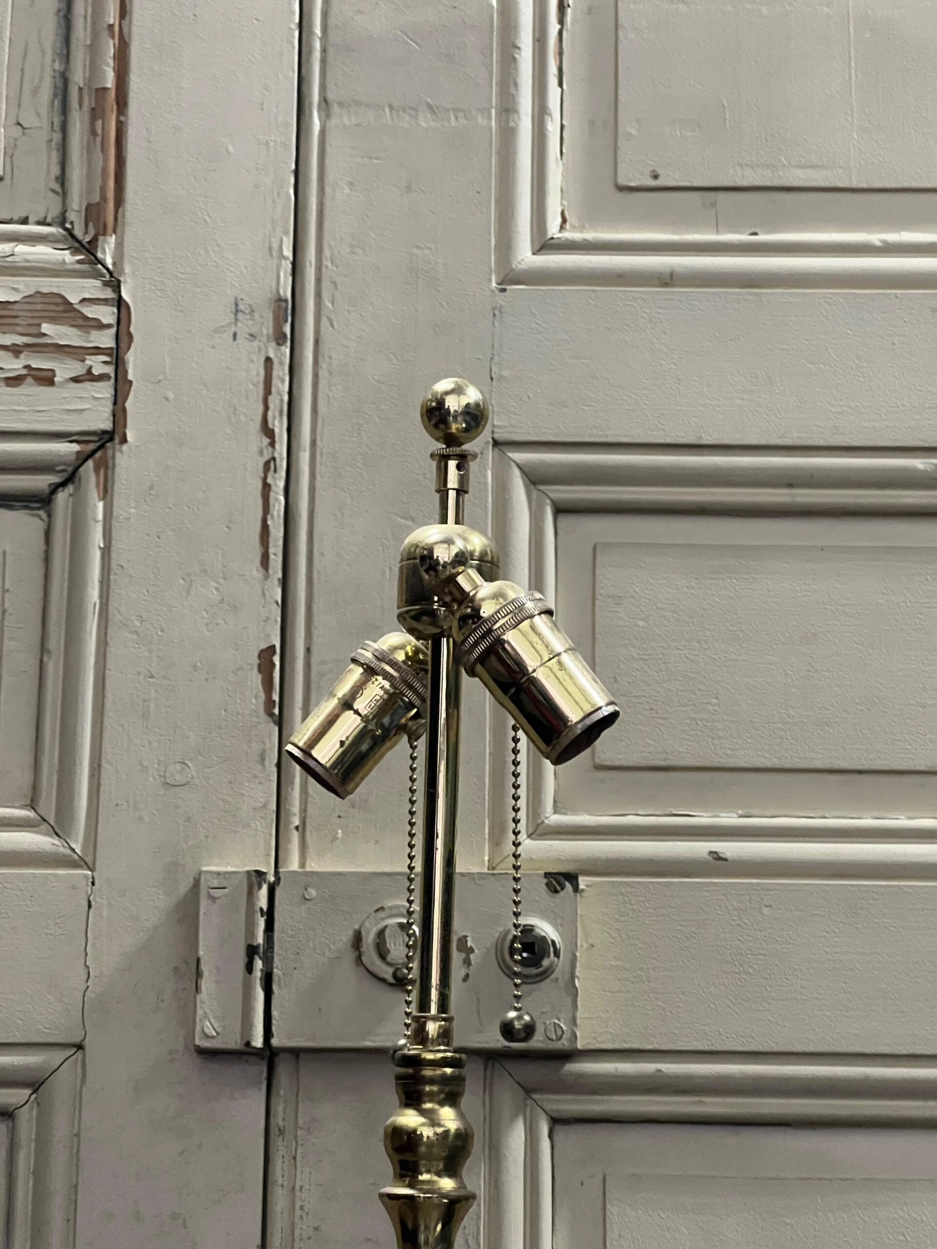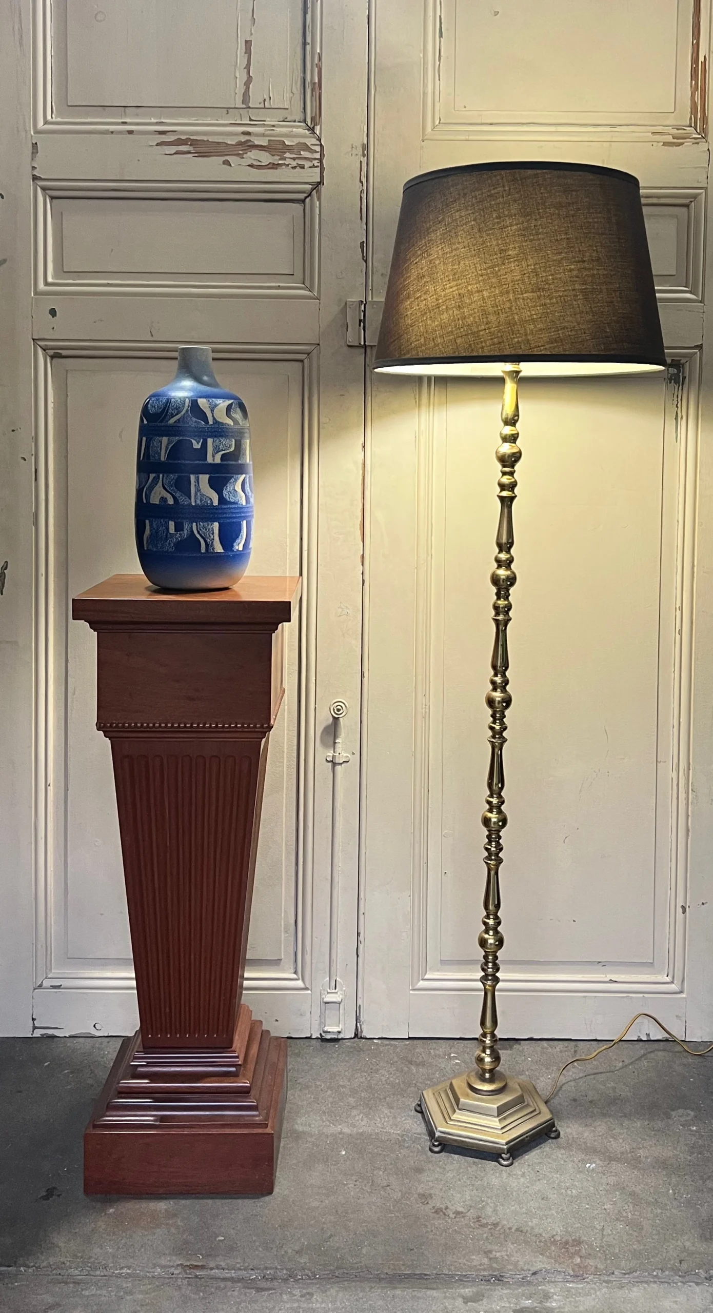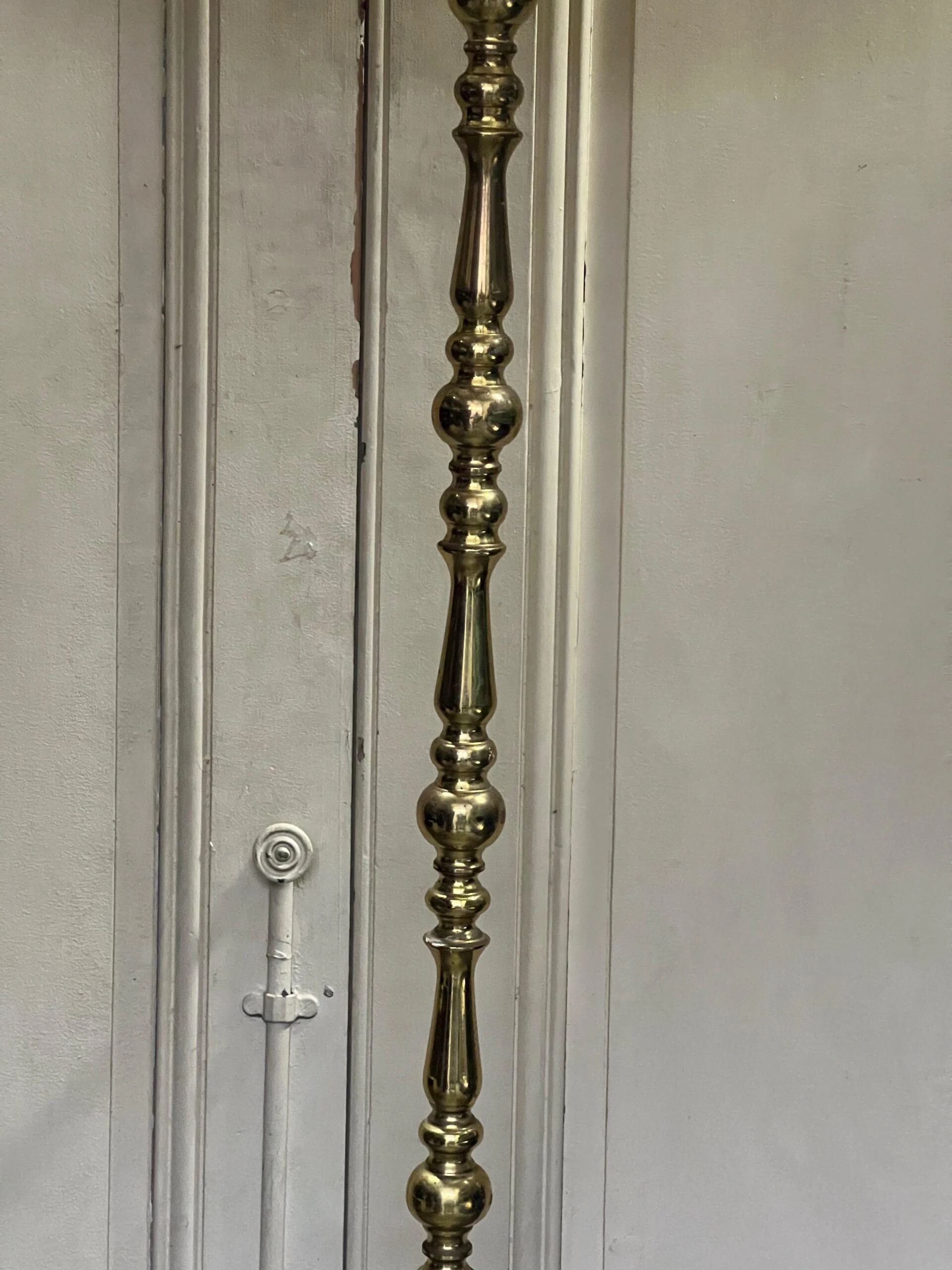 Introducing a stunning French 1940’s floor lamp, expertly fashioned from high-quality brass and bronze. This captivating piece showcases a cast hexagonal base and meticulously turned components. The entire lamp has been meticulously hand-polished, resulting in a captivating low luster dark brass finish. To honor its history, we have carefully preserved as much of the original patina as possible, revealing charming variations that reflect its age and previous use. Recently rewired with a professional-quality double socket and adorned with a black silk wrapped cord, this floor lamp seamlessly blends vintage charm with modern functionality. In very good vintage condition, this remarkable lamp does not come with a shade; however, it is displayed with a shade measuring 15 inches at the top, 19 inches at the bottom, and standing 11 inches tall. With dimensions of 63 inches in height and a 10-inch diameter base, this distinctive floor lamp is just one of the many exceptional offerings in our extensive collection at 145 Antiques. We take pride in curating a comprehensive selection of vintage and one-of-a-kind tables, furniture, and decorative items. Each piece in our collection embodies the utmost quality and craftsmanship. Our online assortment of vintage floor lamps is truly unparalleled, featuring unique designs that have the ability to transform your home into a personal sanctuary. If you seek extraordinary vintage pieces, we invite you to explore our website and uncover more incredible finds.