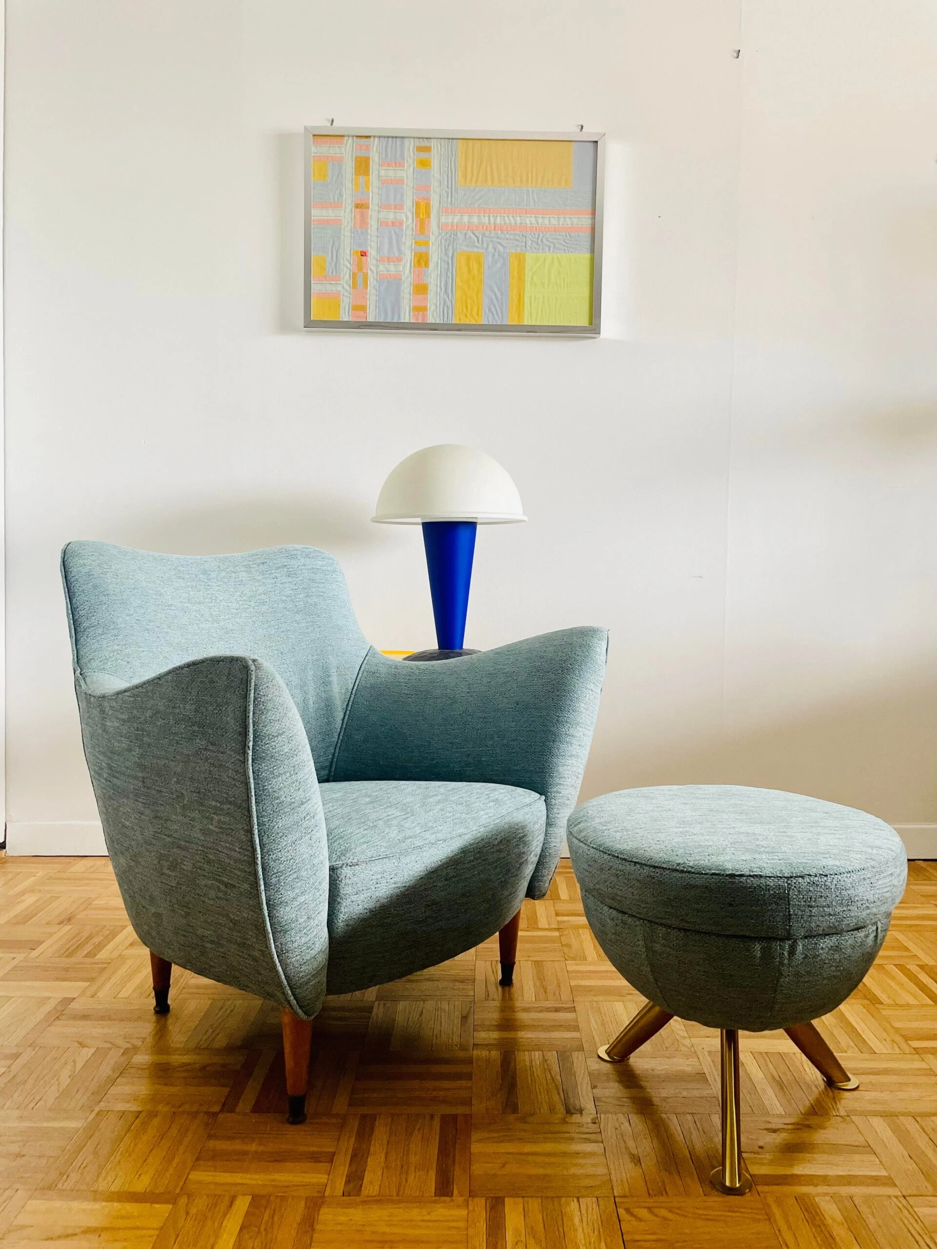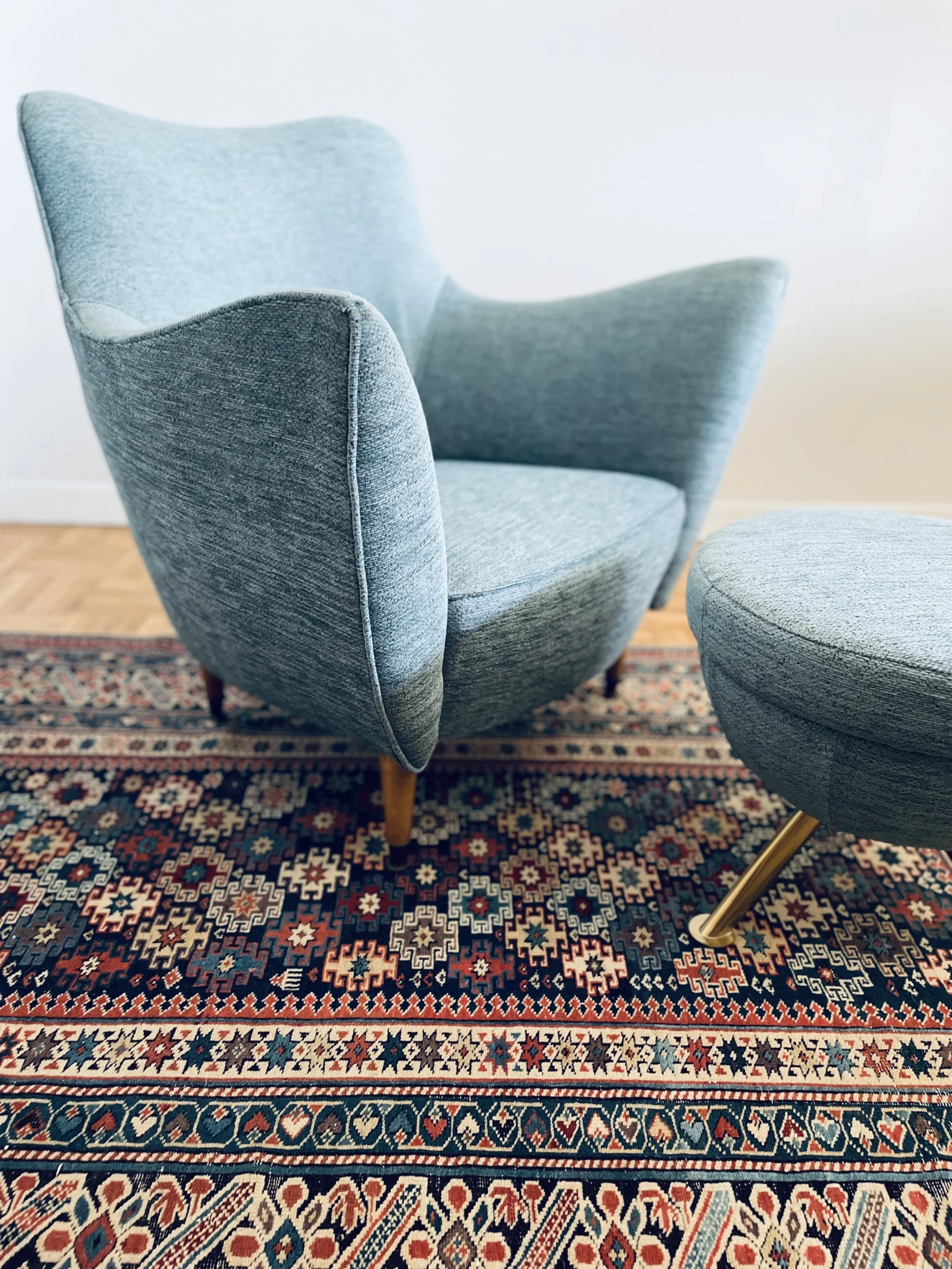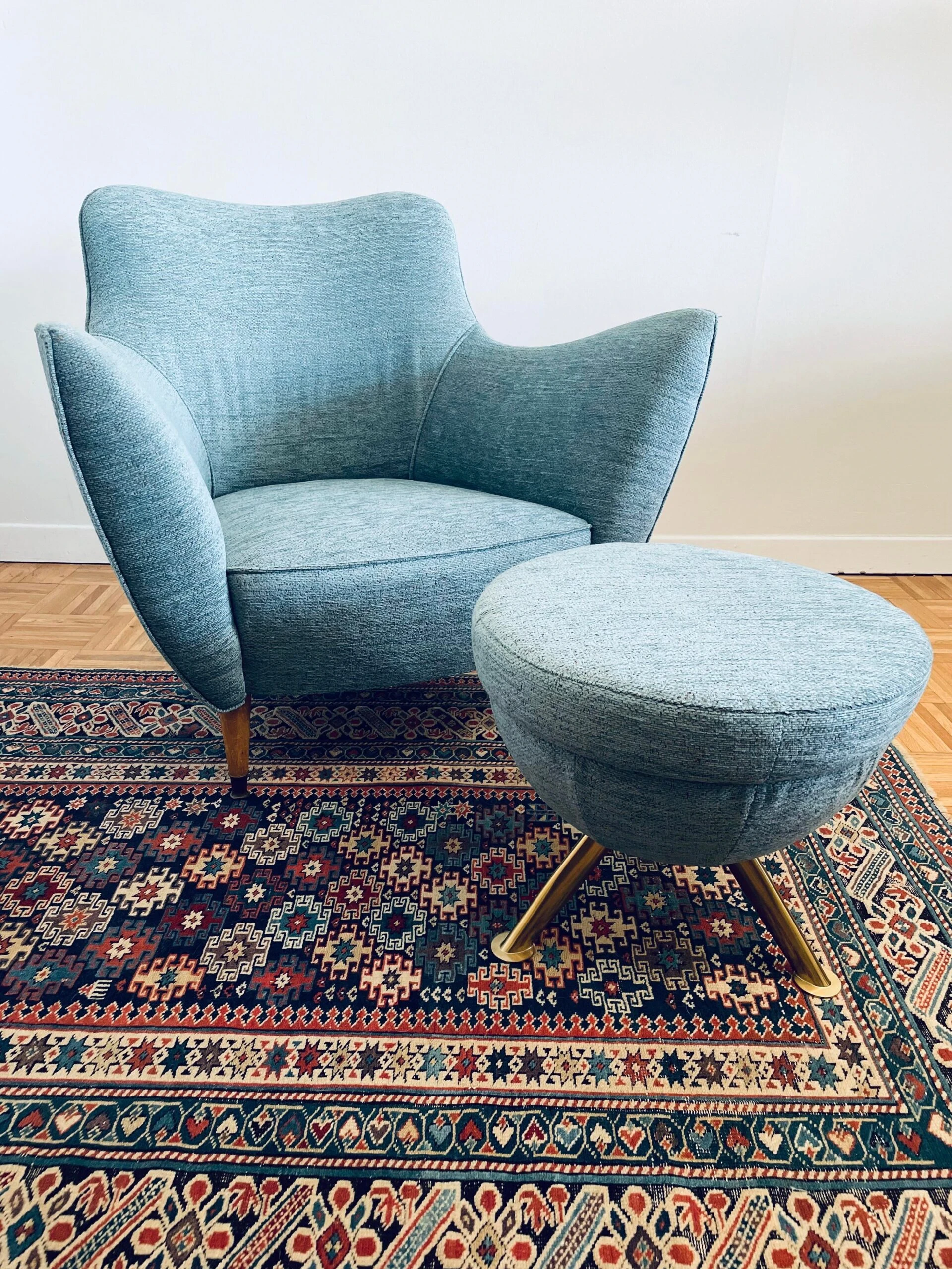 The lounge chair is newly re-upholstered in a stunning blue tweed fabric by Nobilis with self welt – a contemporary pouf in the same fabric and brass legs is sold with the lounge chair.