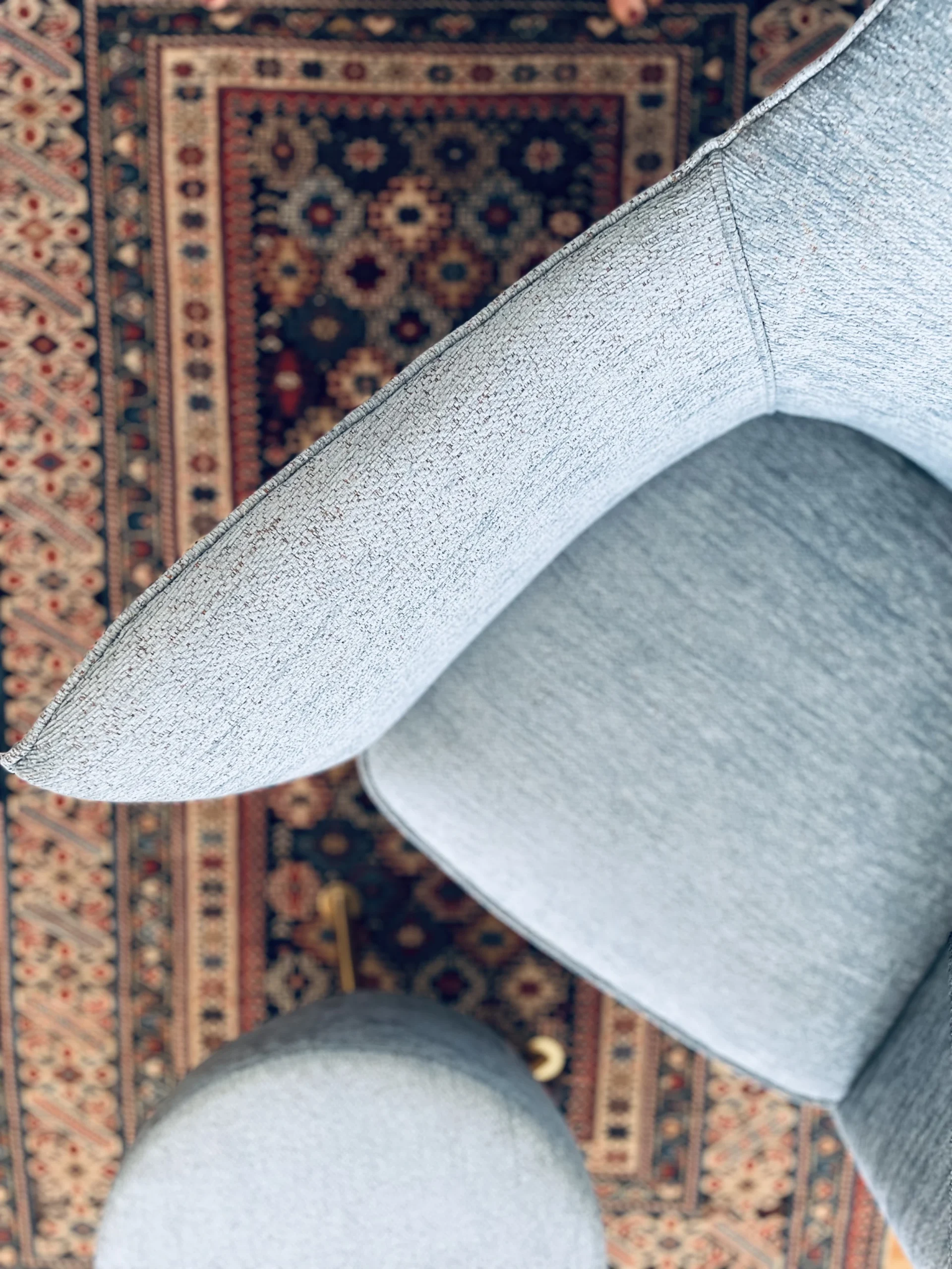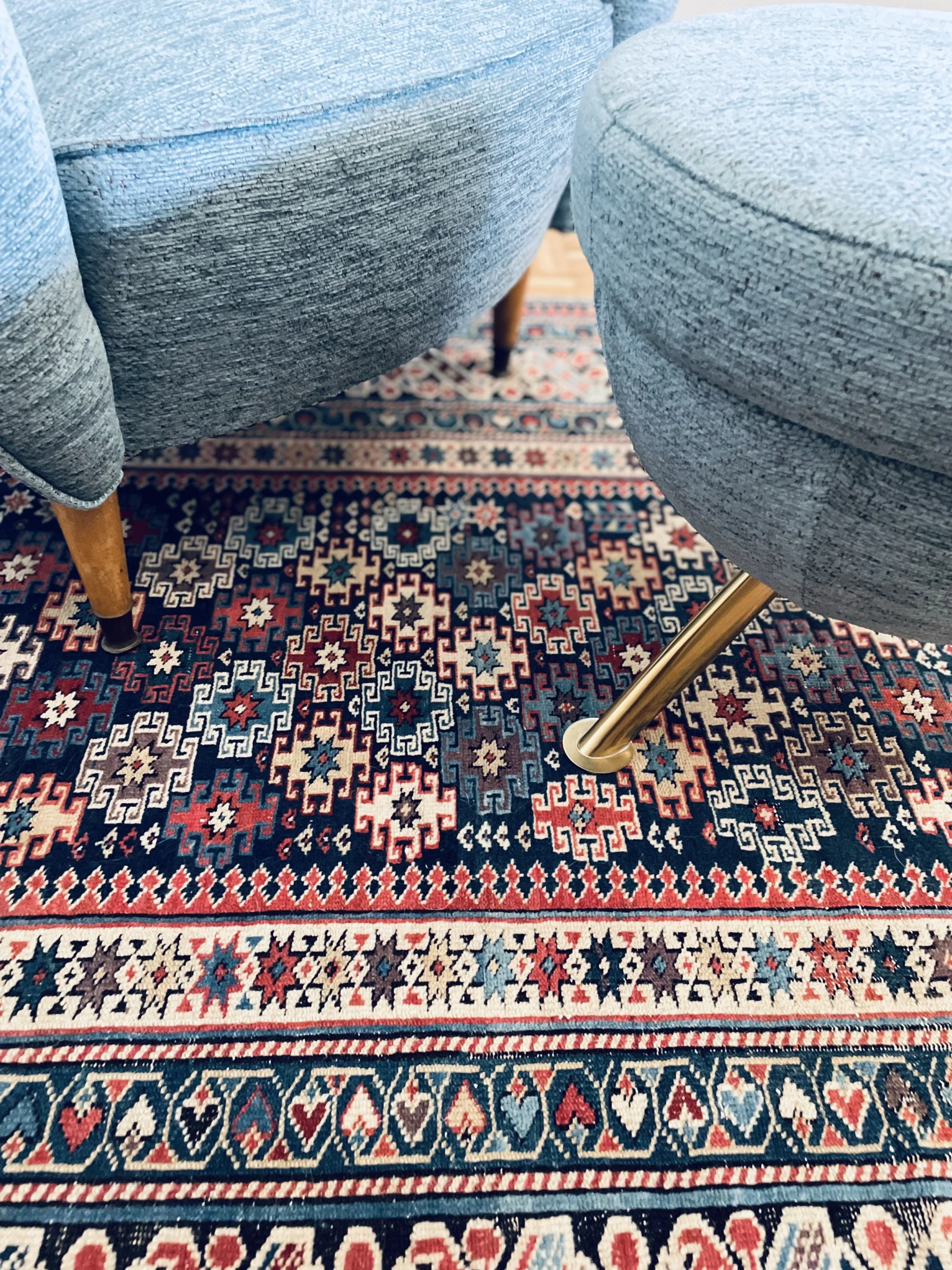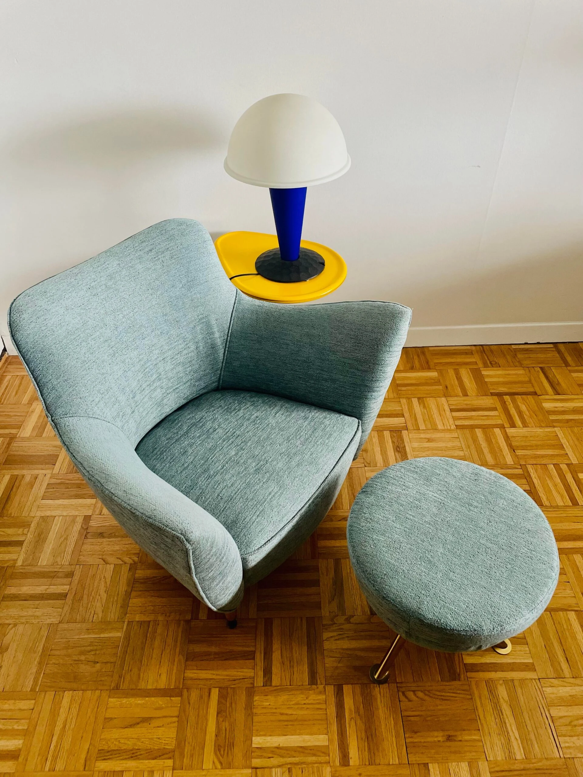 The lounge chair is newly re-upholstered in a stunning blue tweed fabric by Nobilis with self welt – a contemporary pouf in the same fabric and brass legs is sold with the lounge chair.