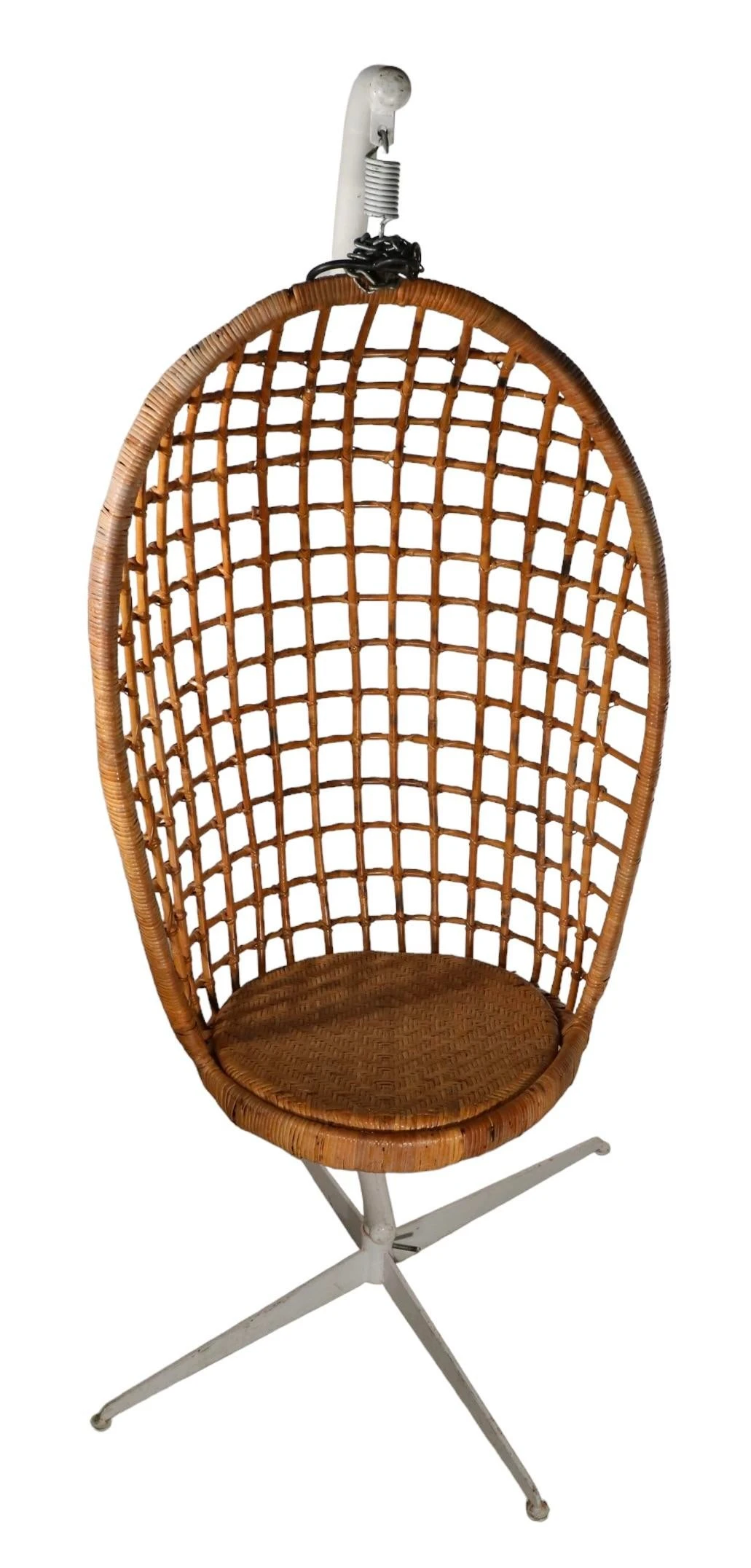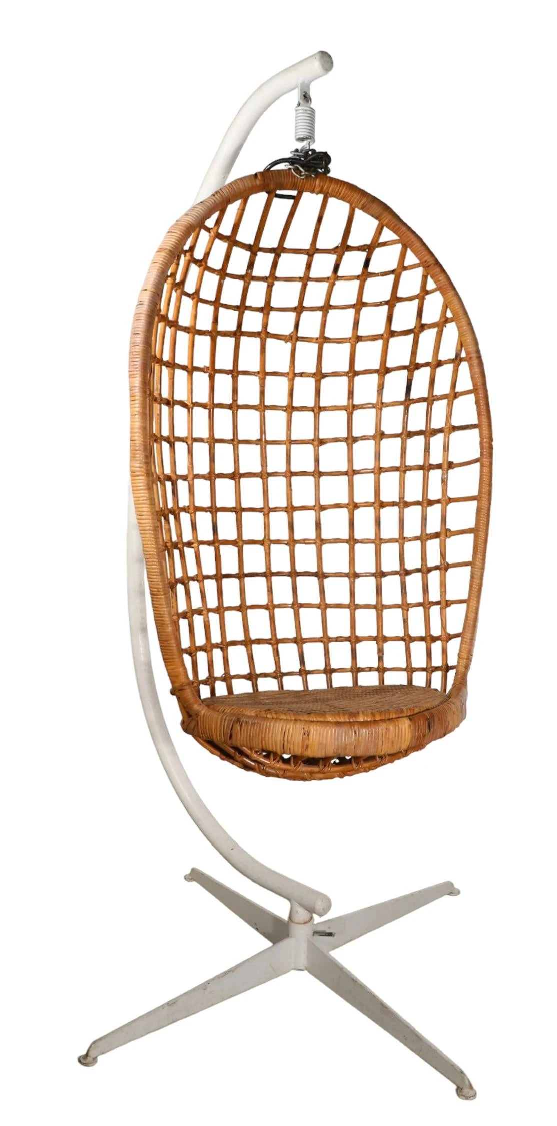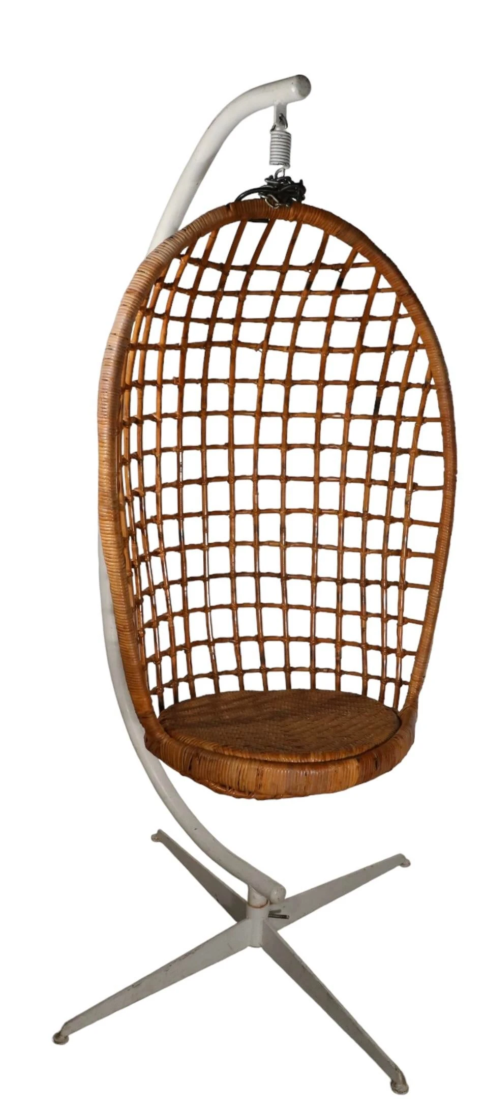Cool 1970’s period hanging wicker basket, or “Egg” chair with its original metal stand. The chair is suspended from the …