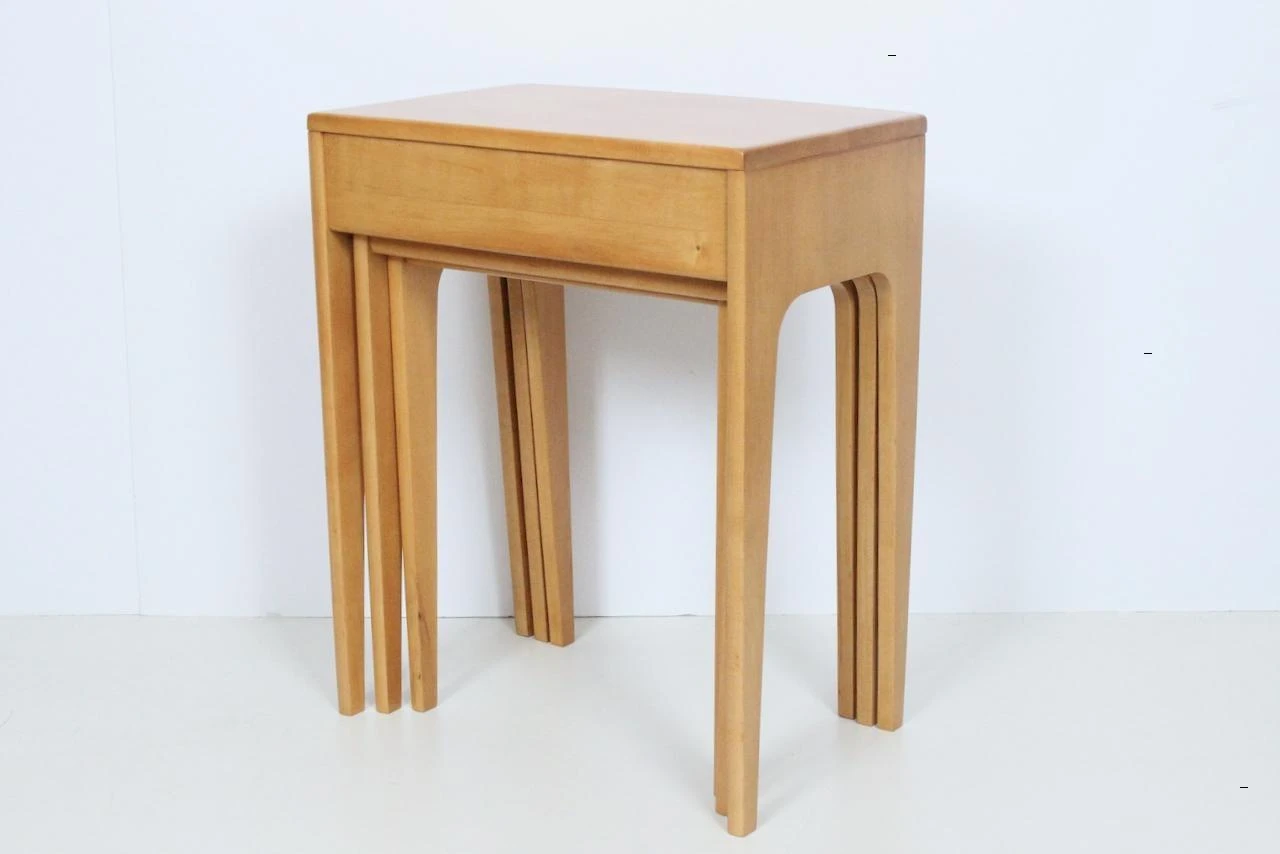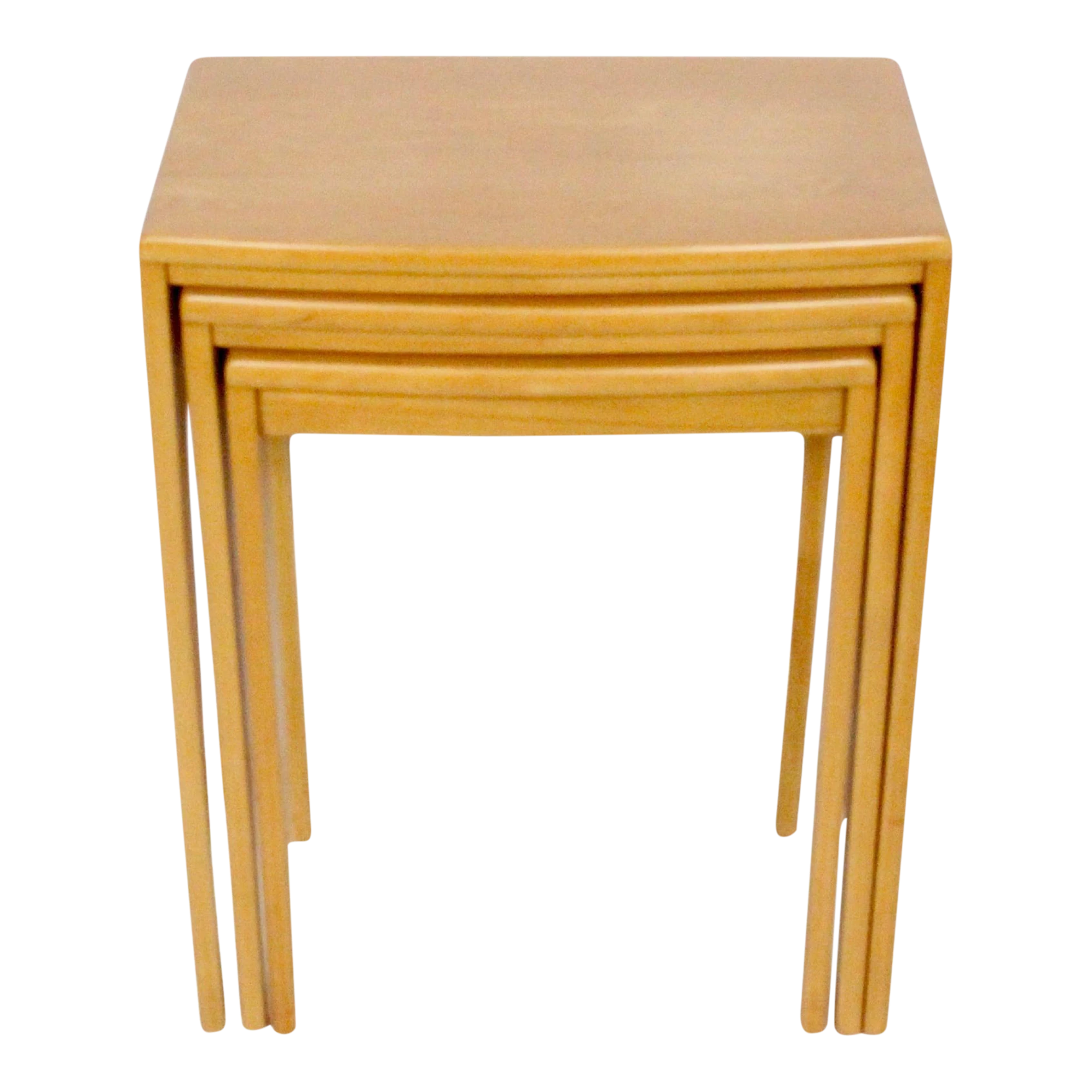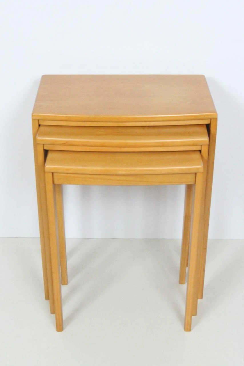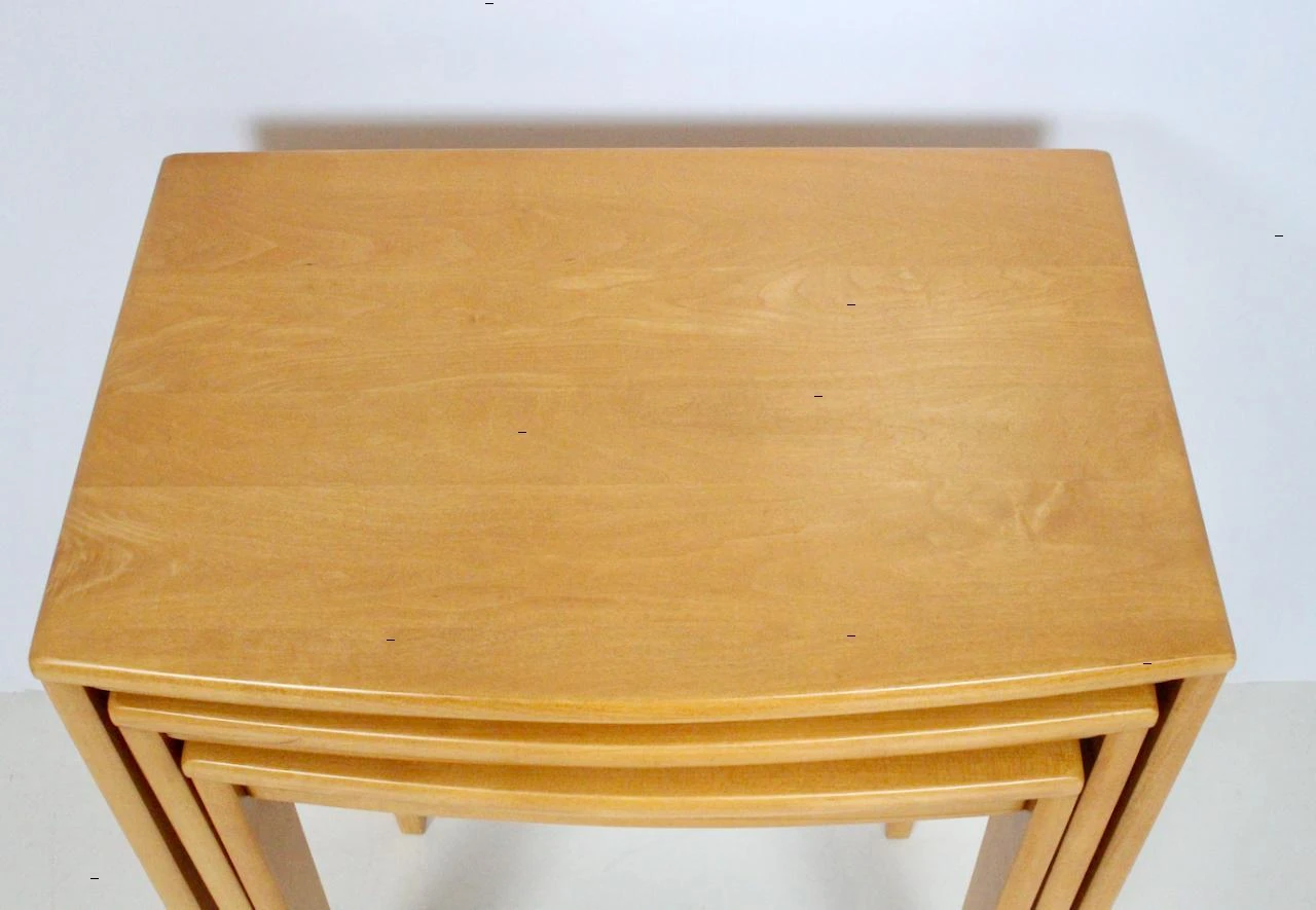 Set of three solid maple nesting tables in the style of Heywood Wakefield. Featuring a neutral, narrow rectangular form, smooth …