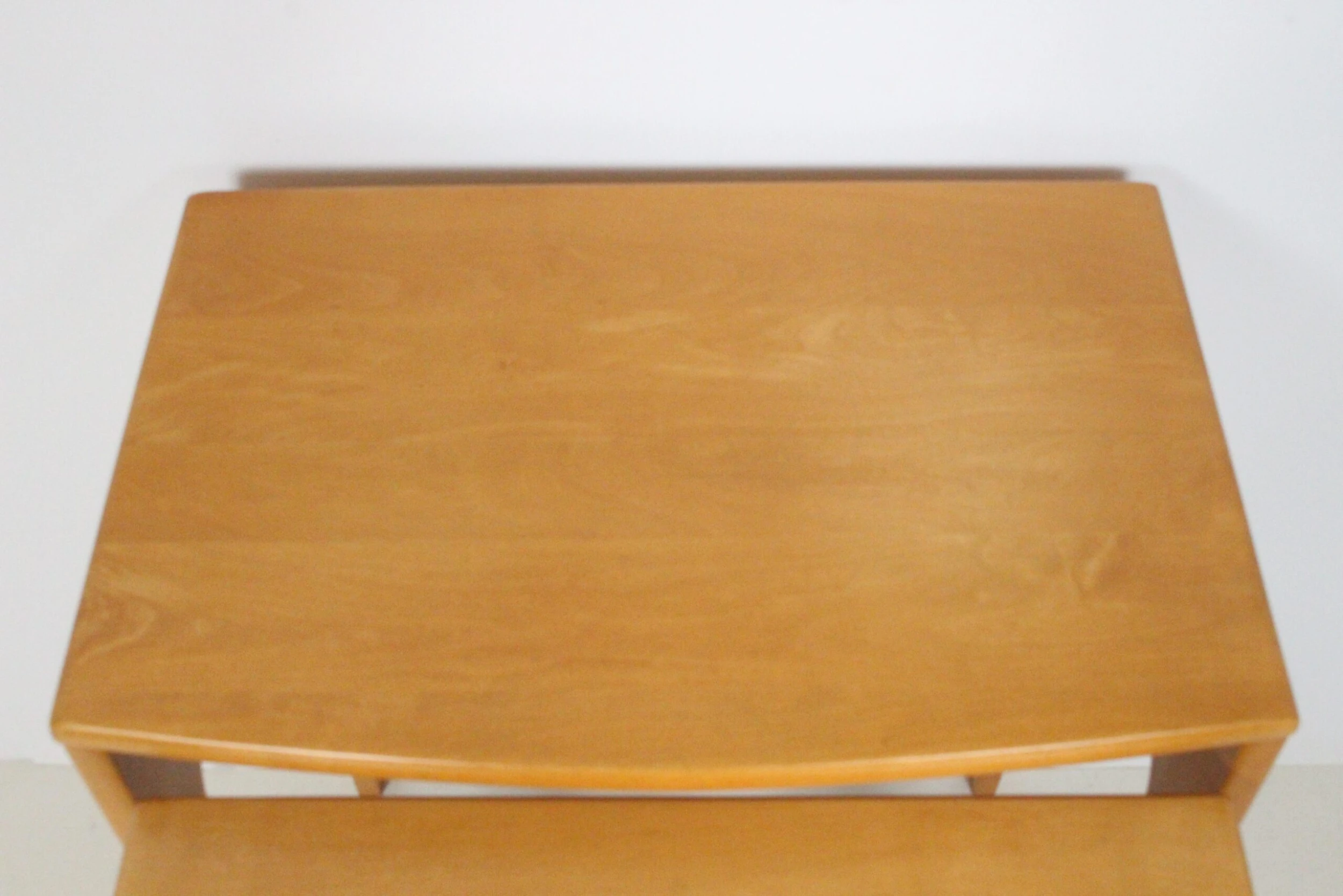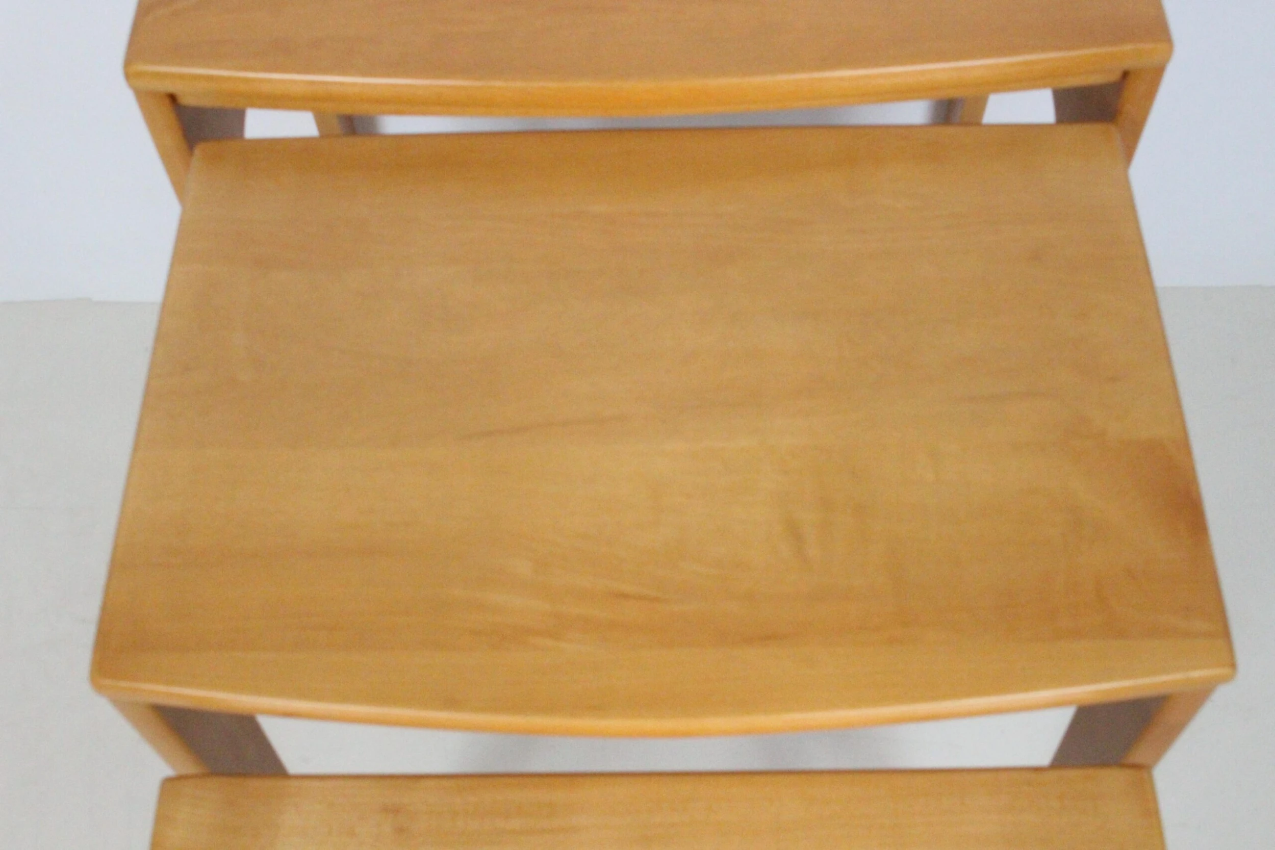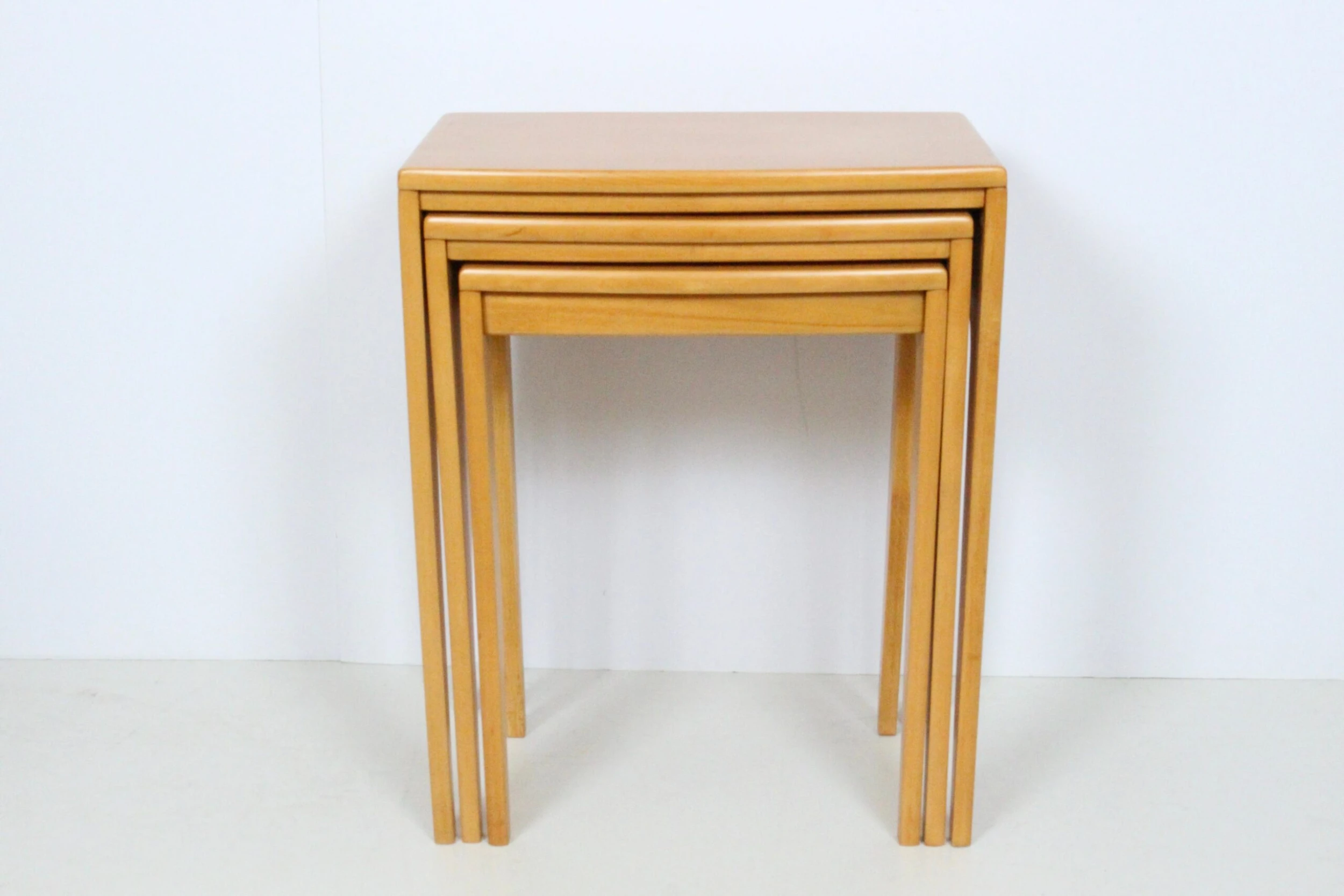 Set of three solid maple nesting tables in the style of Heywood Wakefield. Featuring a neutral, narrow rectangular form, smooth …