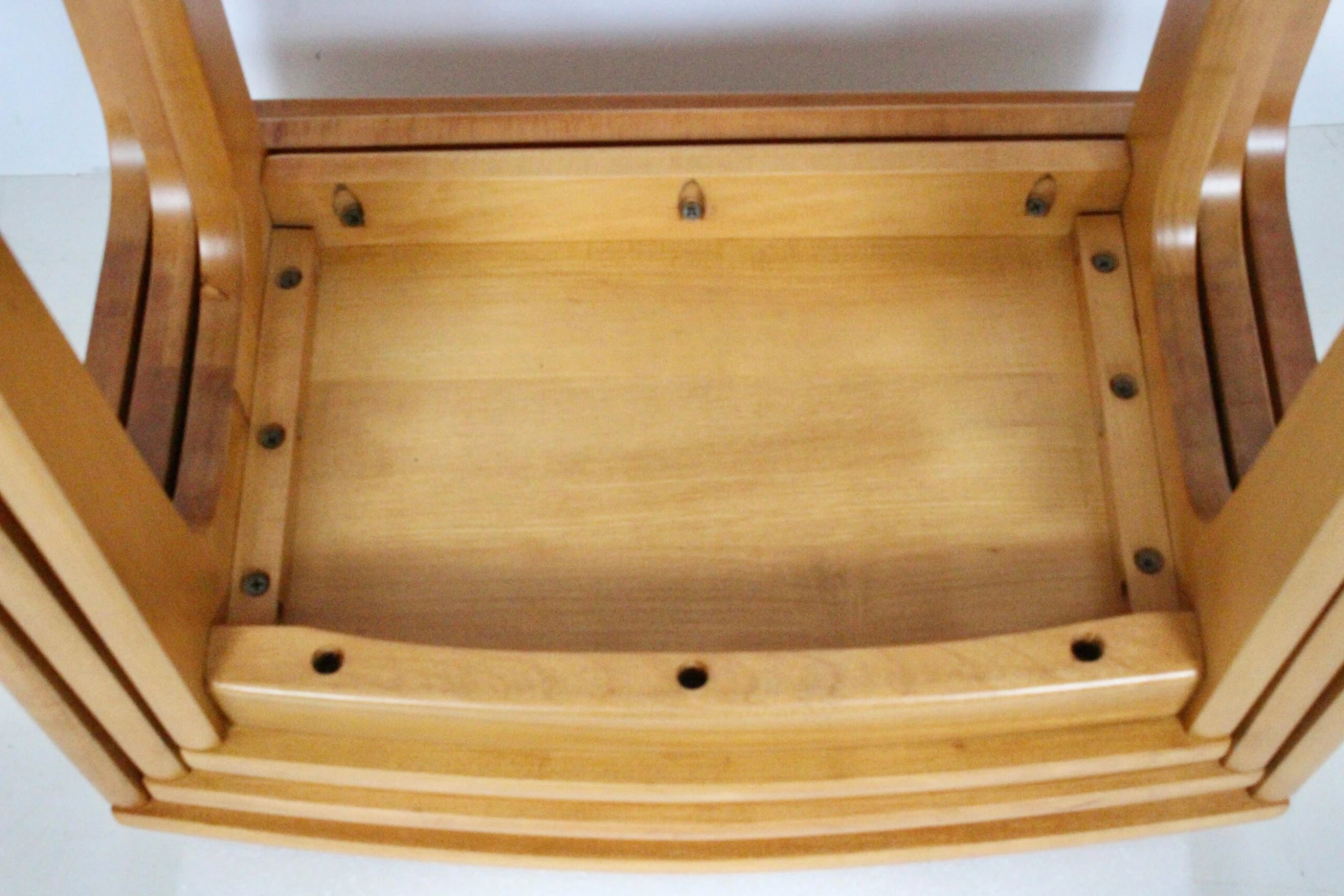 Set of three solid maple nesting tables in the style of Heywood Wakefield. Featuring a neutral, narrow rectangular form, smooth rounded face small footprint overall. Completely refinished. Versatile. Compact. Sturdy. Measurements: Outside (25.75H x 21Wx 14D) Middle (24H x 19W x 13D) Interior (22H x 17W x 11.5D).