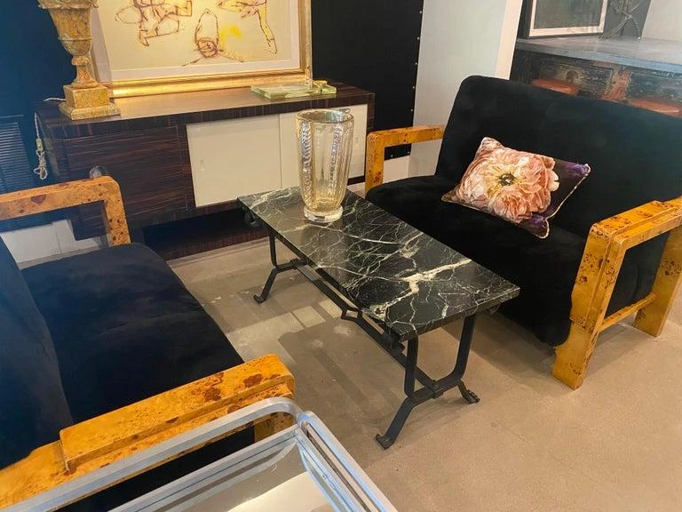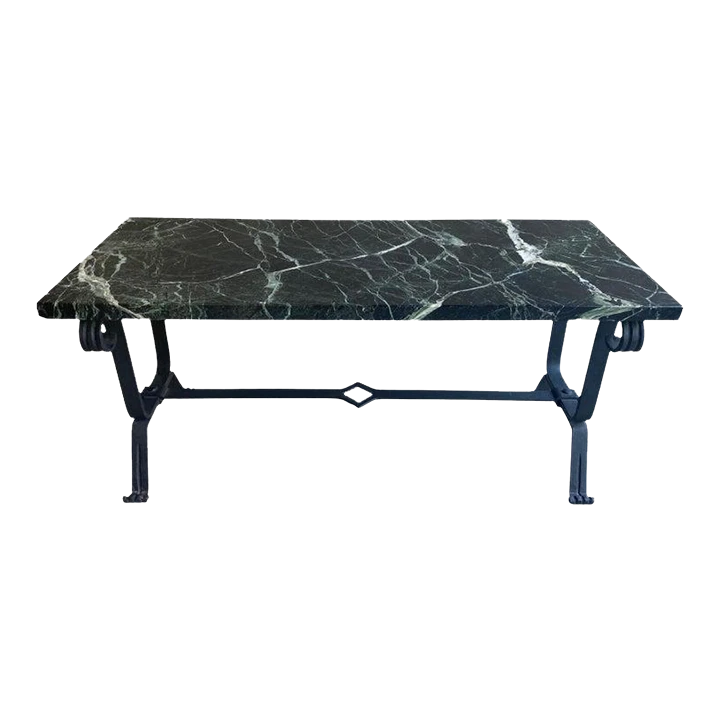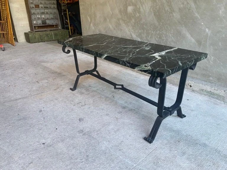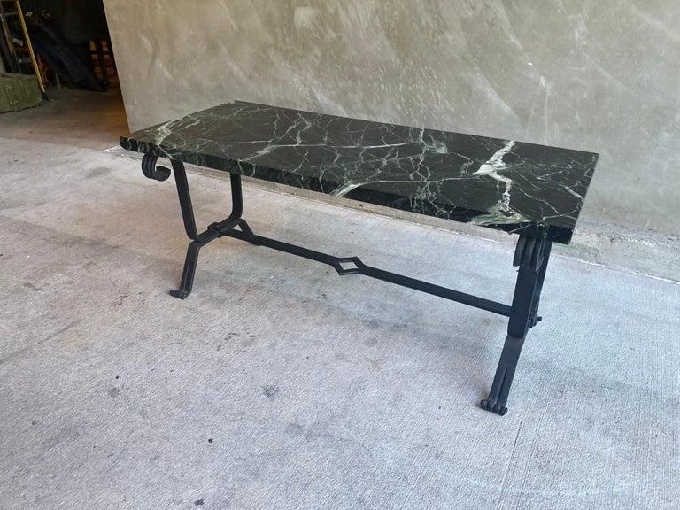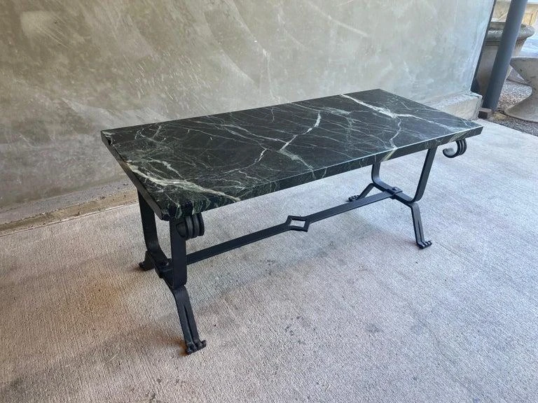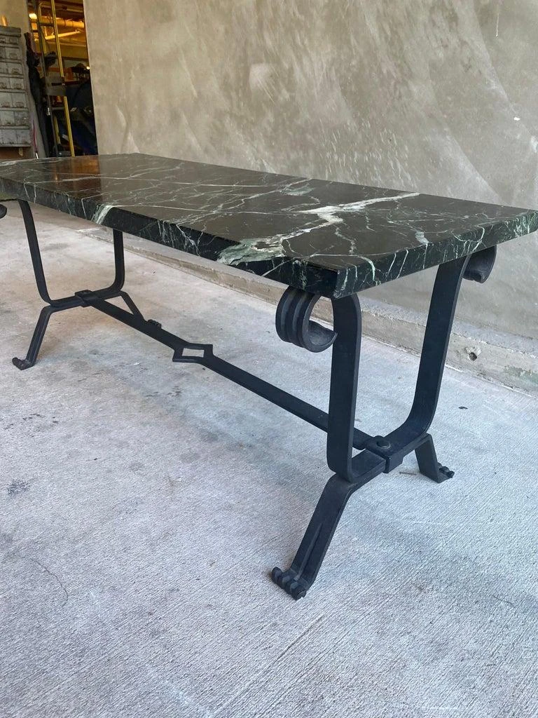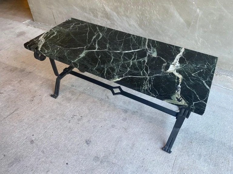 Cocktail table with forged iron base and dark marble top. Marble is mostly black with strong white veins and a subtle hint of green. Styling is art deco to mid-century modern. France, 1930’s