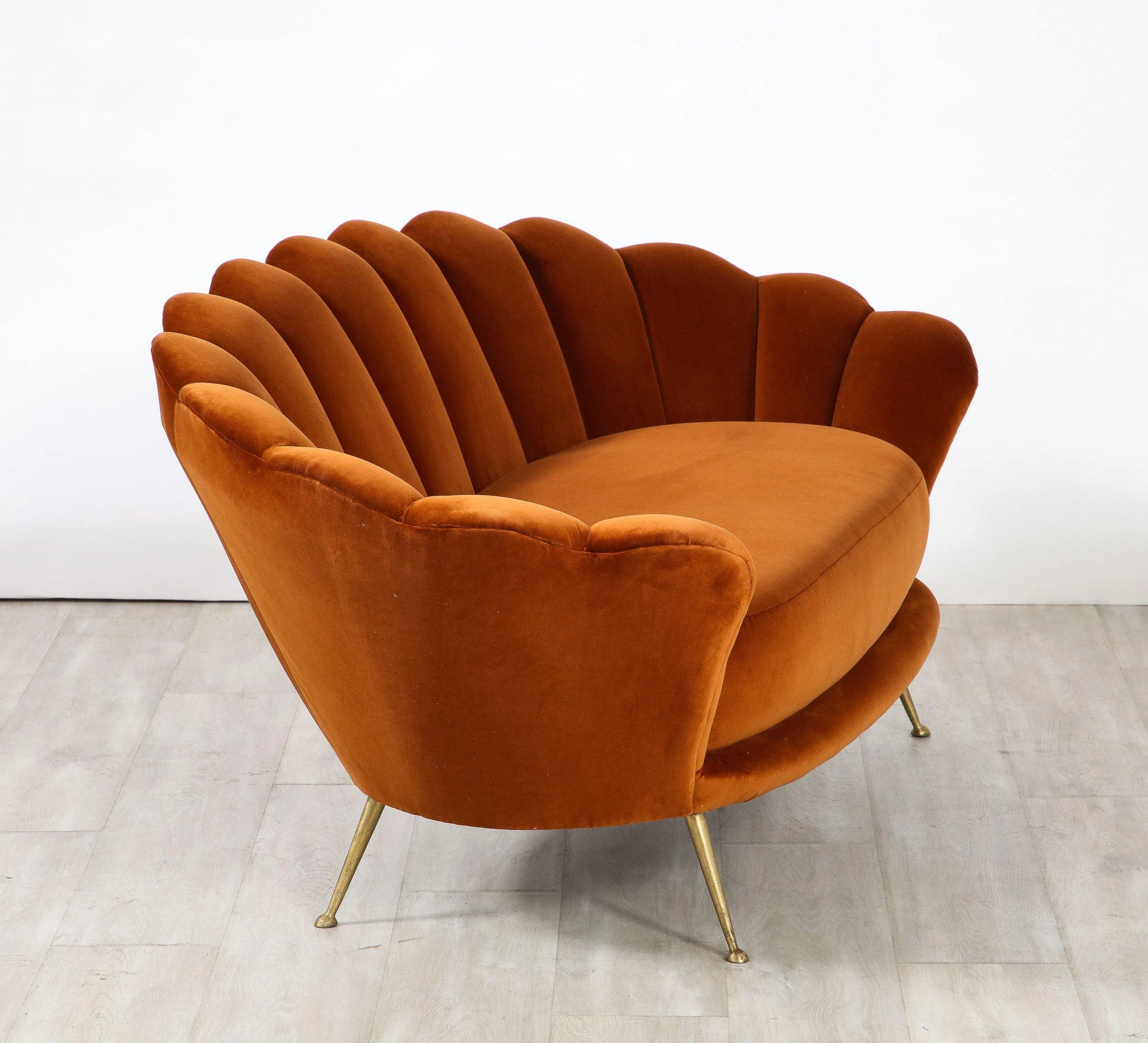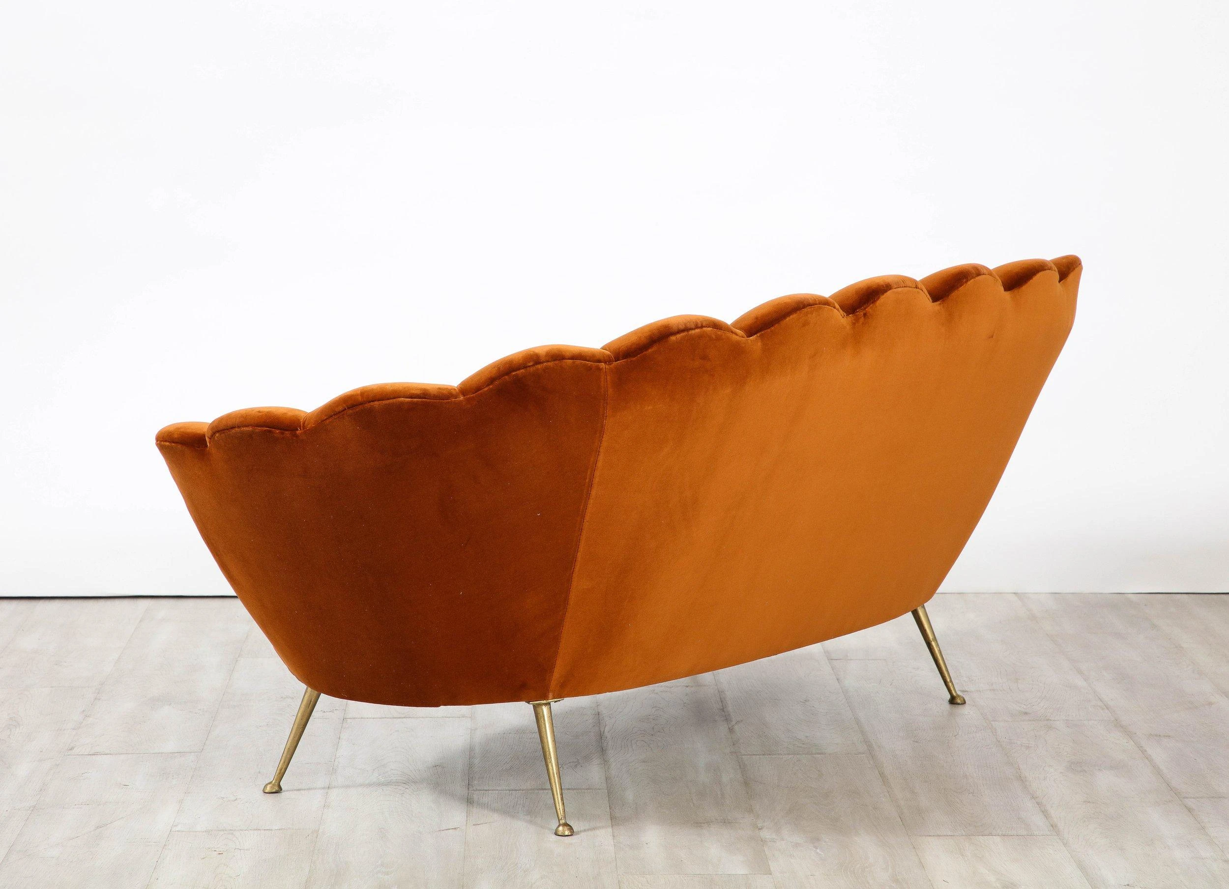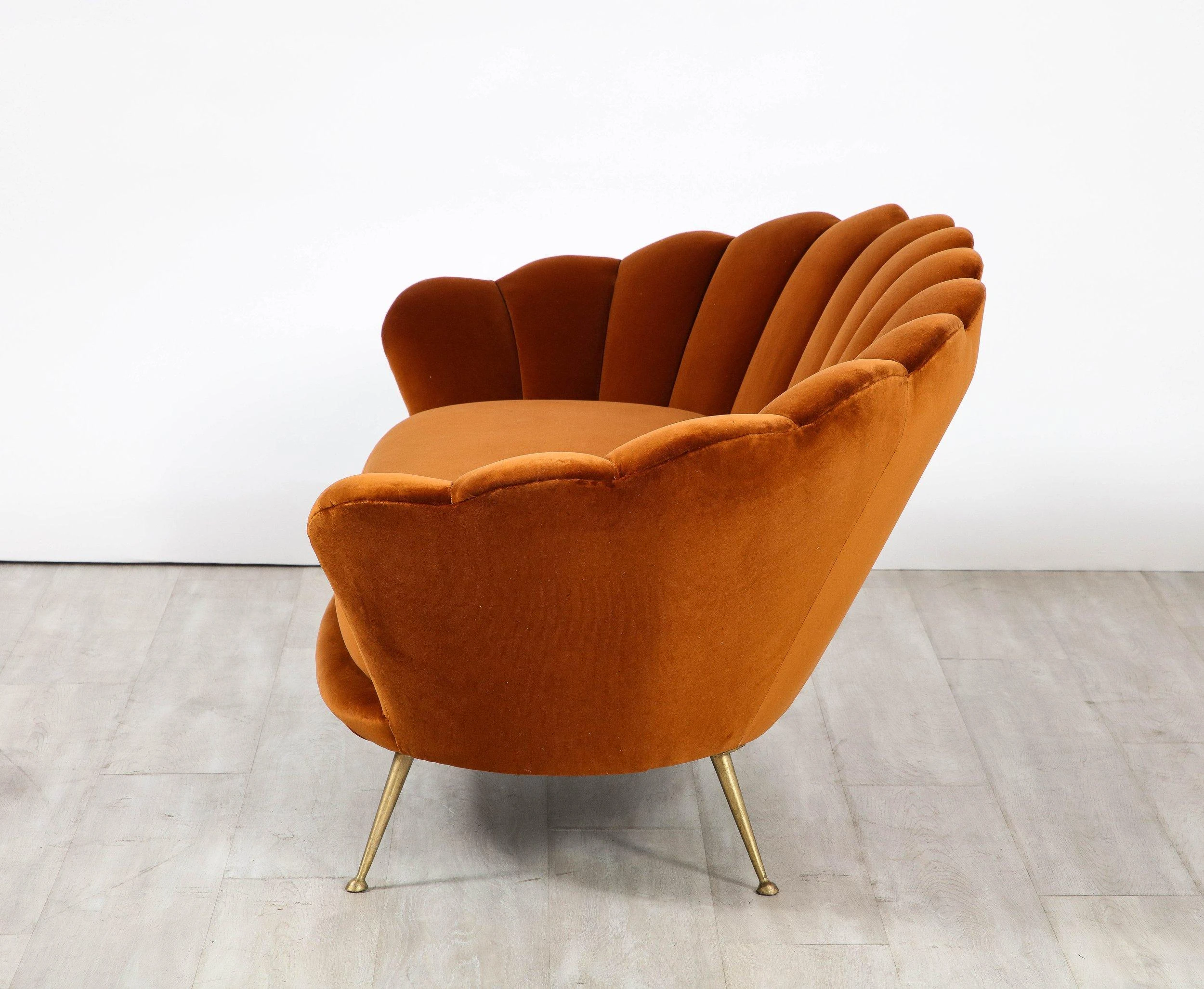 A decadently designed Italian 1950’s settee with a scalloped or petal shaped form and luxuriously upholstered channeled back tufting. The settee has been fully restored and newly reupholstered in a rich apricot colored cotton European velvet. The seat rests upon elegantly splayed brass legs. A whimsical, charming and unique design of the Italian mid-century.