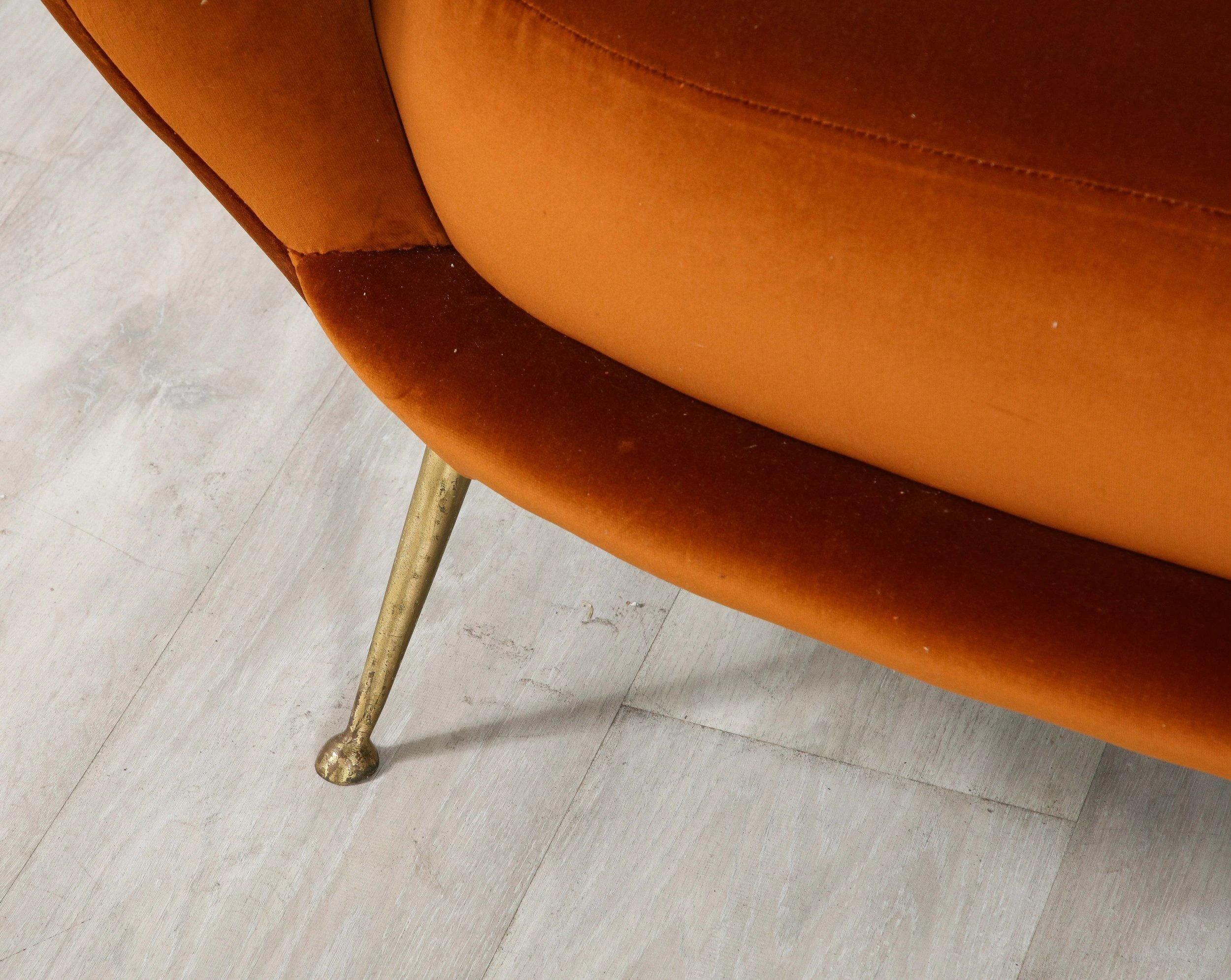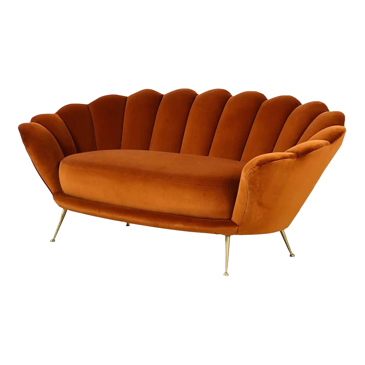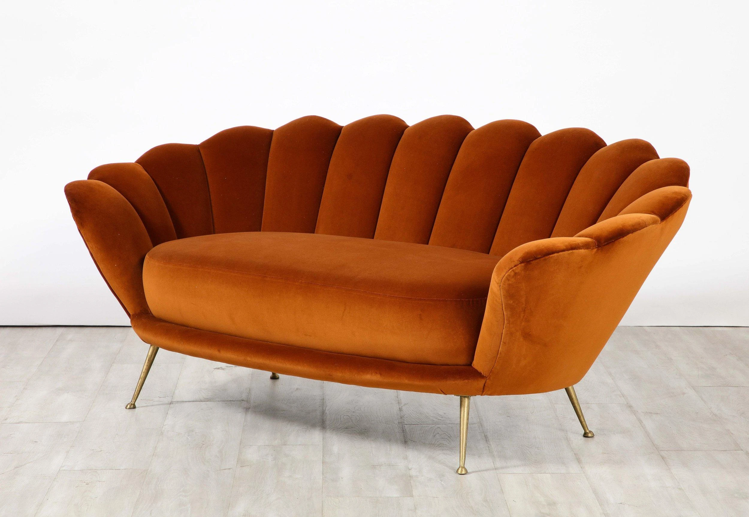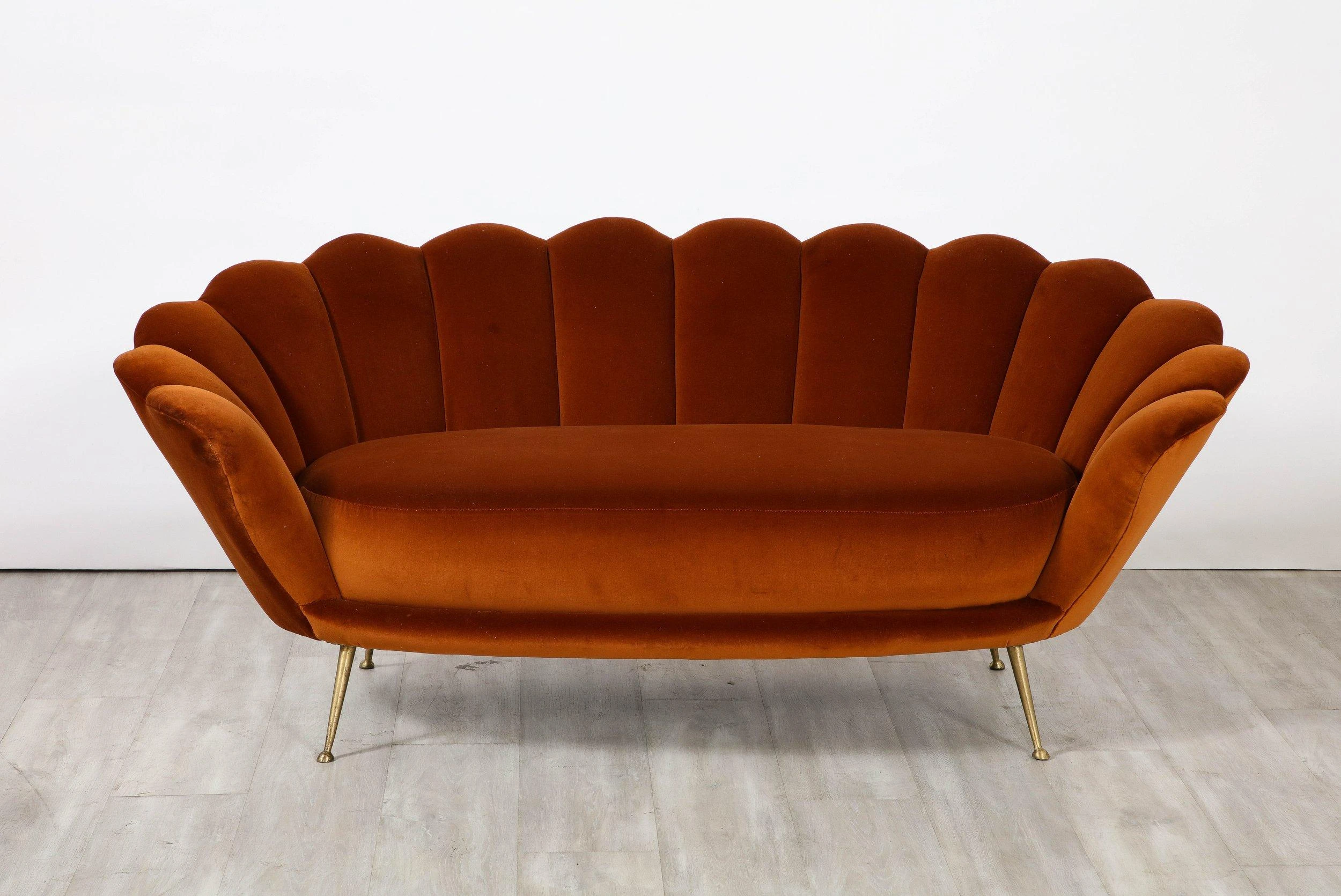A decadently designed Italian 1950’s settee with a scalloped or petal shaped form and luxuriously upholstered channeled back tufting. The settee has been fully restored and newly reupholstered in a rich apricot colored cotton European velvet. The seat rests upon elegantly splayed brass legs. A whimsical, charming and unique design of the Italian mid-century.