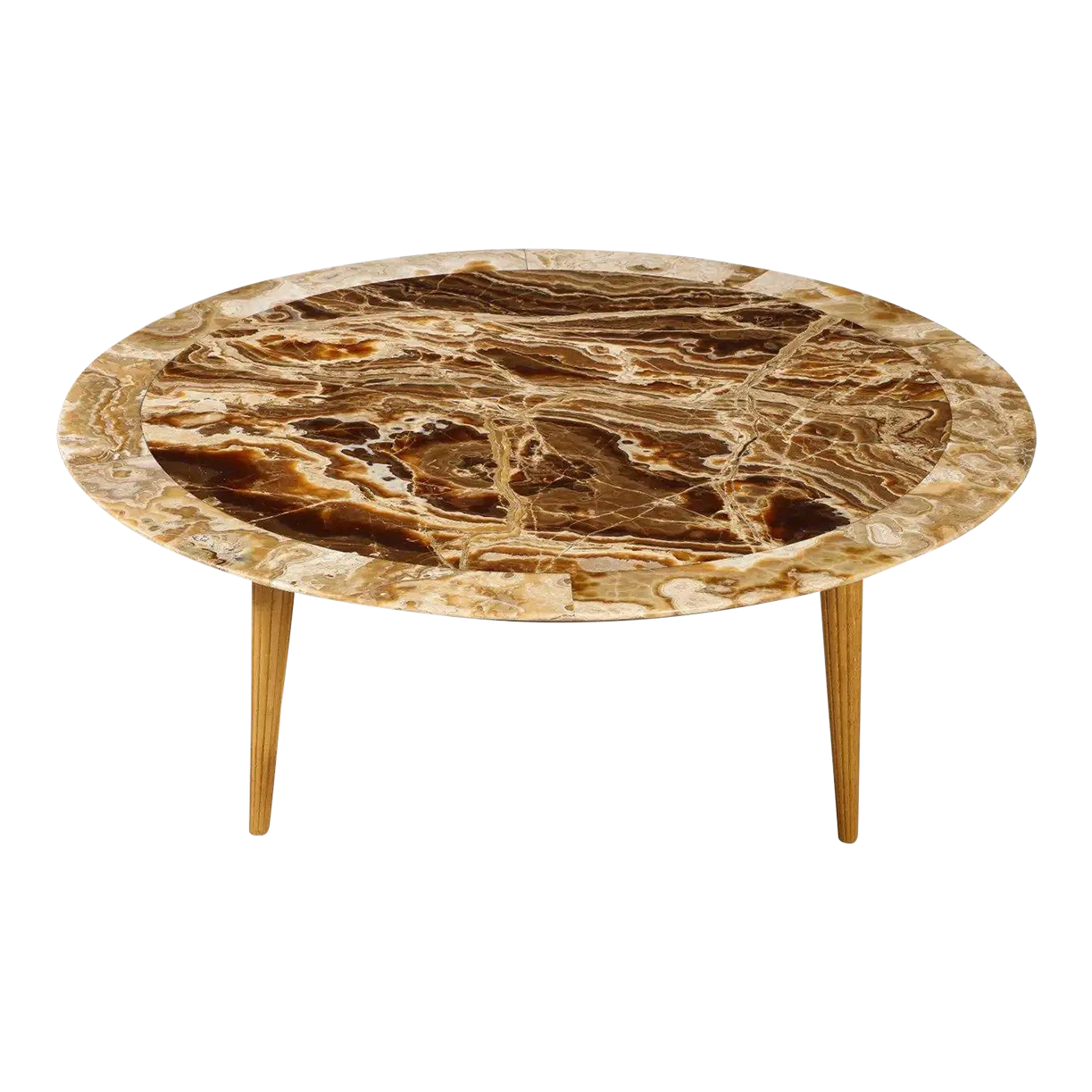 Italian 1960’s grand circular coffee table, the top in a spectacular agate, with the outer border being a lighter coloration which highlights the central section and oak legs wonderfully. The top rests upon four fluted and tapered oak legs. The combination of the agate and oak is stunning. A highly unique and beautiful piece.