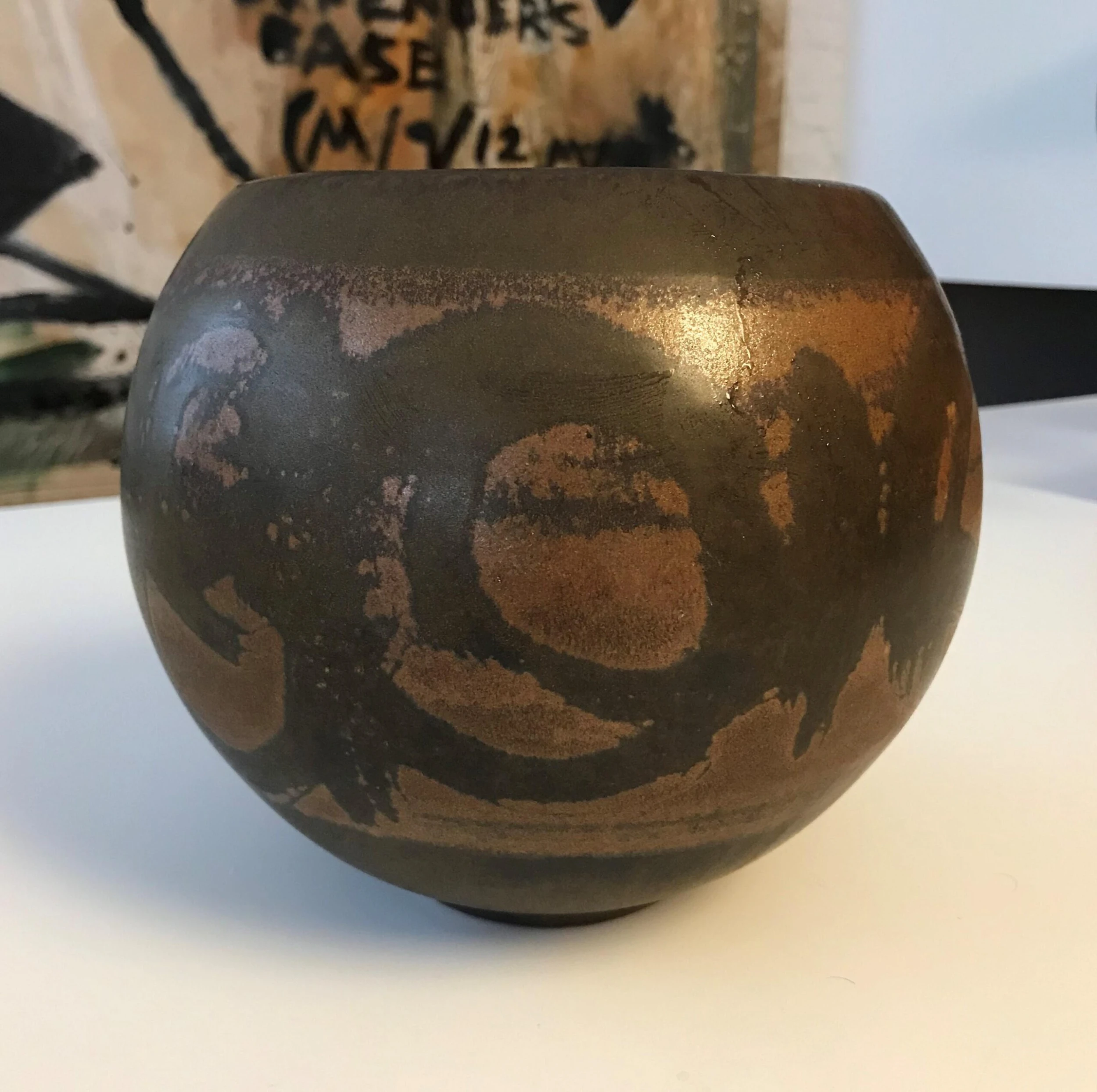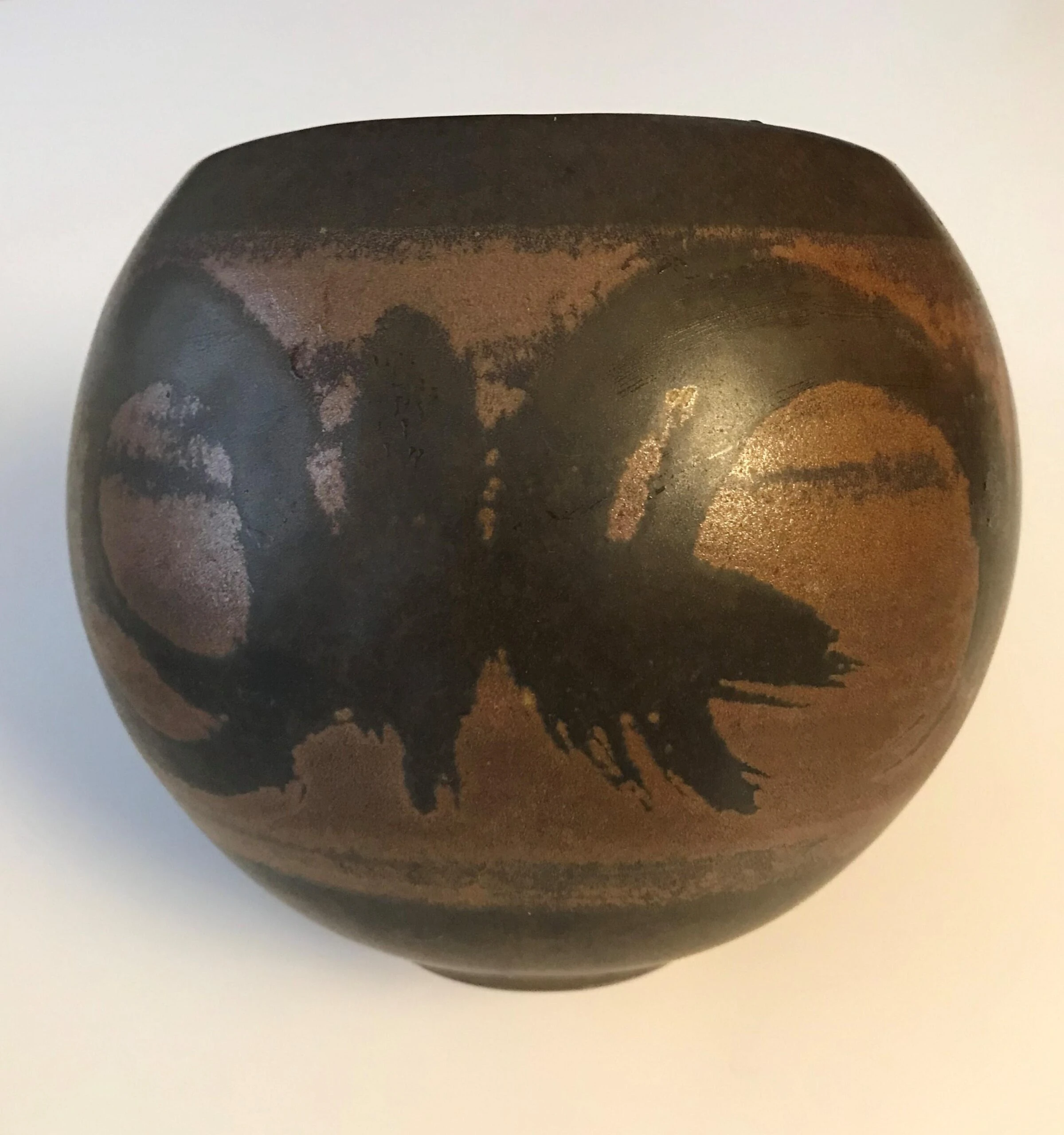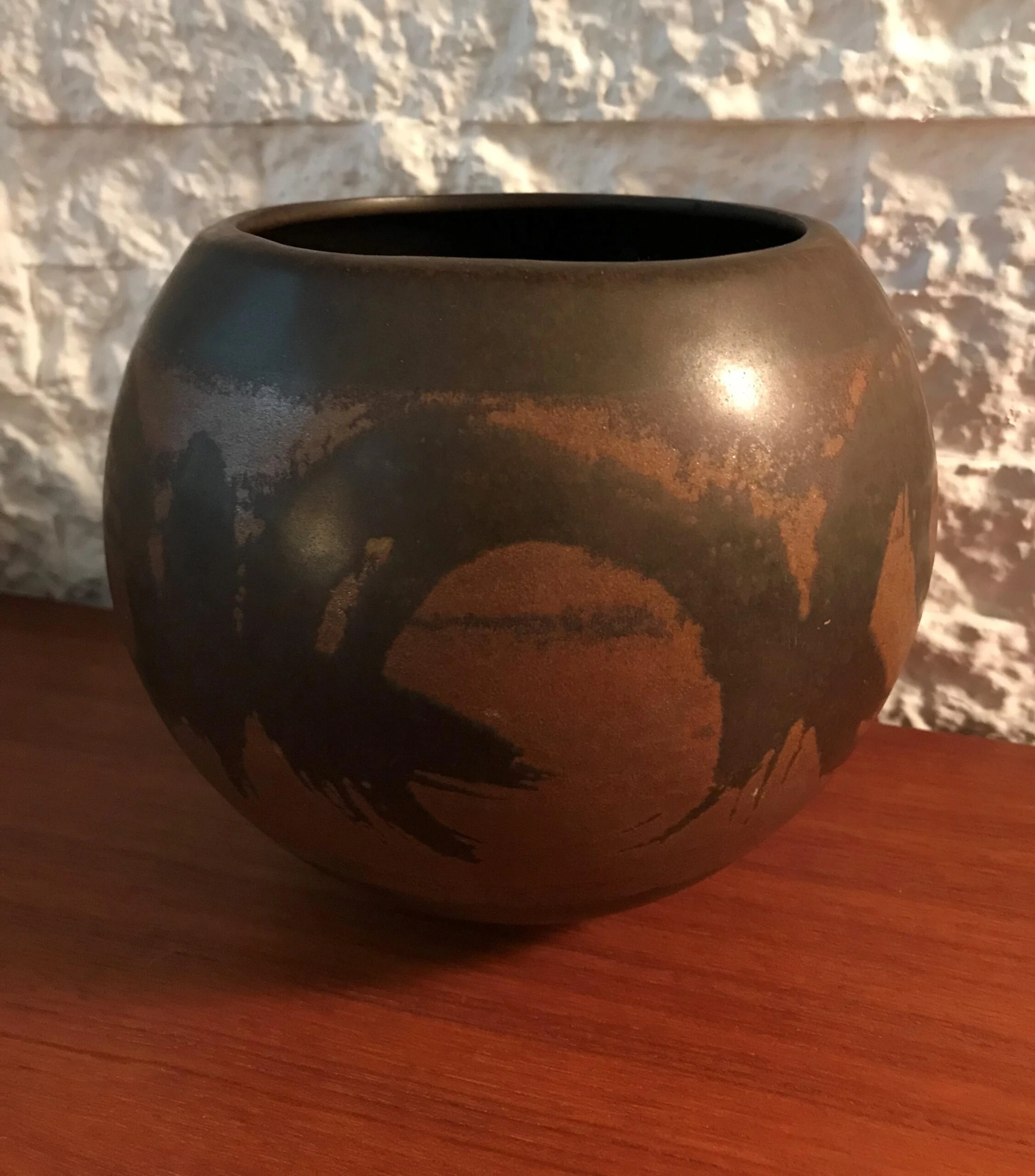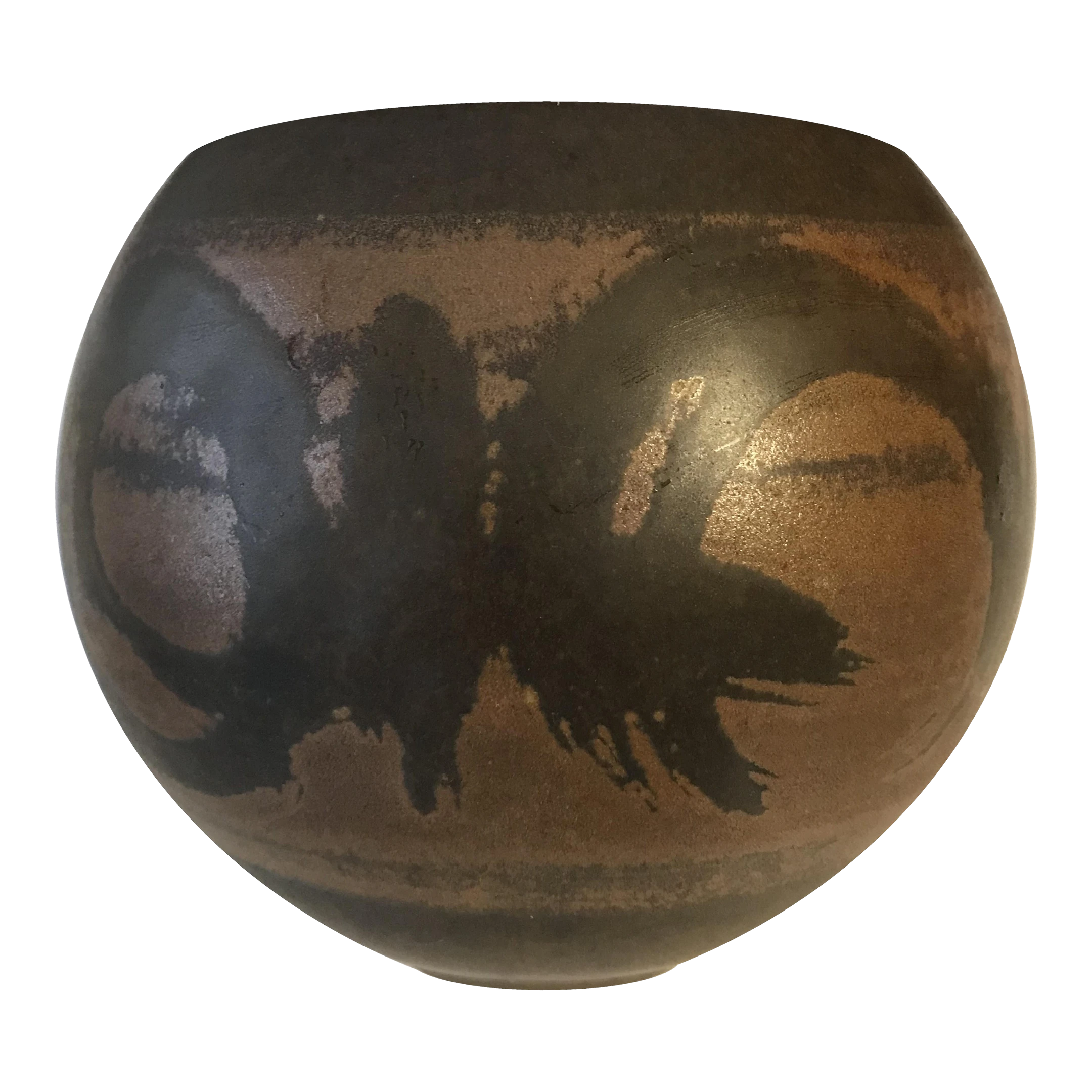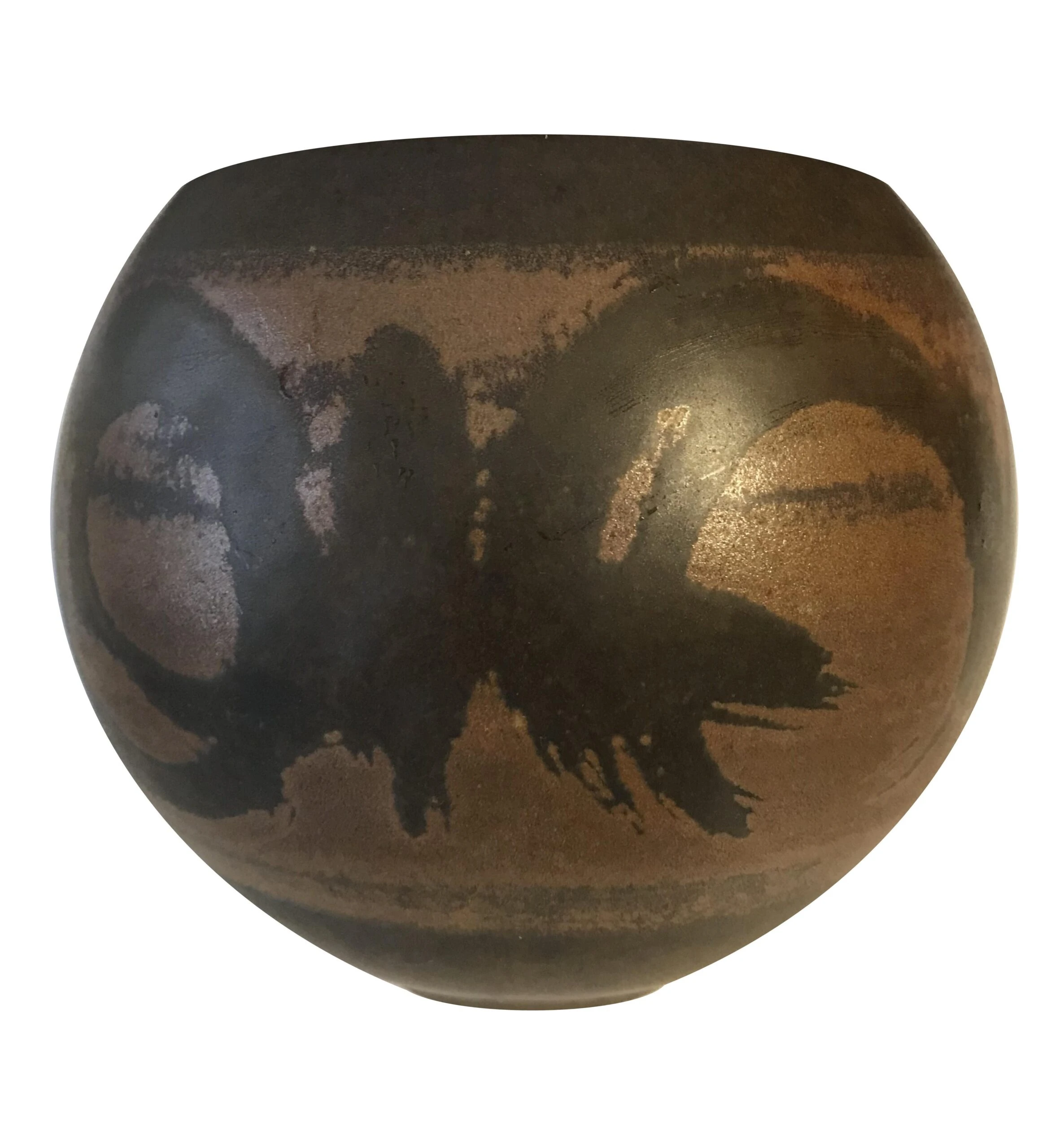 Stunning, multi-color large California Pottery Spherical Vase by Stoneware Designs West Studio. Abstract brushstroke design pattern all the way around with a combination mat and subtle gloss finish. The brown matt abstract pattern is set against a copper glaze that has a luster finish which adds depth and interest.