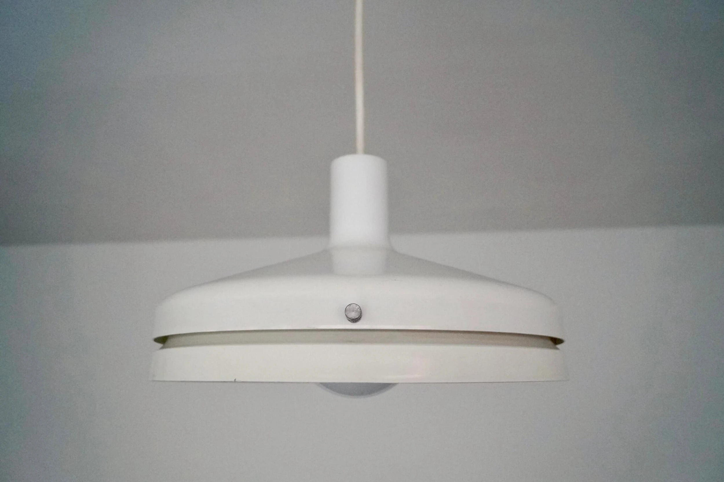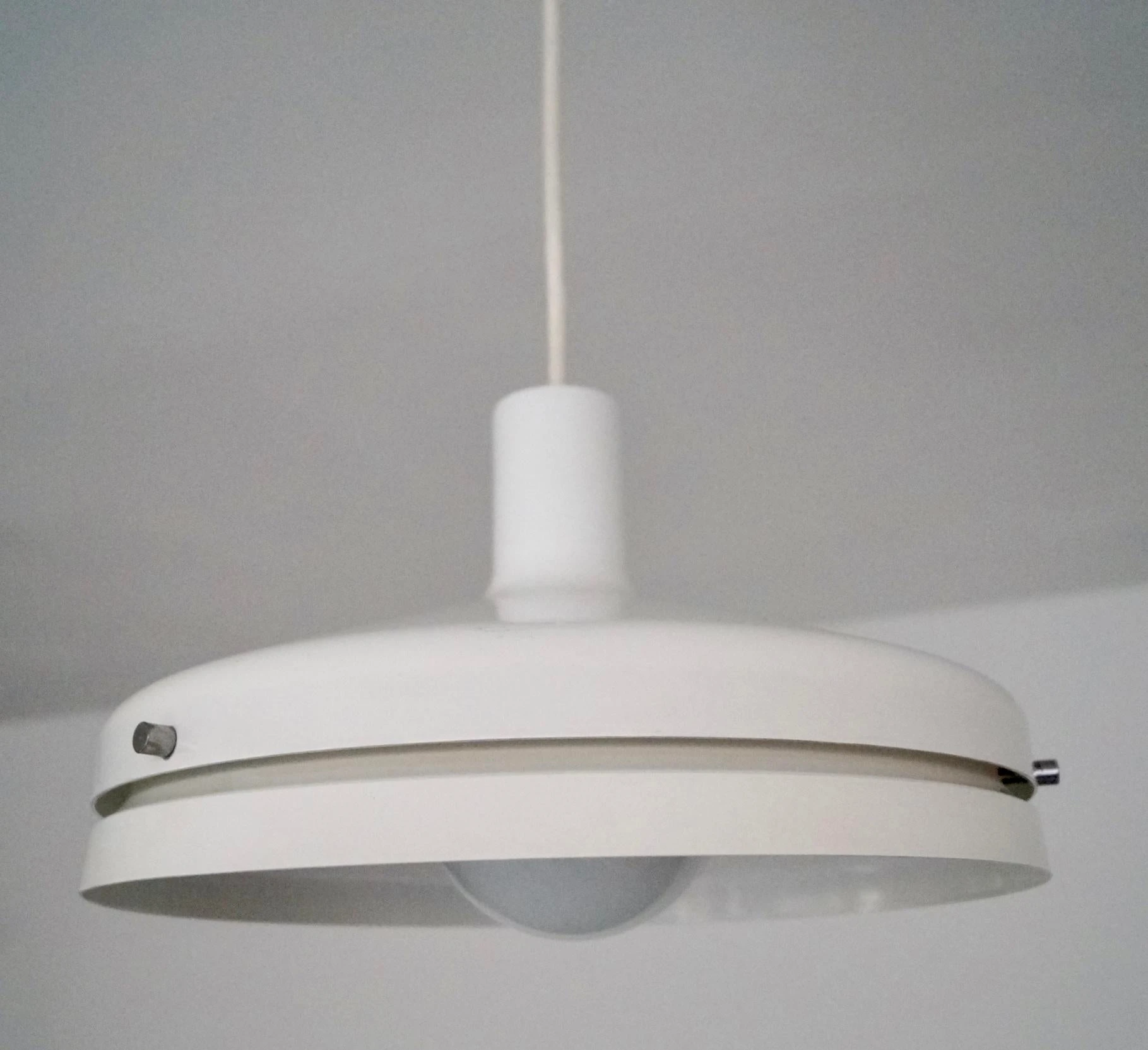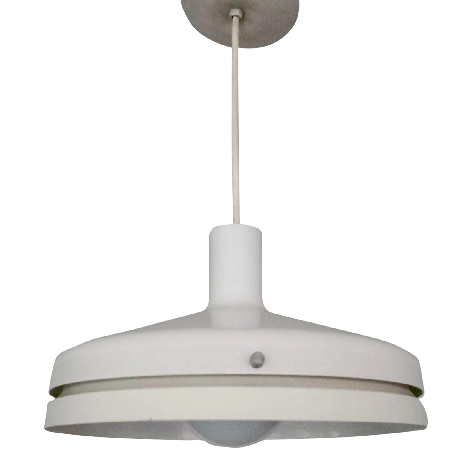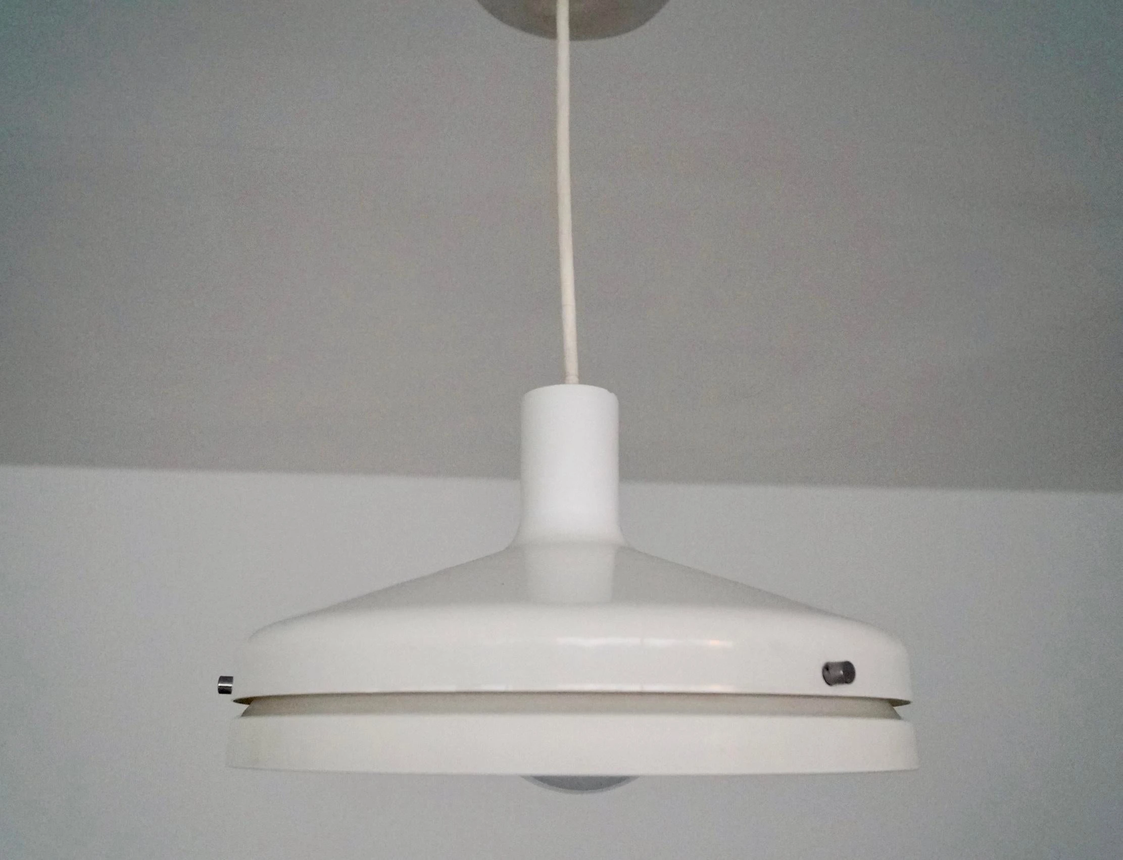 Vintage Mid-century Modern pendant for sale. From the 1950’s, and in excellent condition. It’s in great working order, and is ready to be installed. It’s white enameled aluminum with chrome accents, and has a space-age design. It’s a great size, and would work as a ceiling light chandelier.