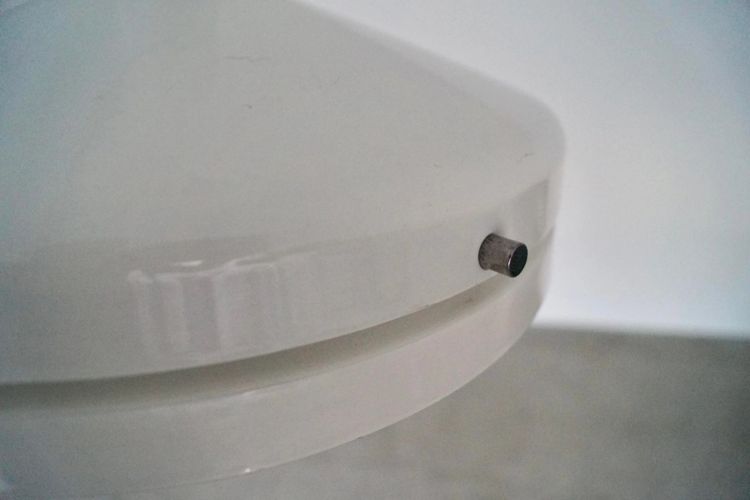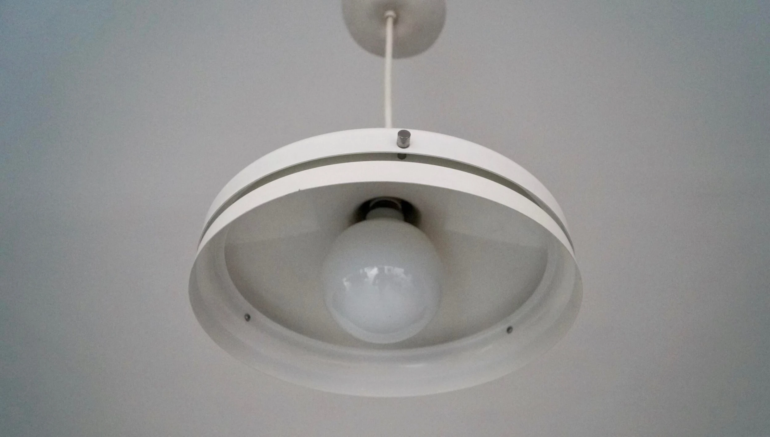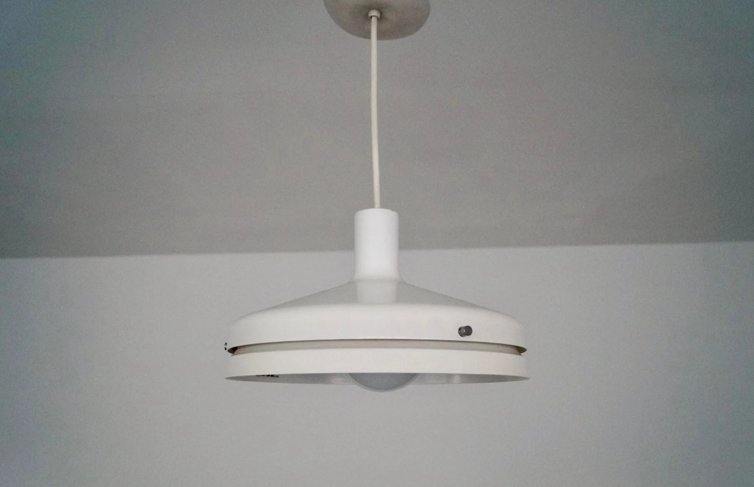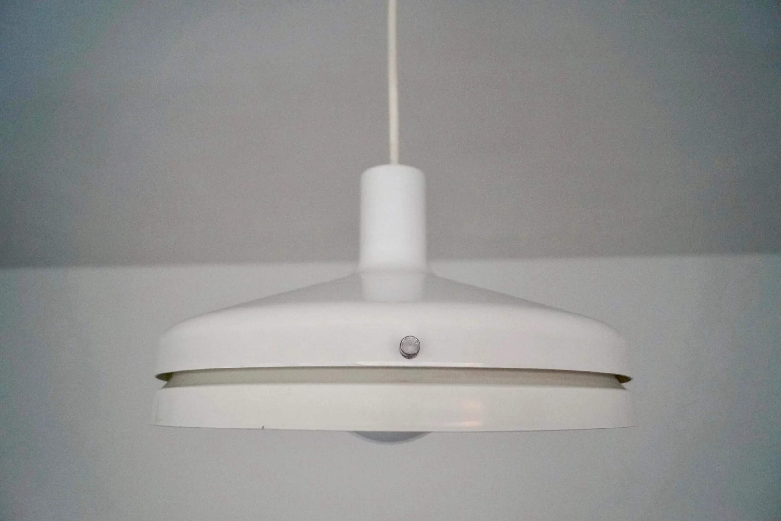 Vintage Mid-century Modern pendant for sale. From the 1950’s, and in excellent condition. It’s in great working order, and is ready to be installed. It’s white enameled aluminum with chrome accents, and has a space-age design. It’s a great size, and would work as a ceiling light chandelier.