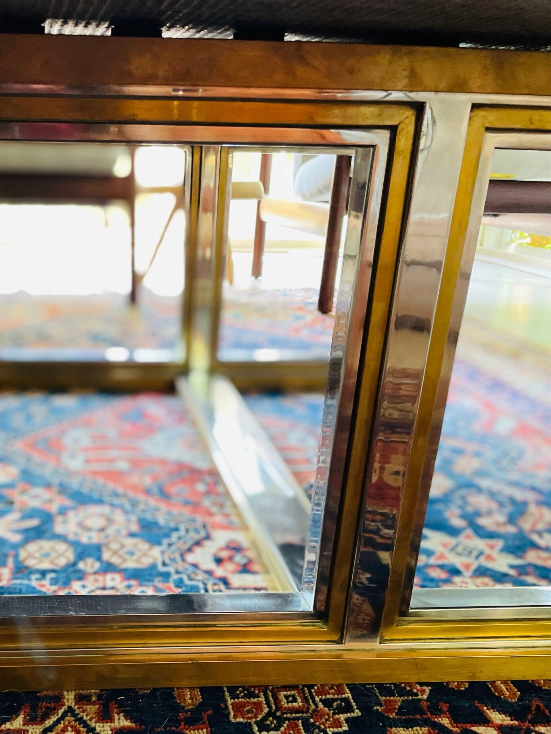 The Black Marquina Marble Slab is in perfect condition with no scratches. The base in chrome and brass shown very little aging and no scratches. The table is in perfect vintage condition.