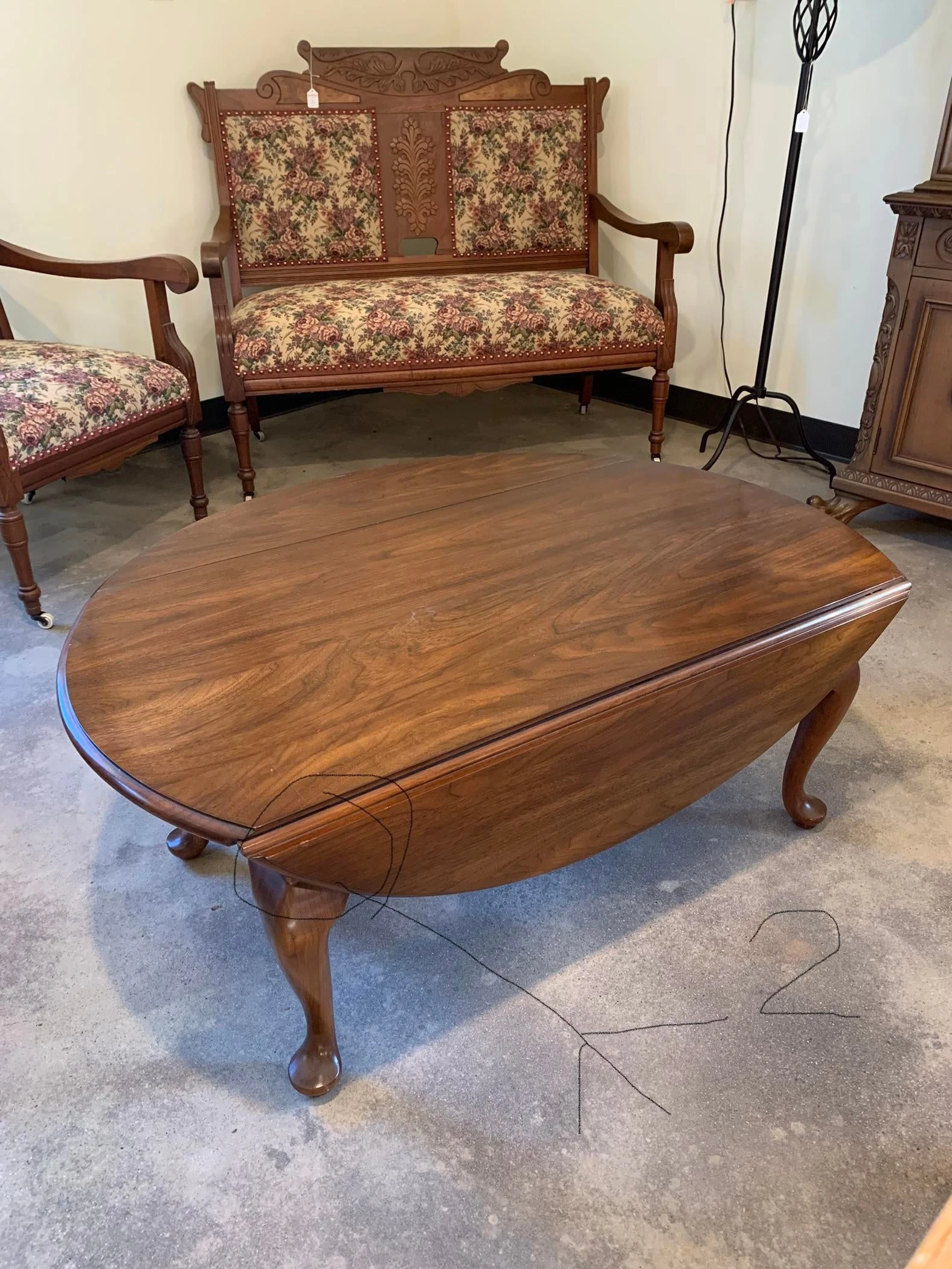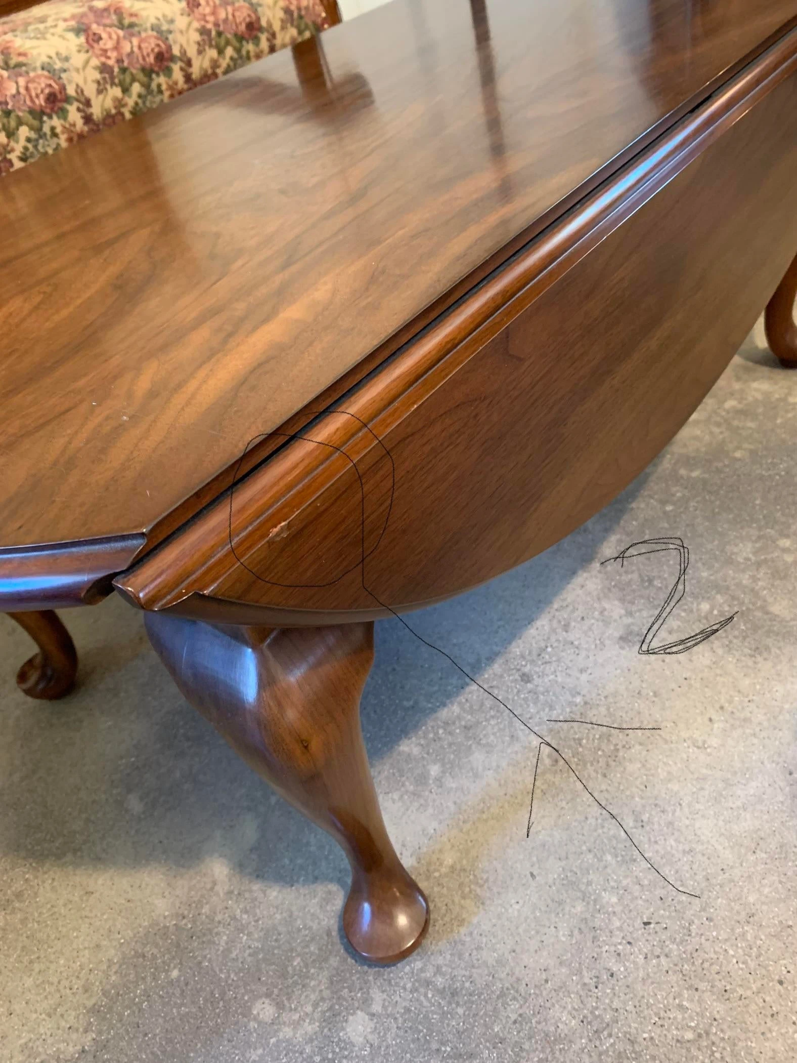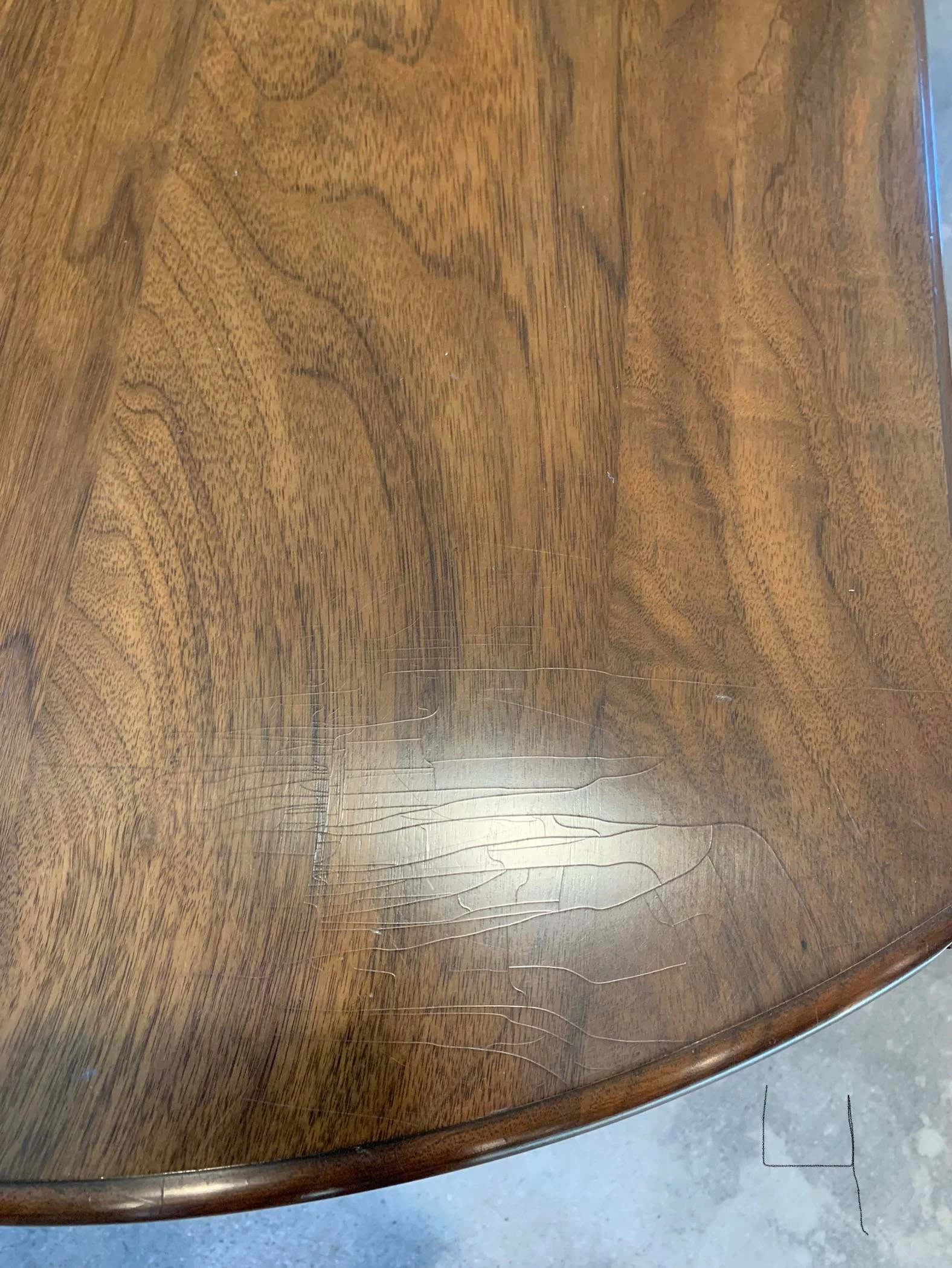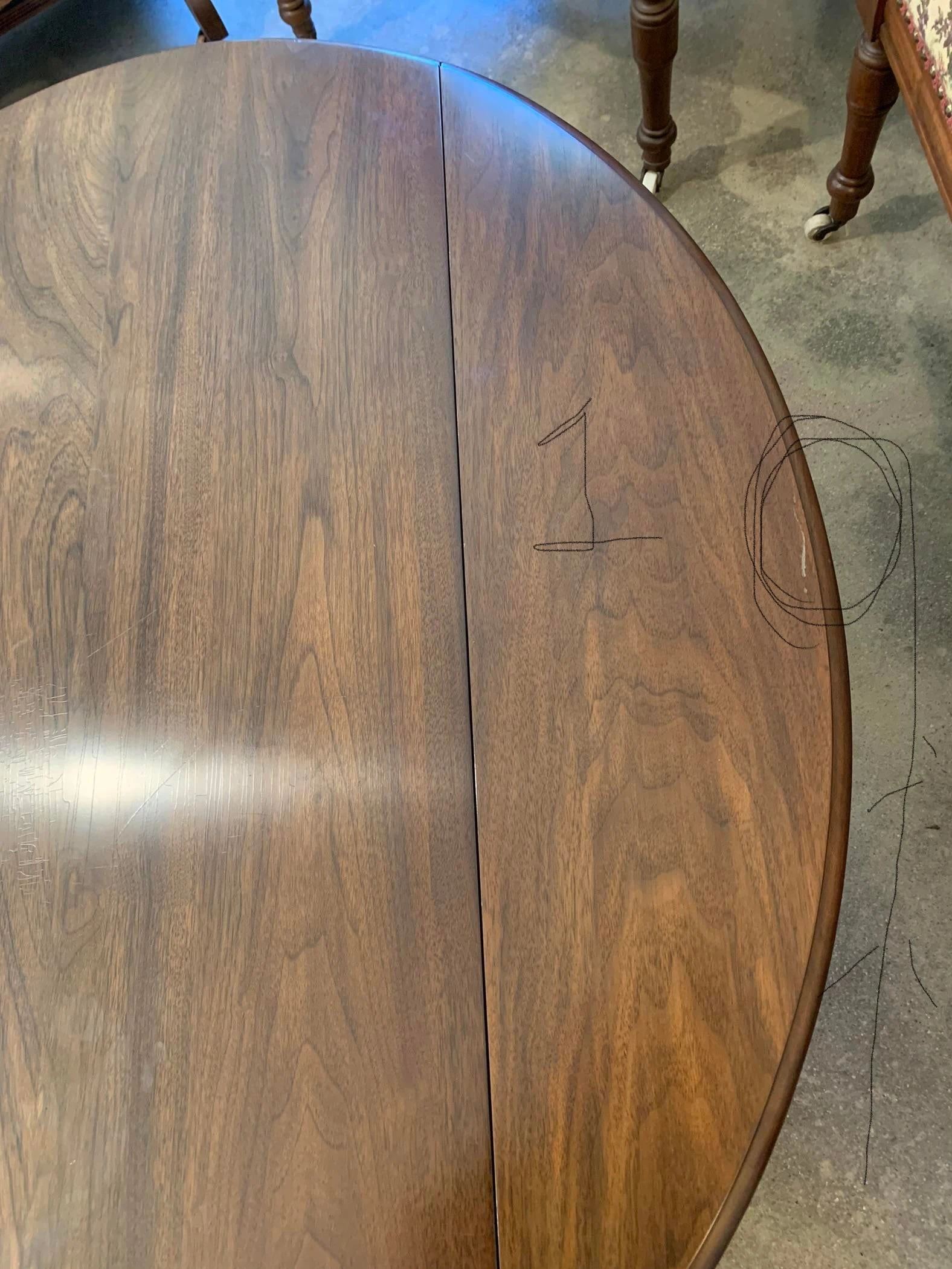 4) Across the top of the table. The top of the table is Checking. (Erratic cracklings running across the coating). Only noticeable when a direct light is shining on the table. Hard to even notice.