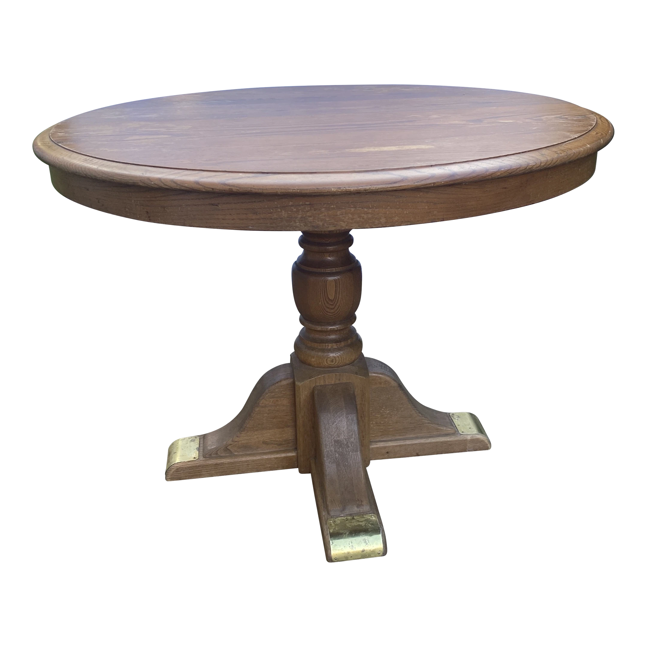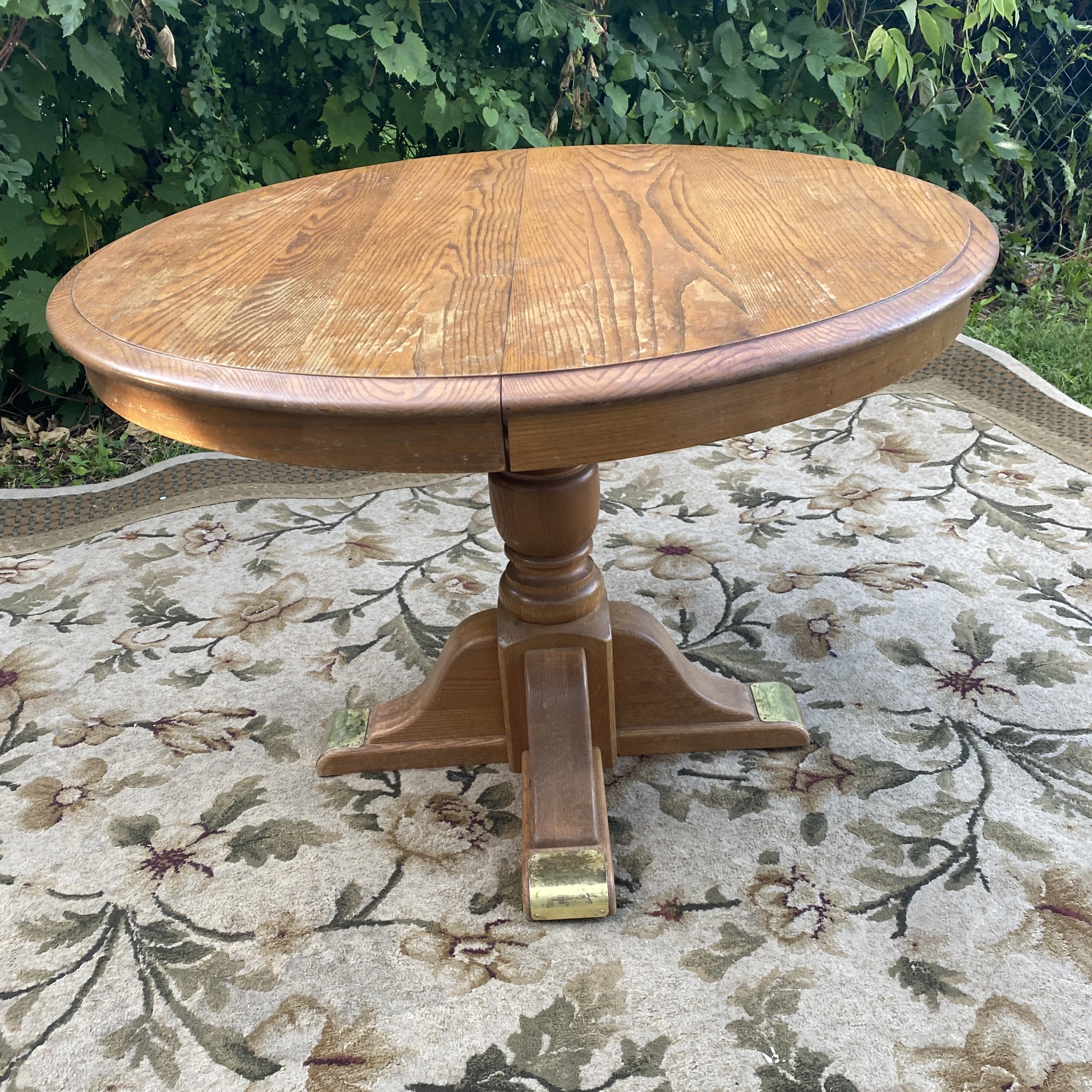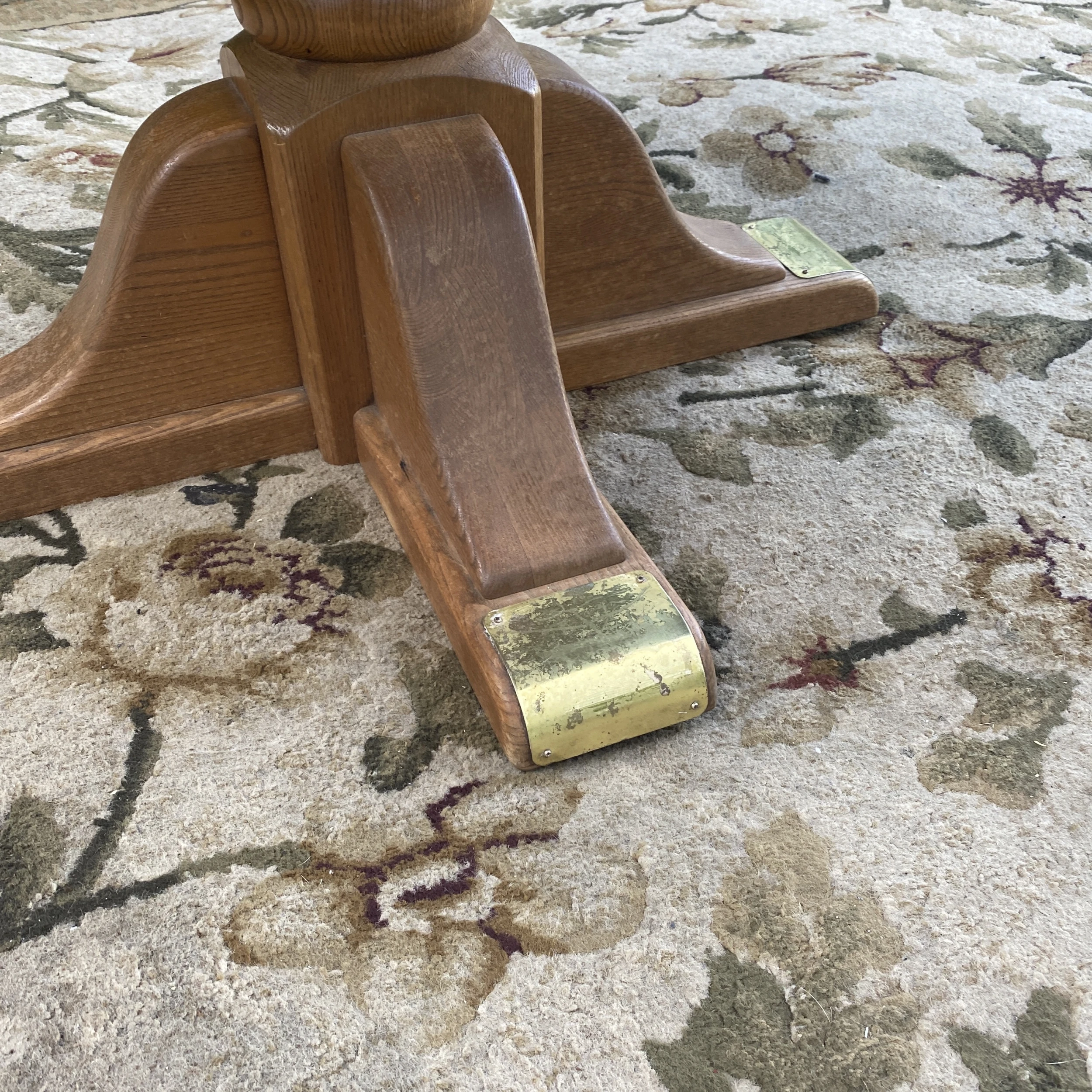 Chairs listed by the same shop. Research indicates S. Bent and Bros Gardner Mass made ample furniture from Ash. This piece appears to be Ash when compared to other S. Bent items that are clearly quarter sawn oak. The piece came from a second owner and a Chicago estate. The leaf was lost at some point. Noted features include a bevel type edge and brass toe kicks. The table is most likely mid-century when compared to other pieces made the company in the 1980-1990s. The top is well worn and was recently lightly sanded with a thin coat of satin poly. The look of the set is worn, used, and vintage. Refinishing the top will take heavy sanding and maybe delicate planning in order to get to bare wood that takes the stain. The chairs are almost to bare wood with no sealing and could benefit from coat of poly if that is the look desired. The table is very sturdy and heavy with the top bolting to the base.
