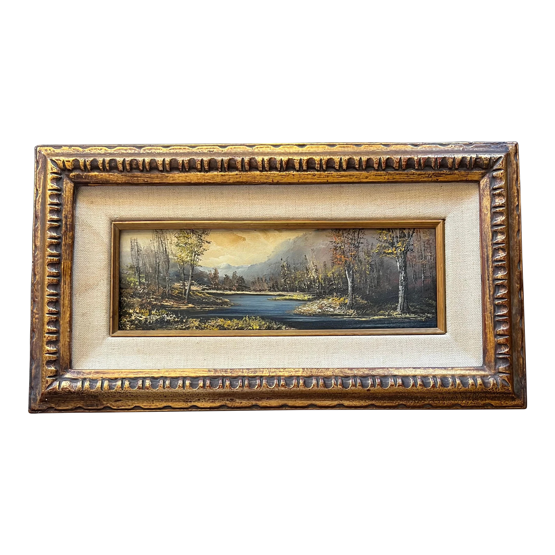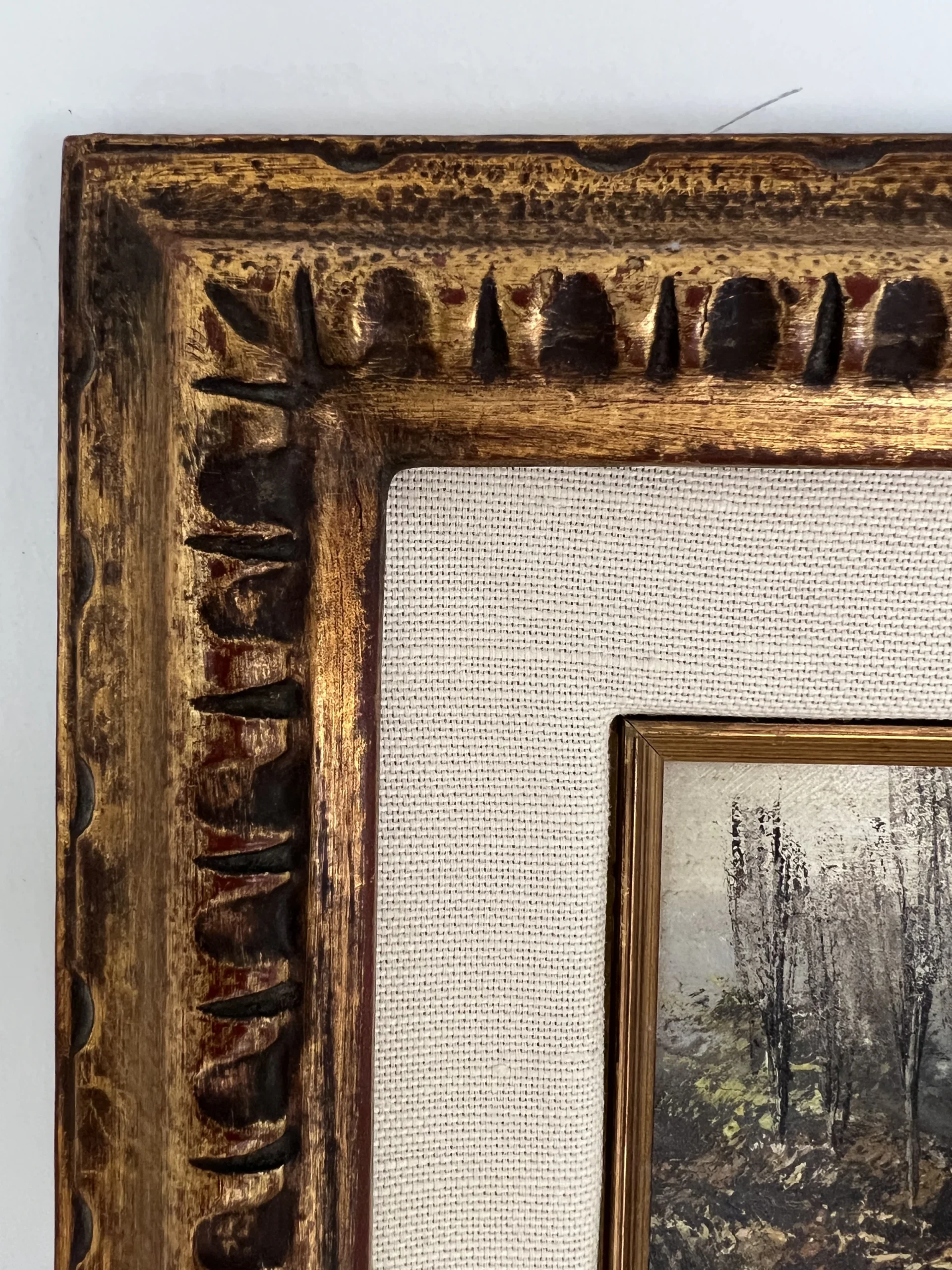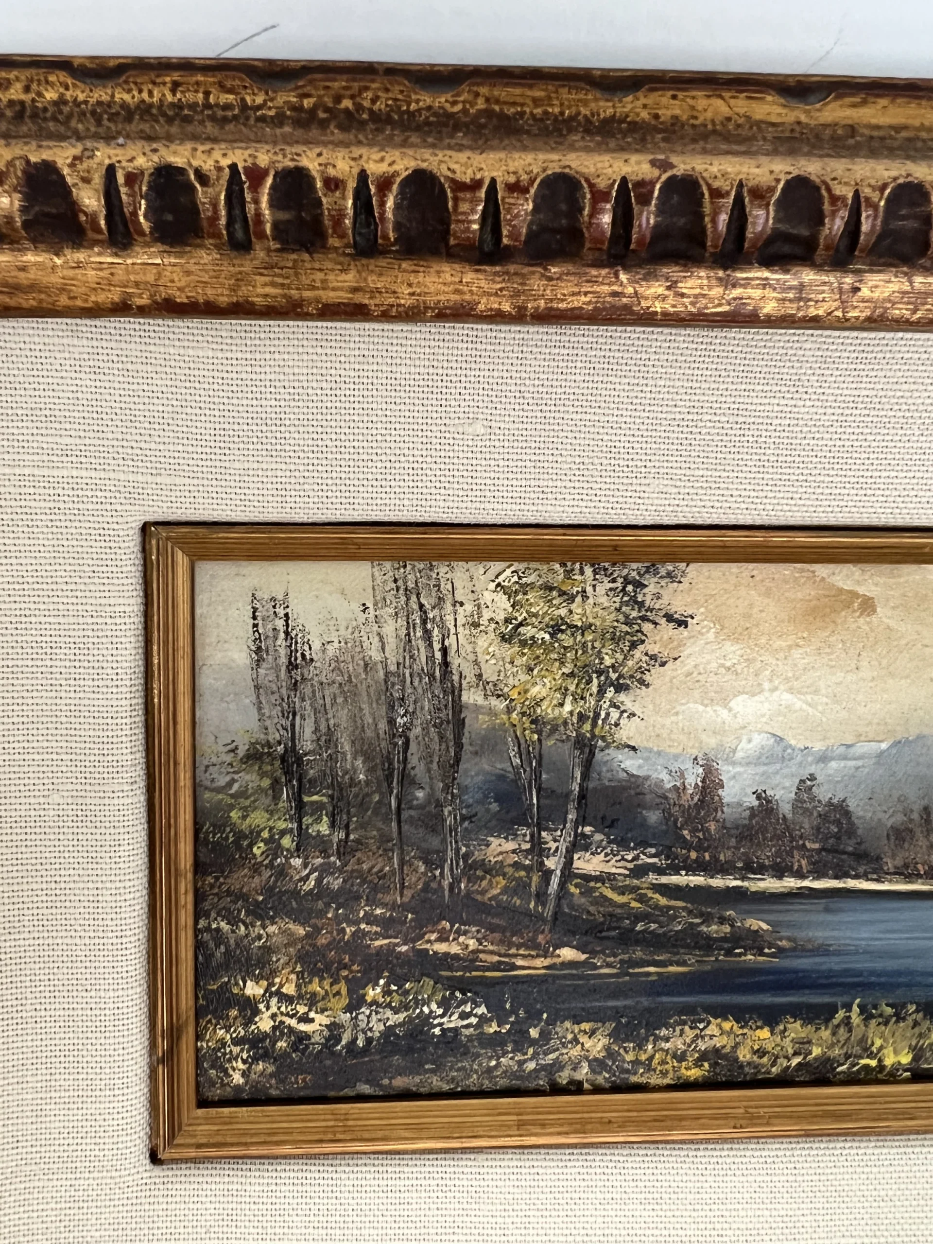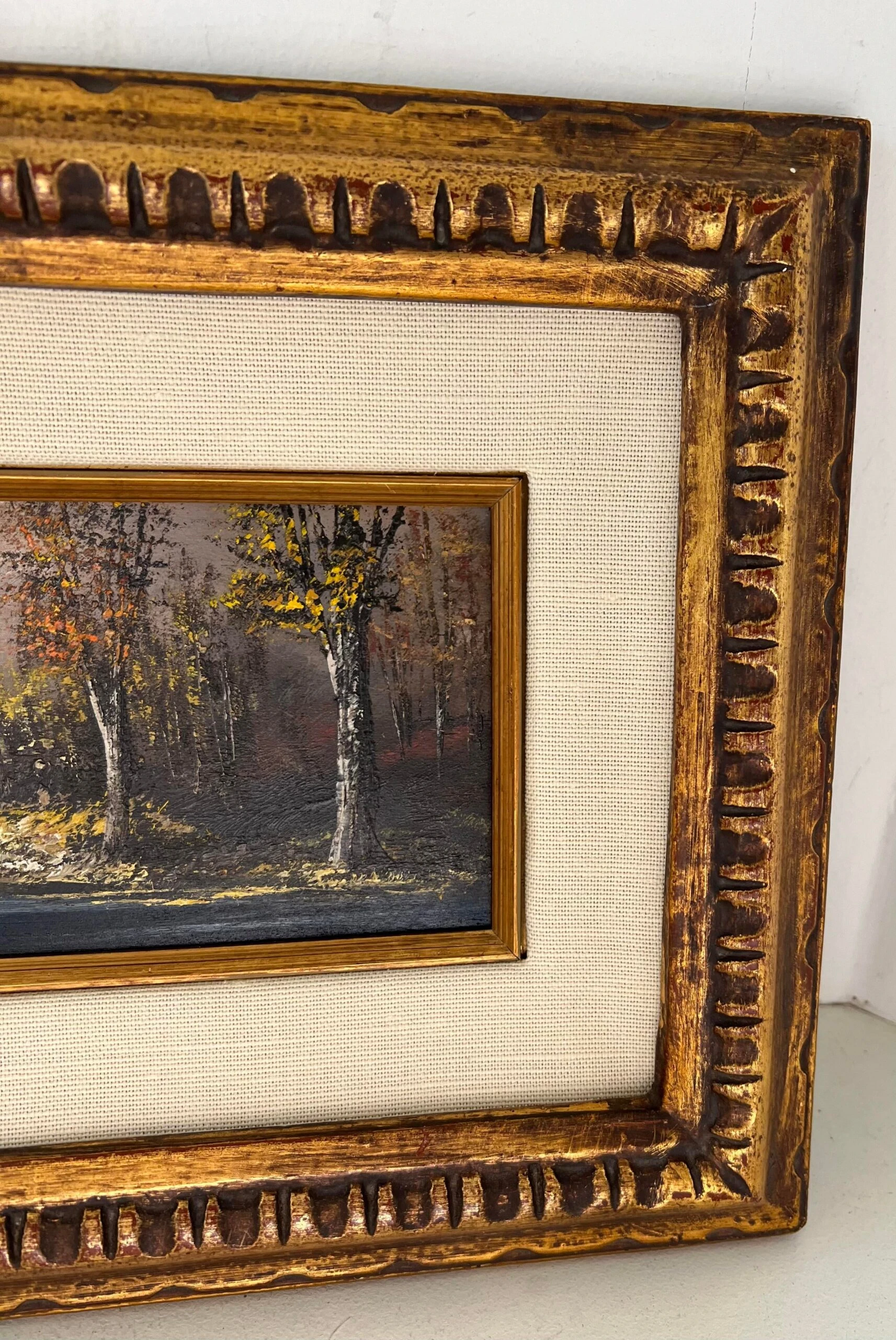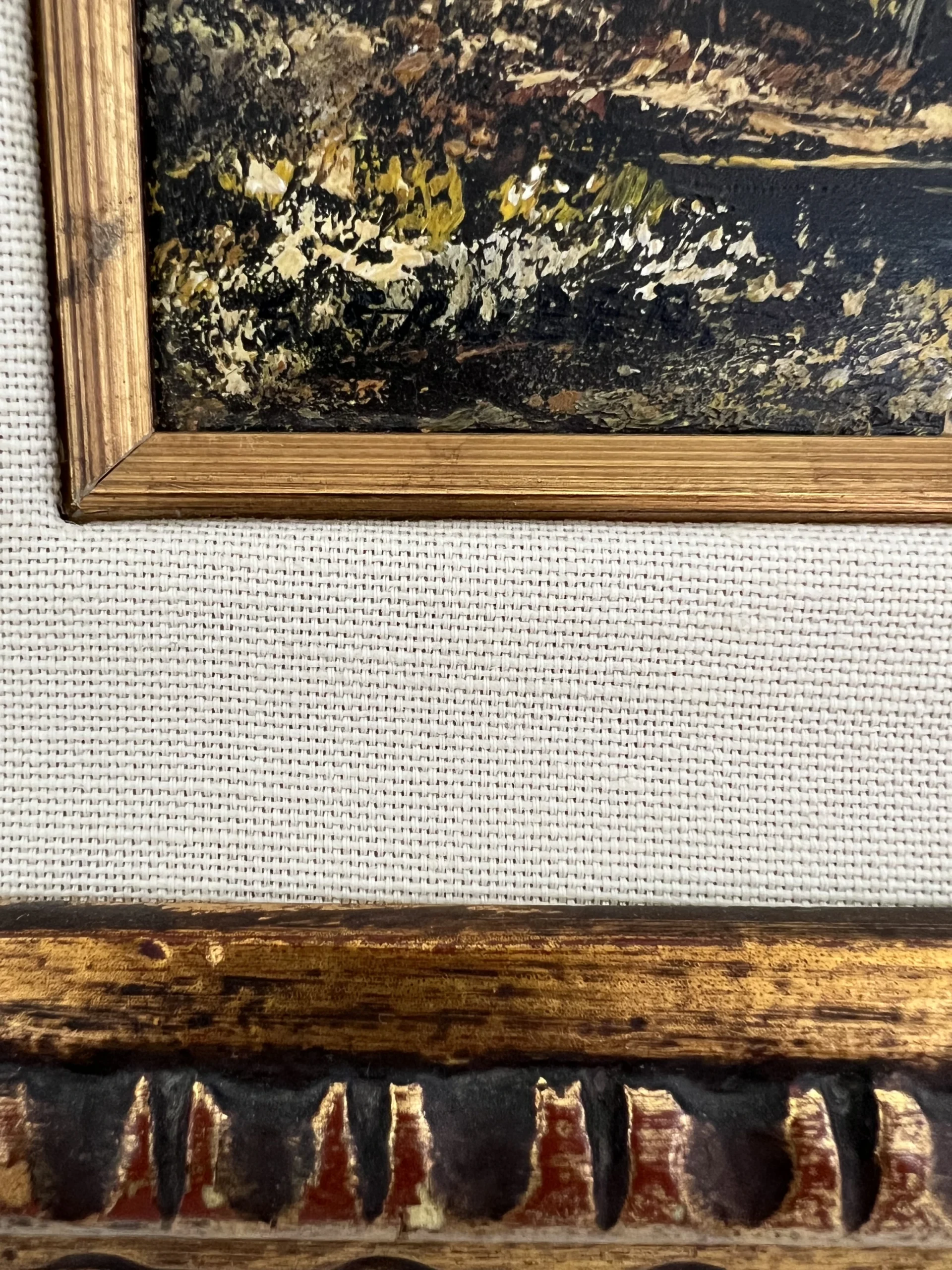 Oil on wood panel signed in the lower left corner, in original decorative gilt wood frame with jute liner.