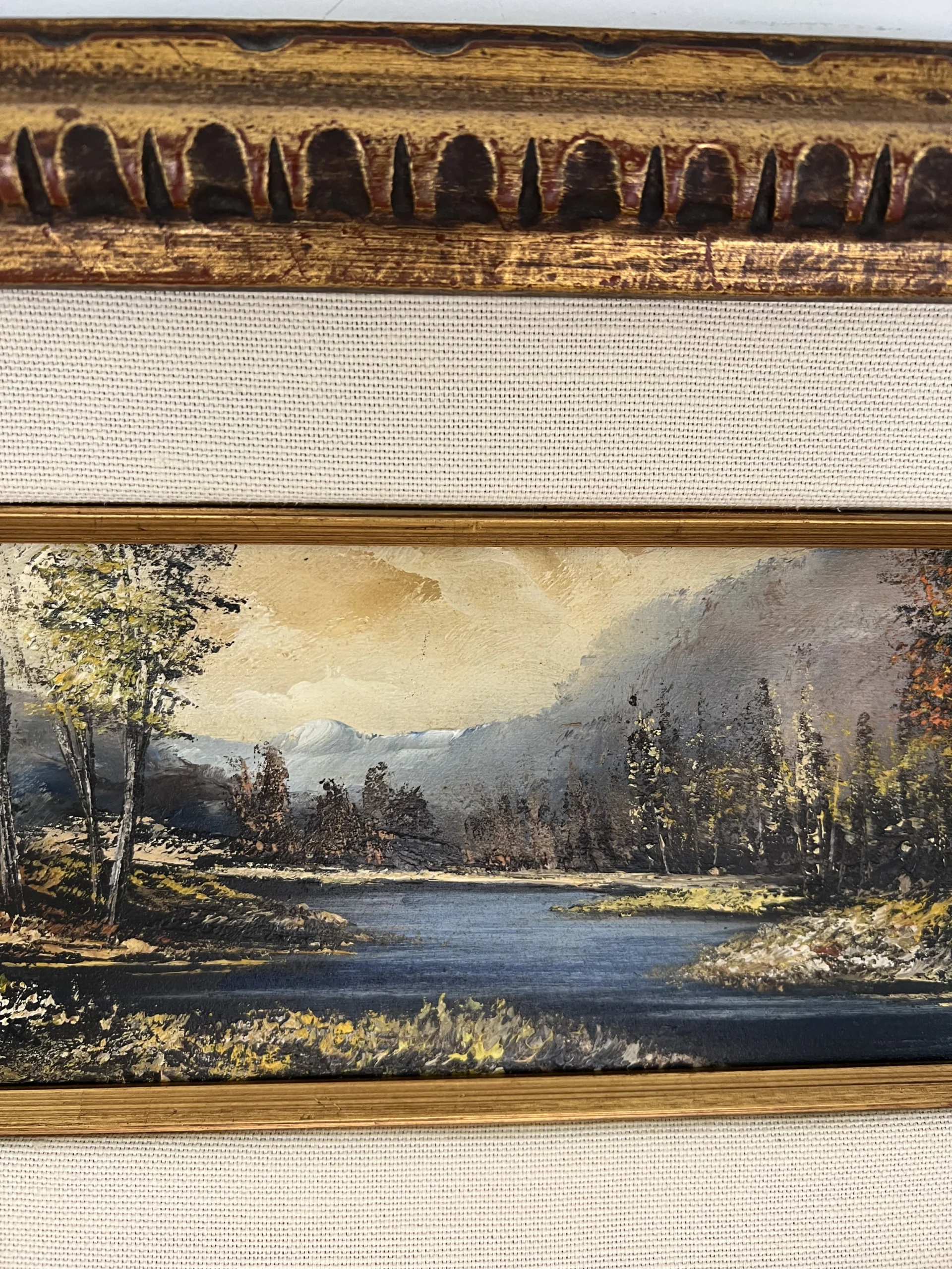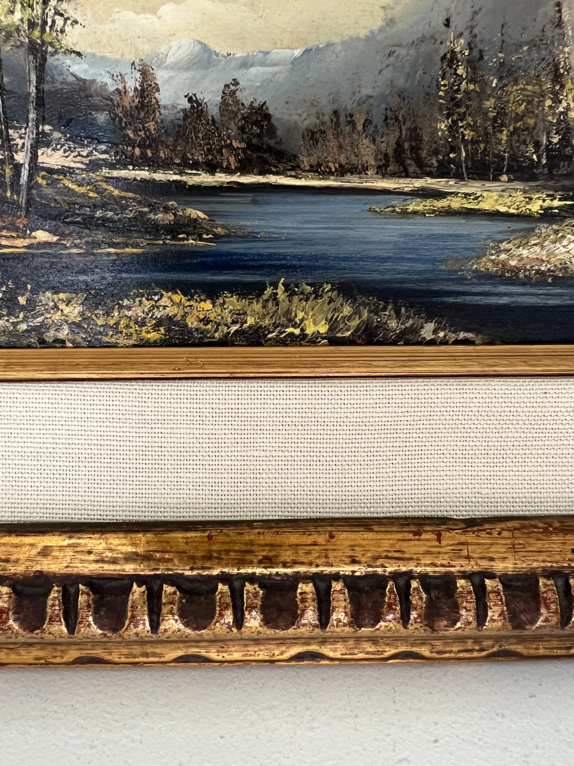 The movement of the stream draws the viewer into the painting that has a depth perception and perspective. a beautiful landscape painting that has a magnificent reflective quality of the mountains with autumn trees