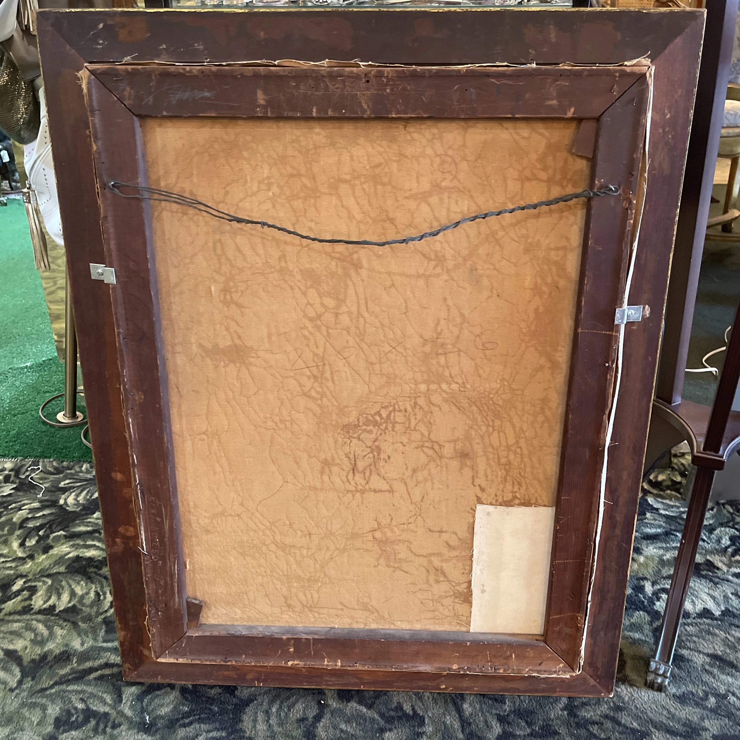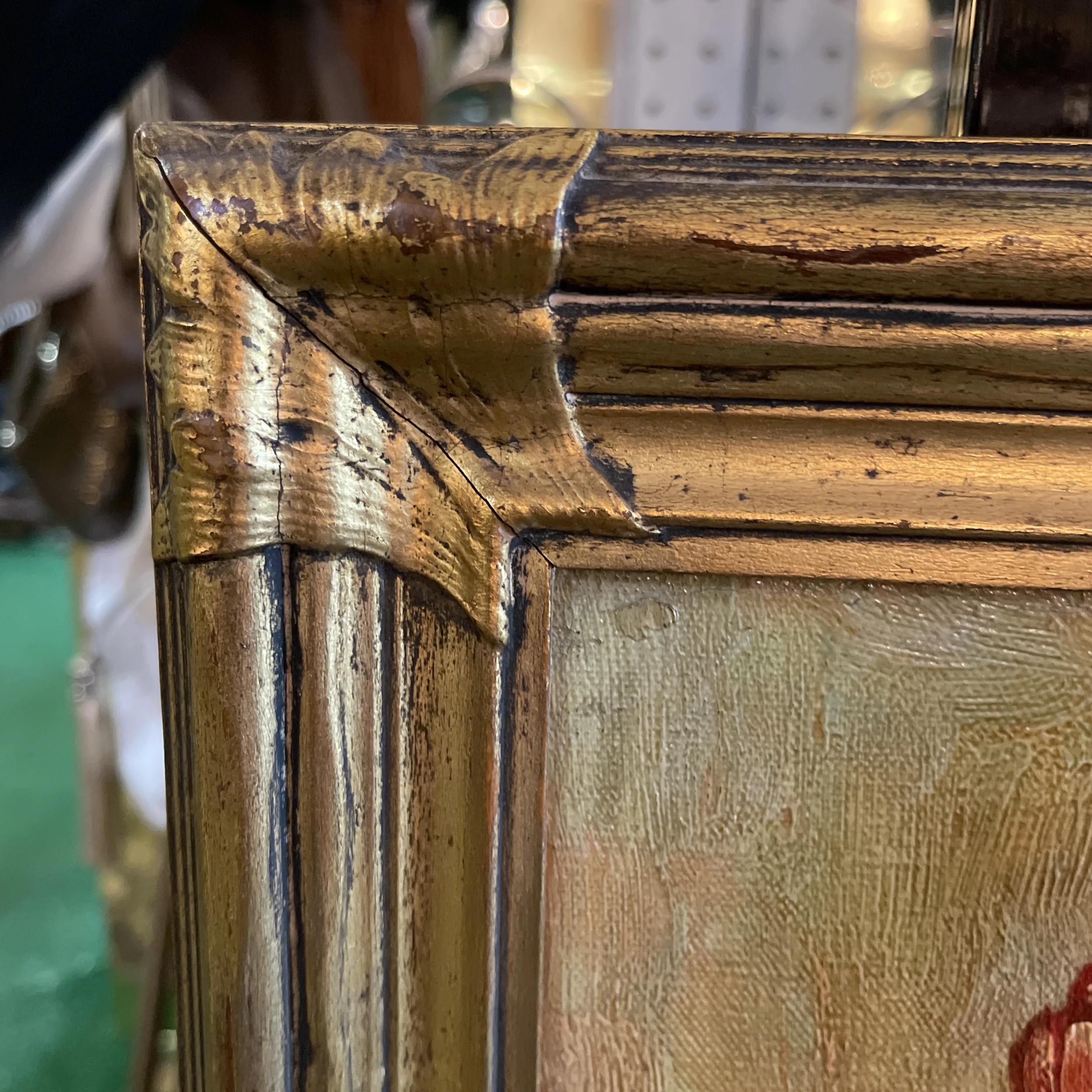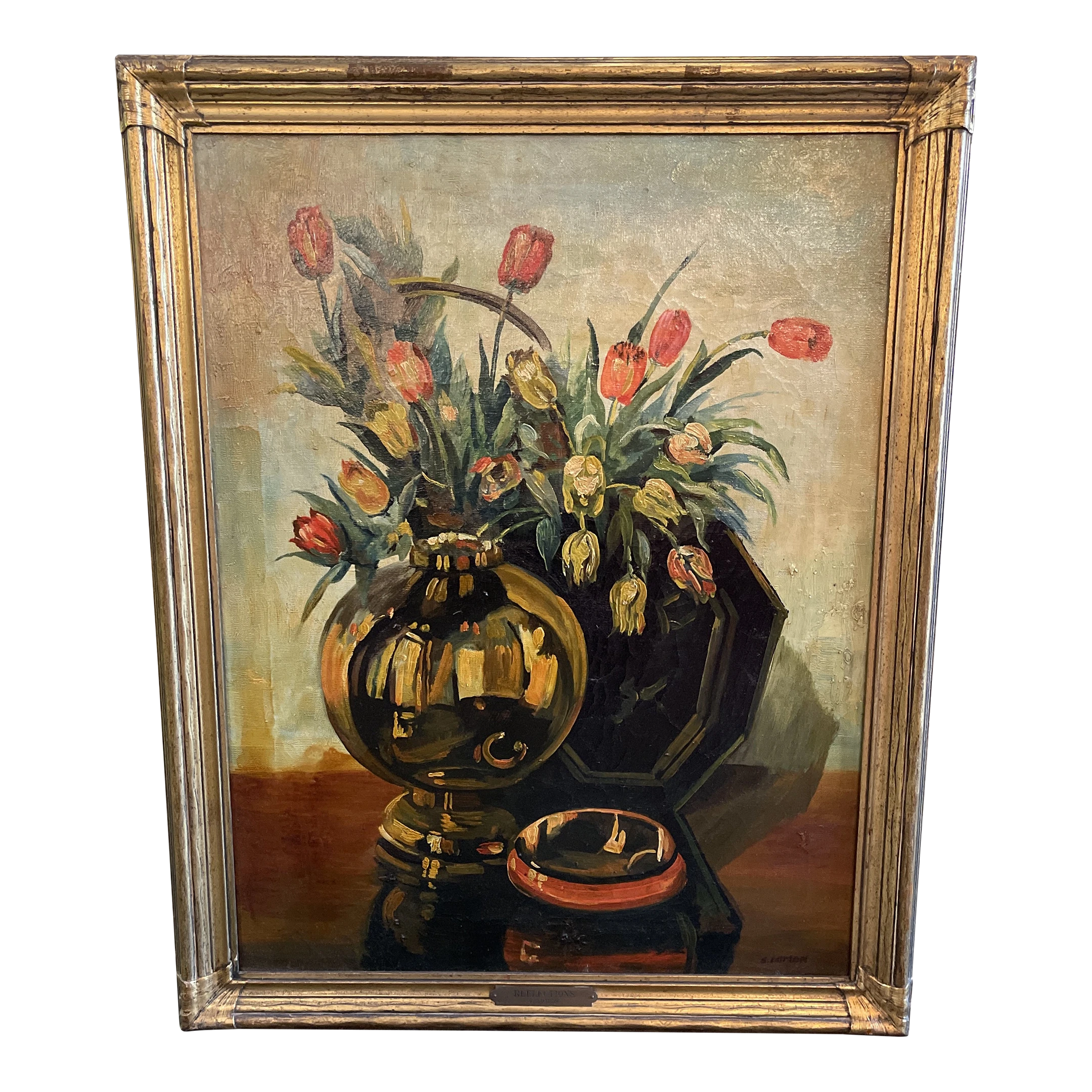 A signed S. Loman still life oil painting on canvas titled “Reflections”, depicting a floral vase with red and yellow …