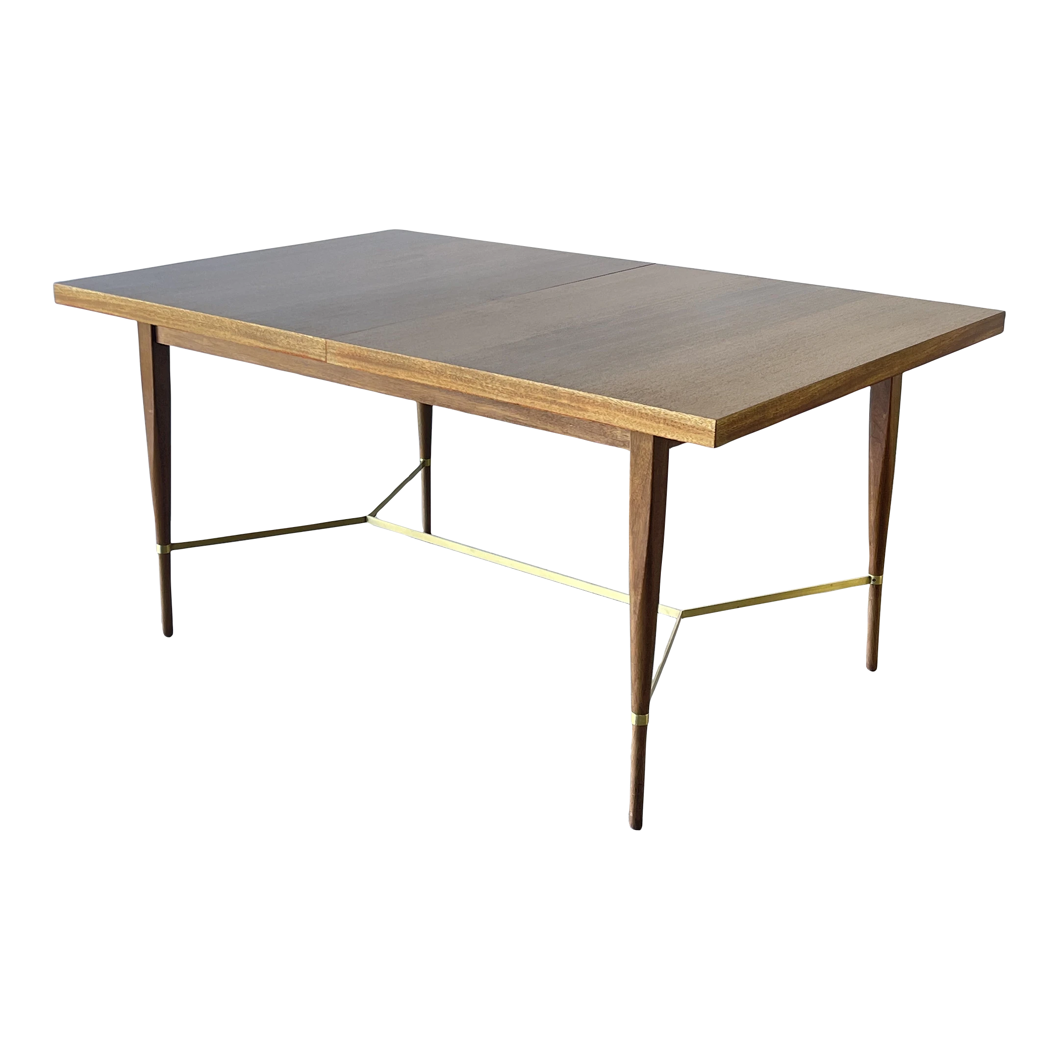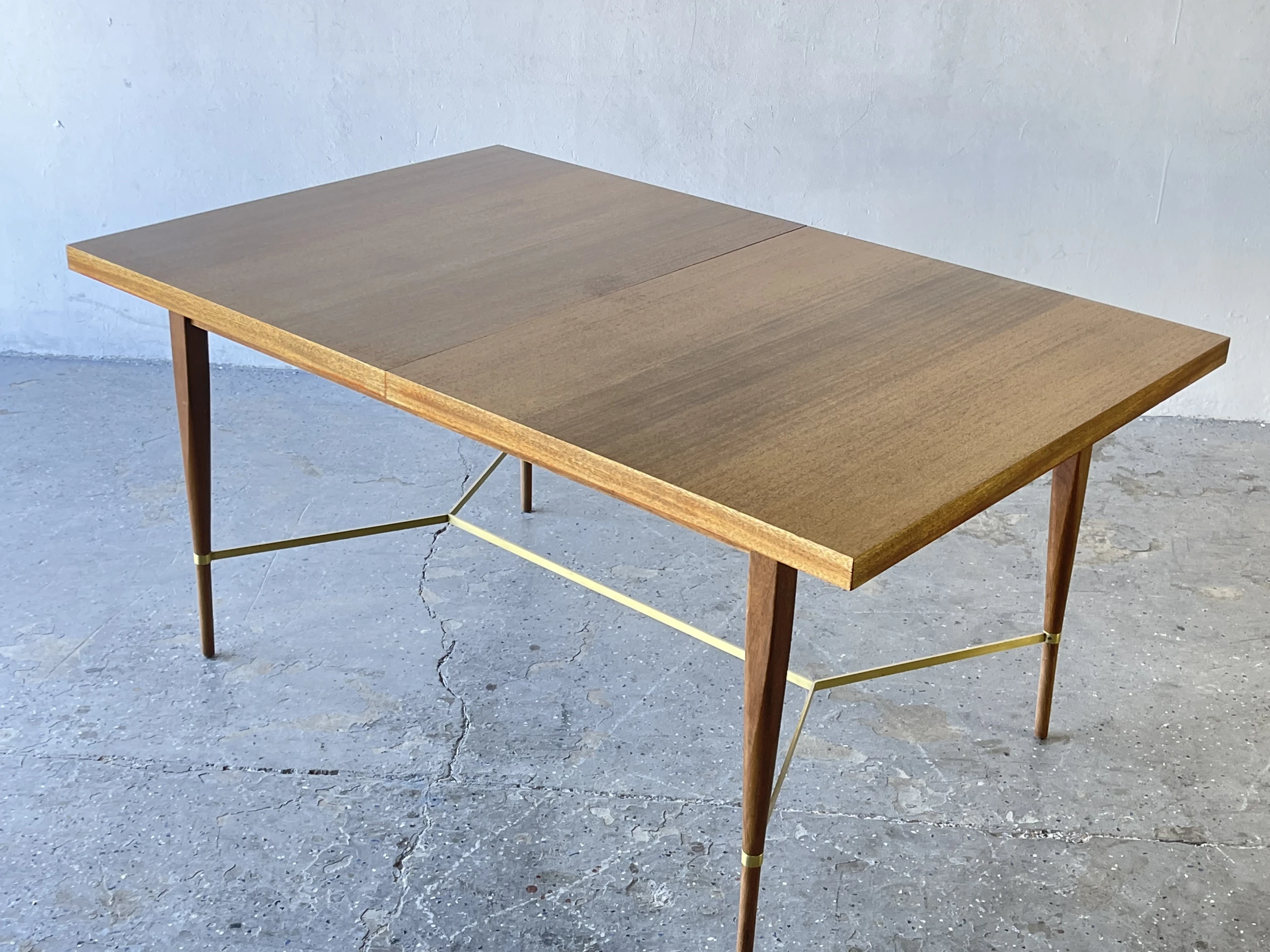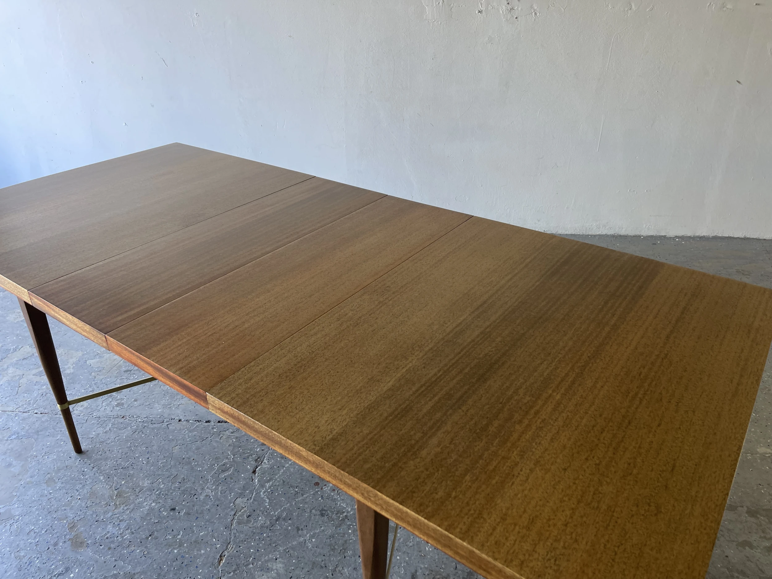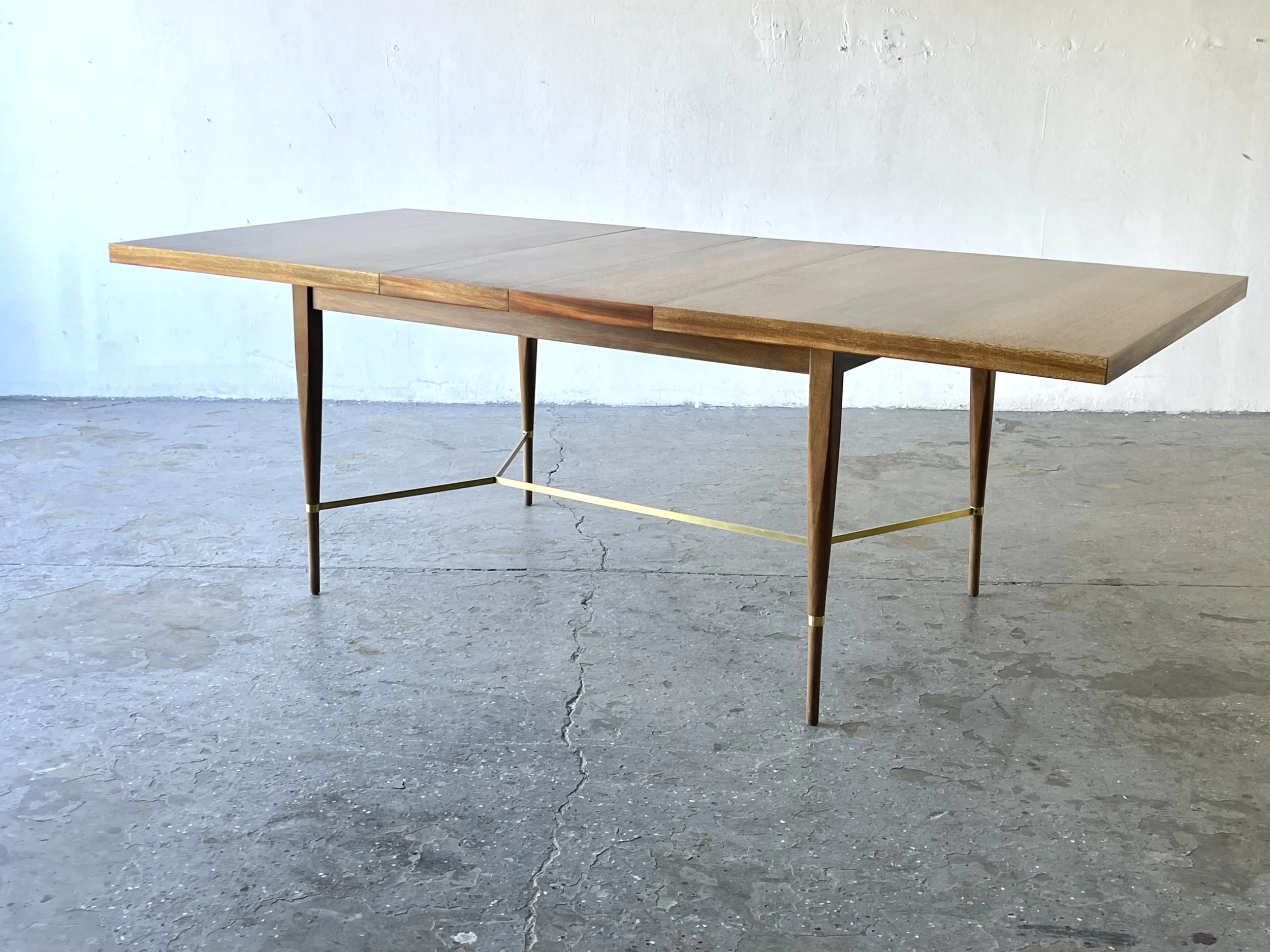 A very handsome vintage 1950s extension dining table in mahogany with brass stretcher by Paul McCobb for Calvin. Nice size and details with two extension leaves.