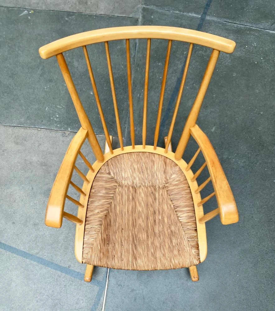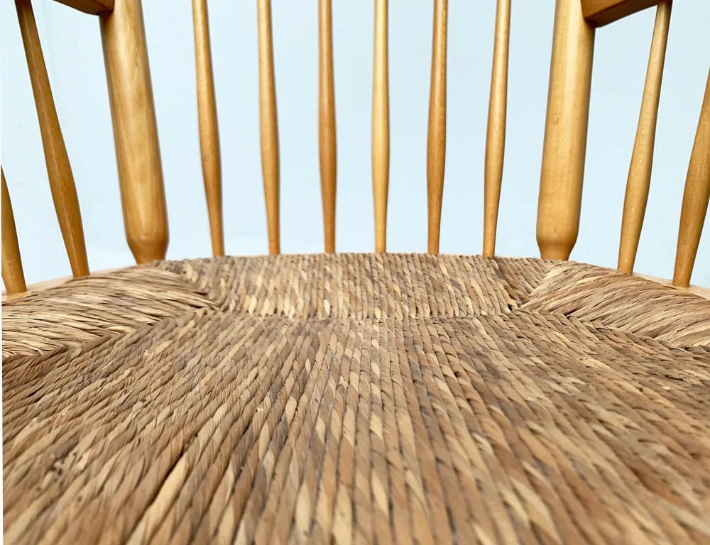The frame is made entirely of full wood elements with partly complex connections. The back and armrests are concave shaped and resolved in fine sprouts. The braided seat is framed on three sides. On the front, the braid extends to the underside and thus creates a softer edge for more seating comfort. I have official proof of authenticity such as vintage catalogs,
