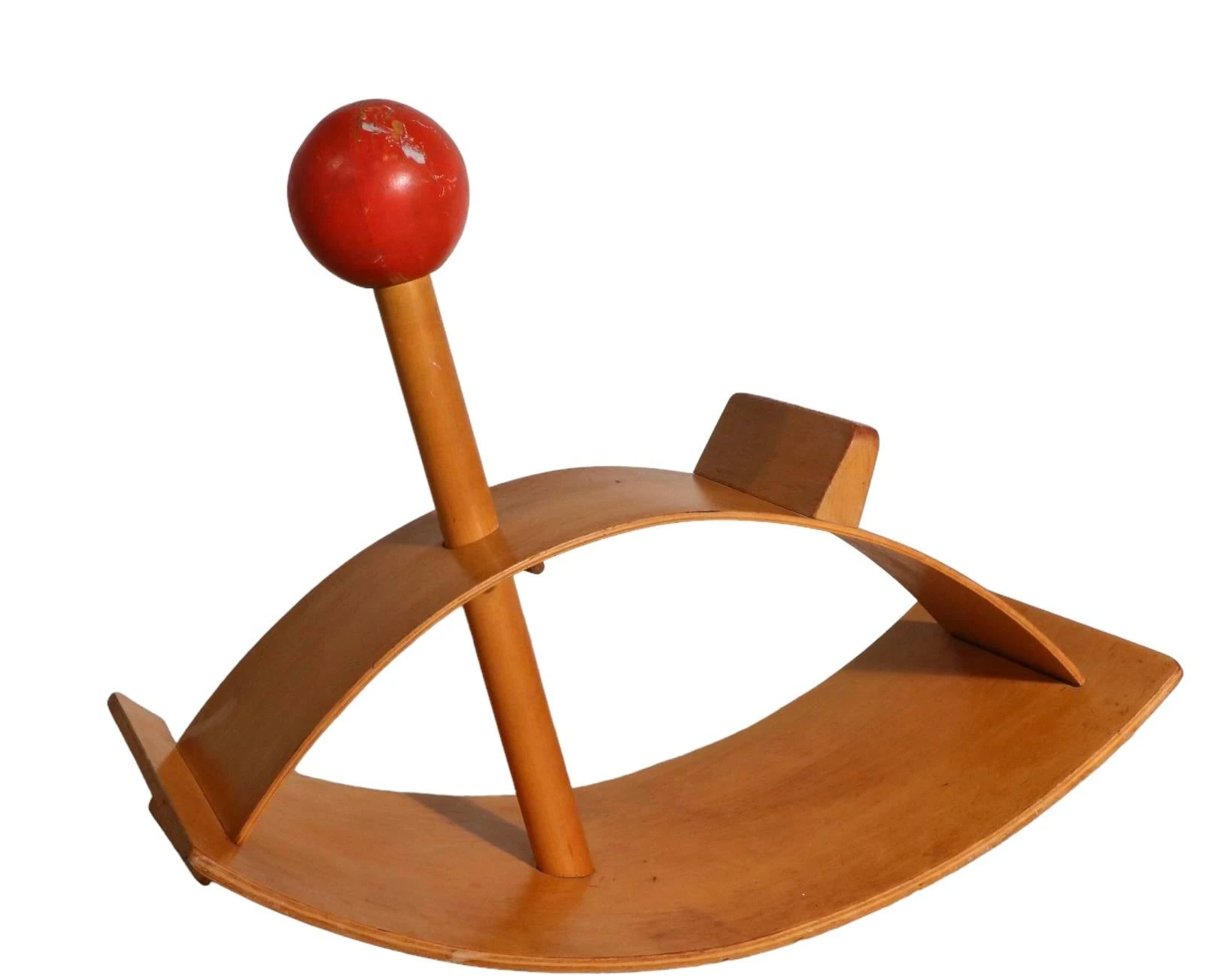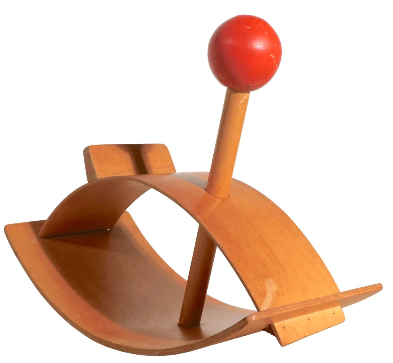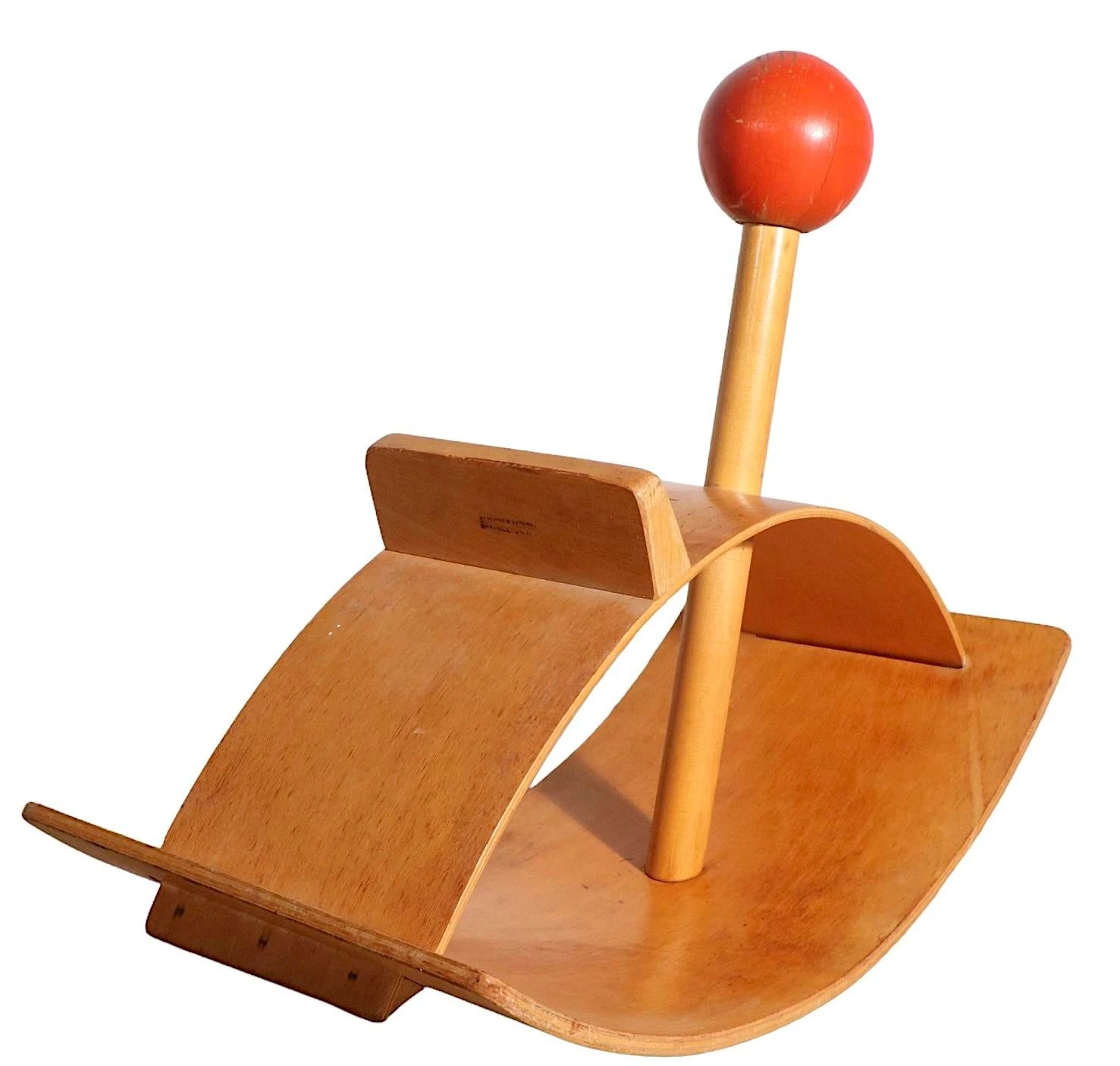 Iconic mid century bent plywood Childs toy rocking chair designed by Gloria Caranica for Creative Playthings, circa 1960’s. This example is in good, original estate condition, showing only light cosmetic wear, normal and consistent with age. Specifically, some scuffs etc to the red ball handle, and minor discoloration to plywood fare at base, please see images.