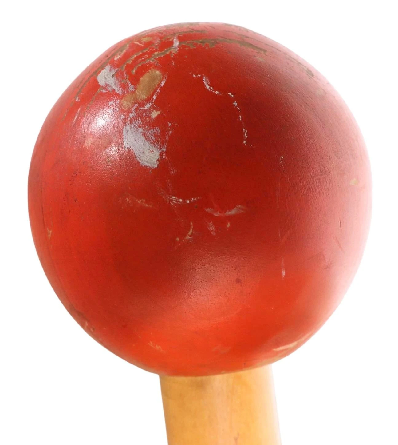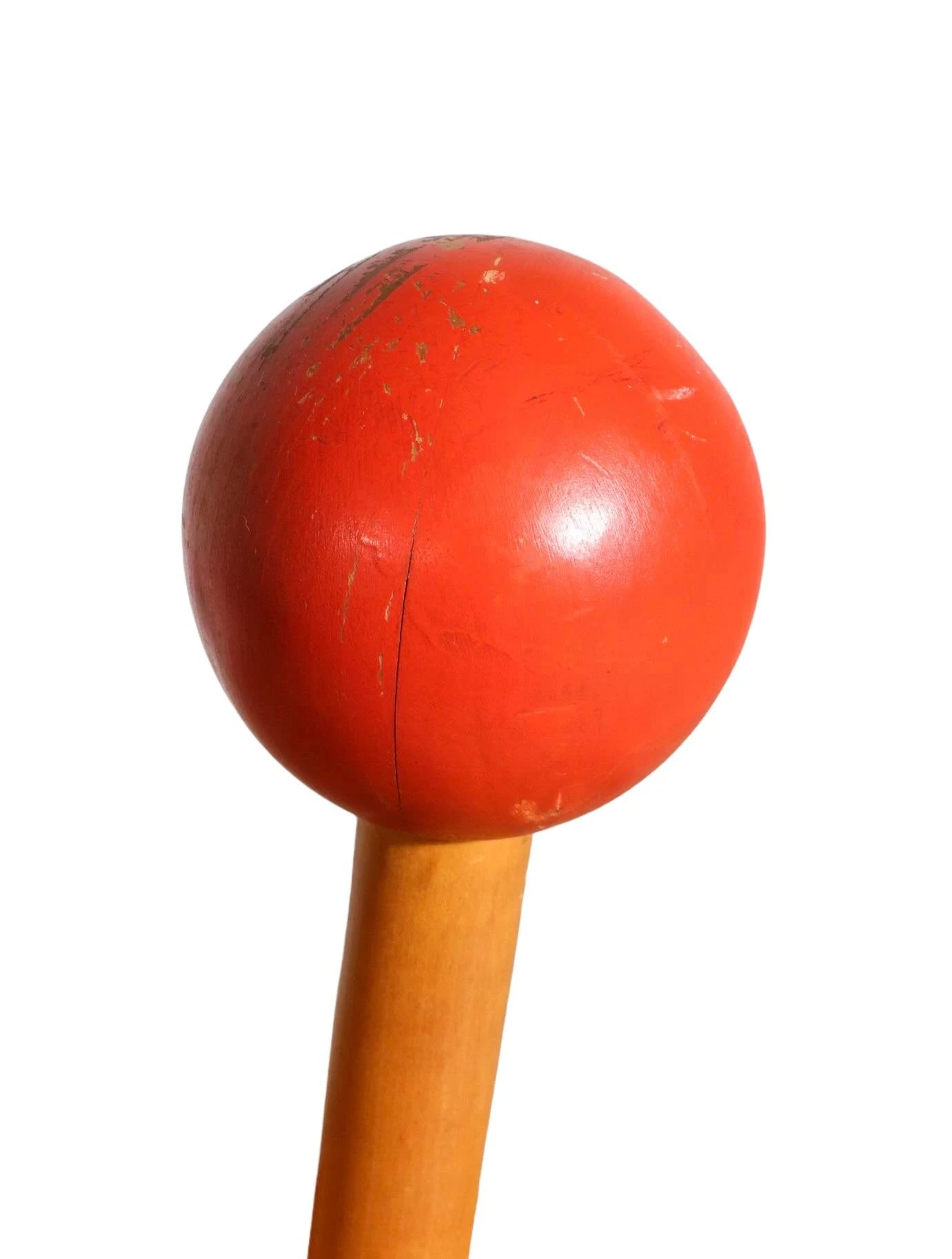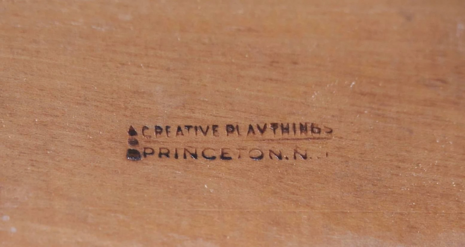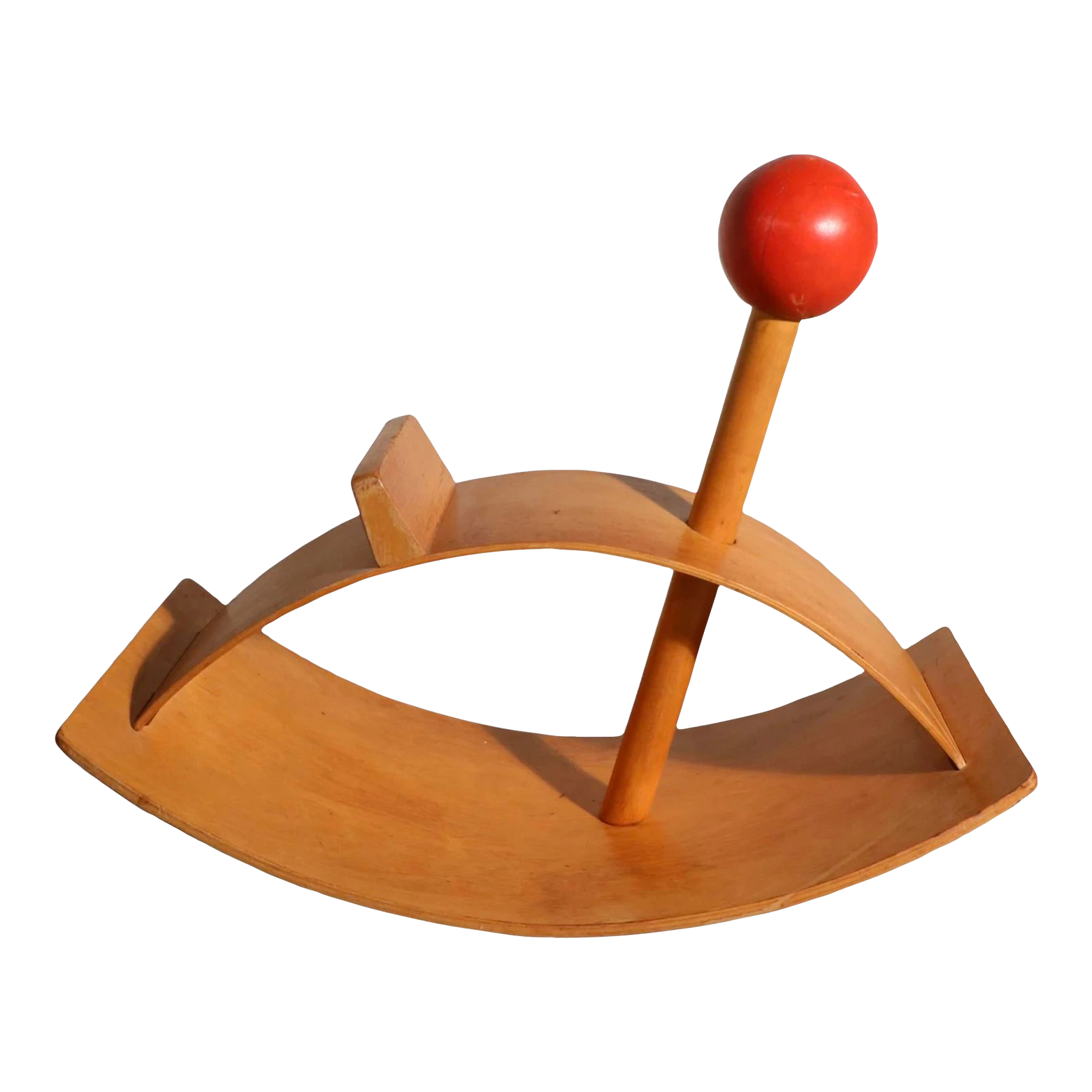 Iconic mid century bent plywood Childs toy rocking chair designed by Gloria Caranica for Creative Playthings, circa 1960’s. This example is in good, original estate condition, showing only light cosmetic wear, normal and consistent with age. Specifically, some scuffs etc to the red ball handle, and minor discoloration to plywood fare at base, please see images.