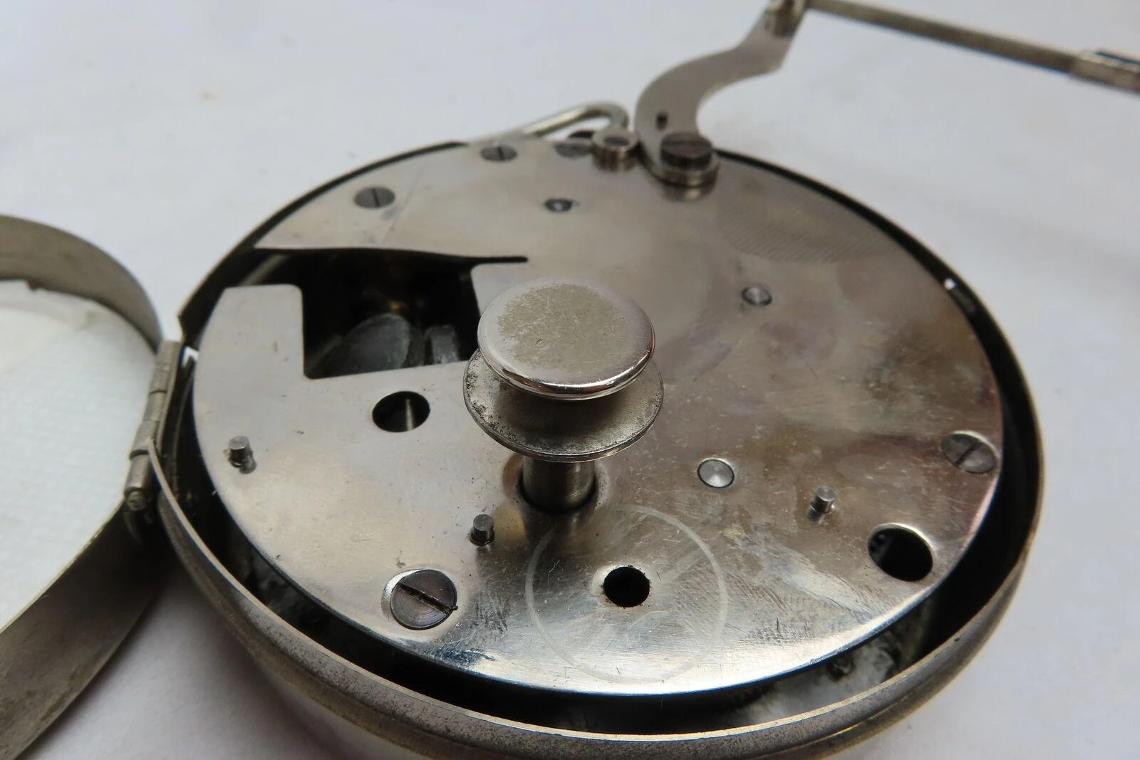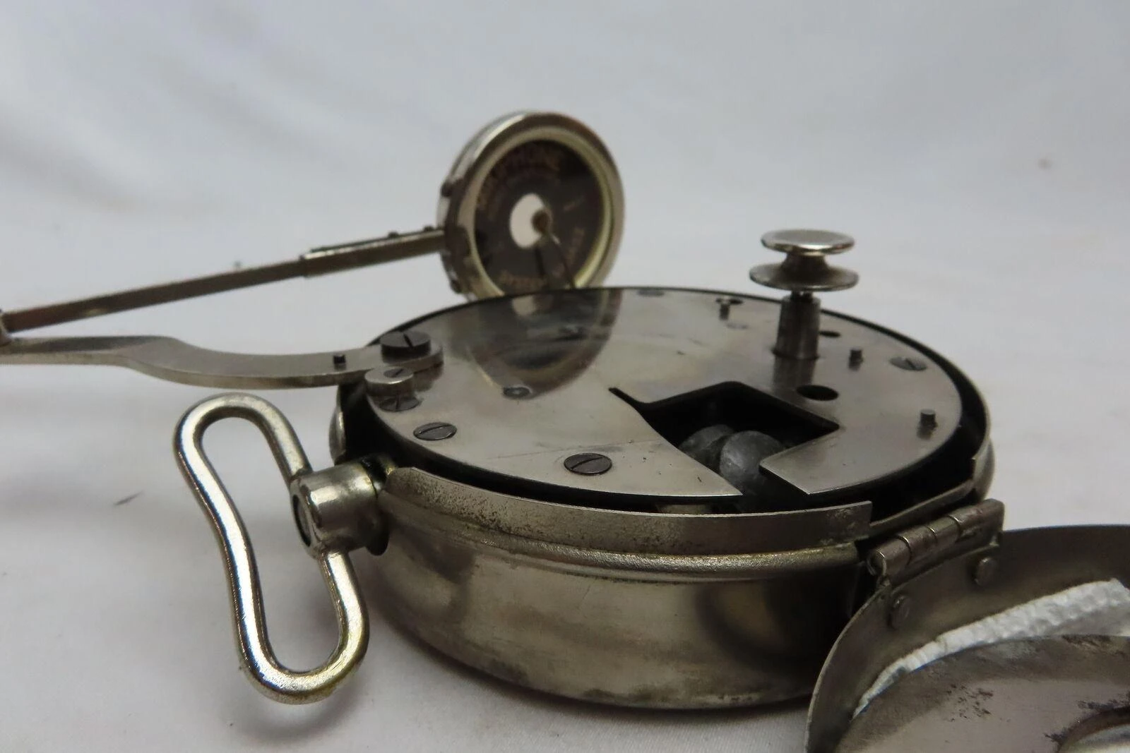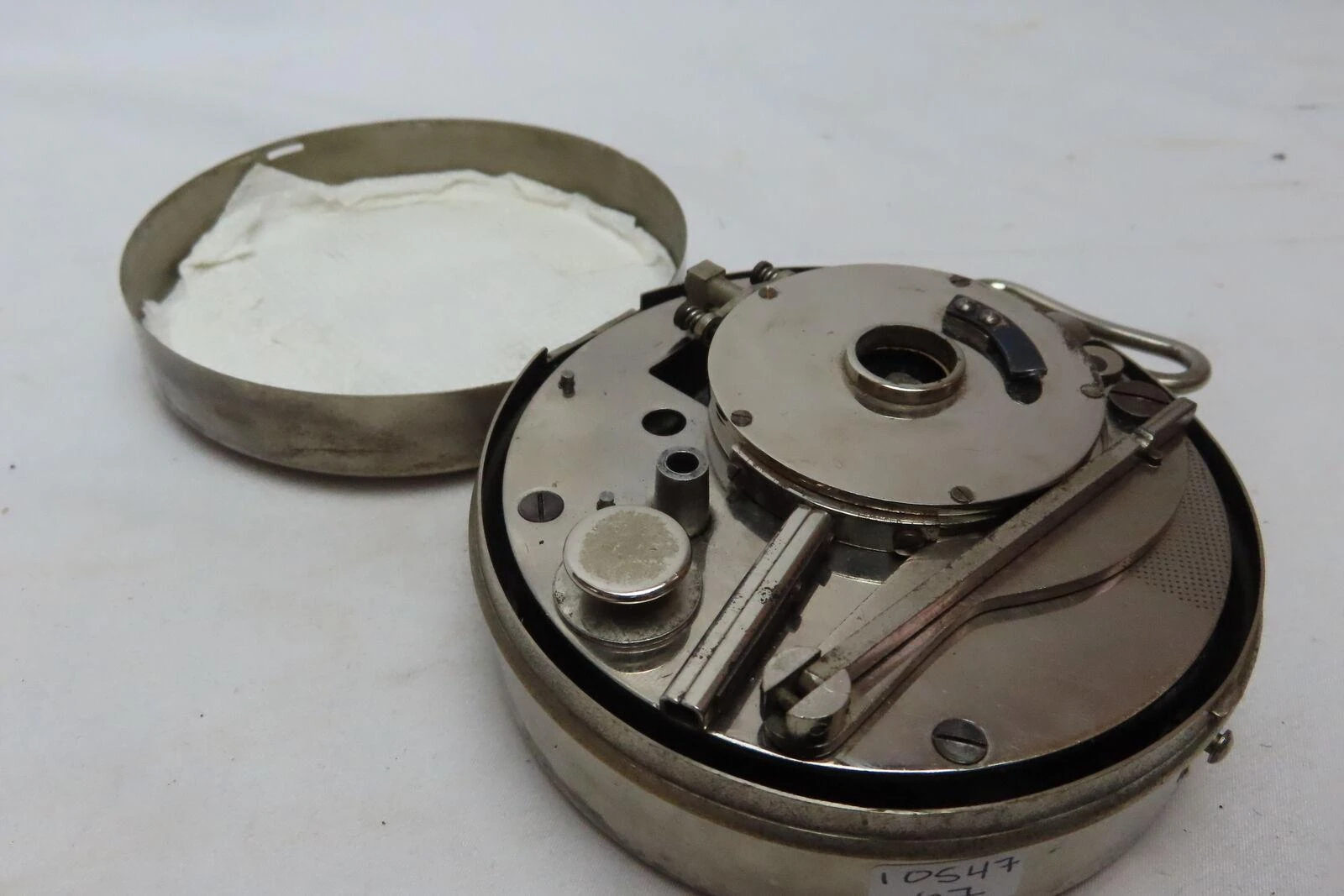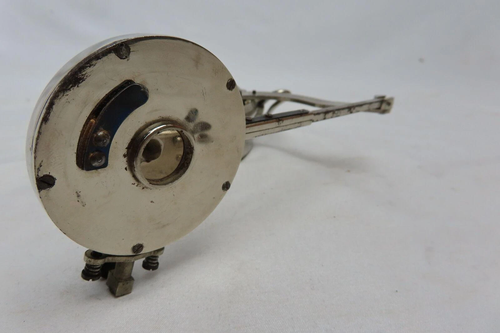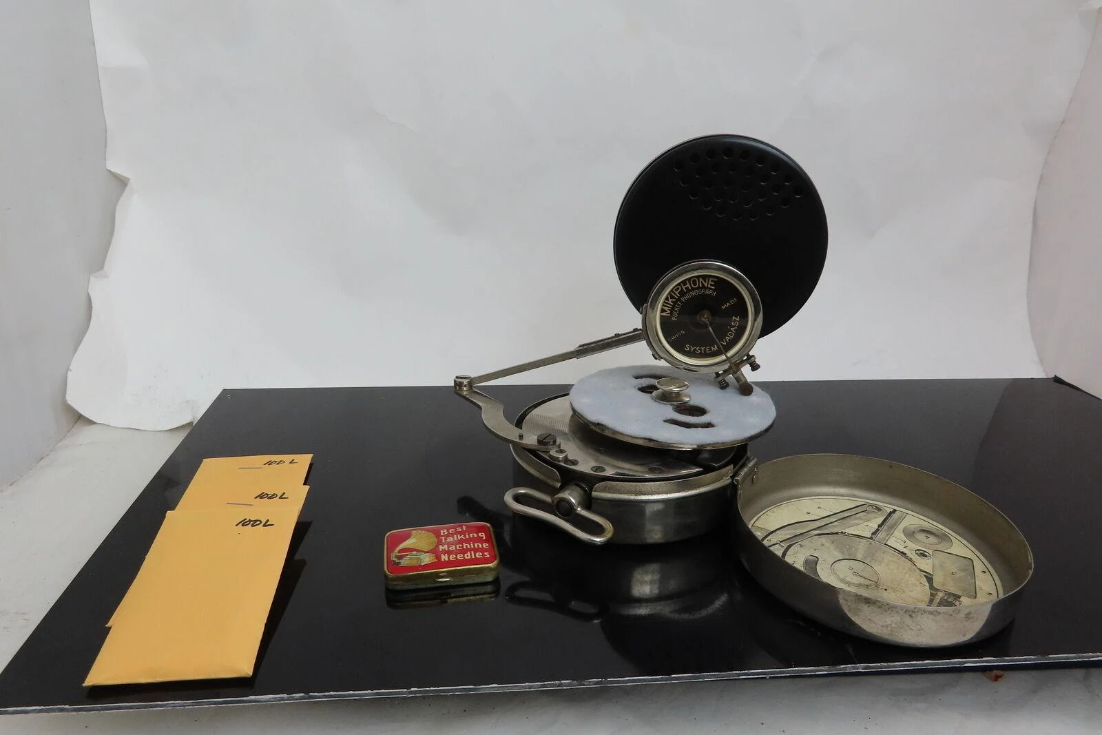 Pocket phonograph made by Paillard in Switzerland, marked “Mikiphone”, “System Vadasz.” Designed by Hungarian designer Miklós Vadász, made in the late 1920’s. Nickle plate over brass and steel. Case exhibits minor denting and brassing, internal components all present. It has a service record for a new mainspring and arbor from 2014. Comes with a box and 3 bags of extra needles.