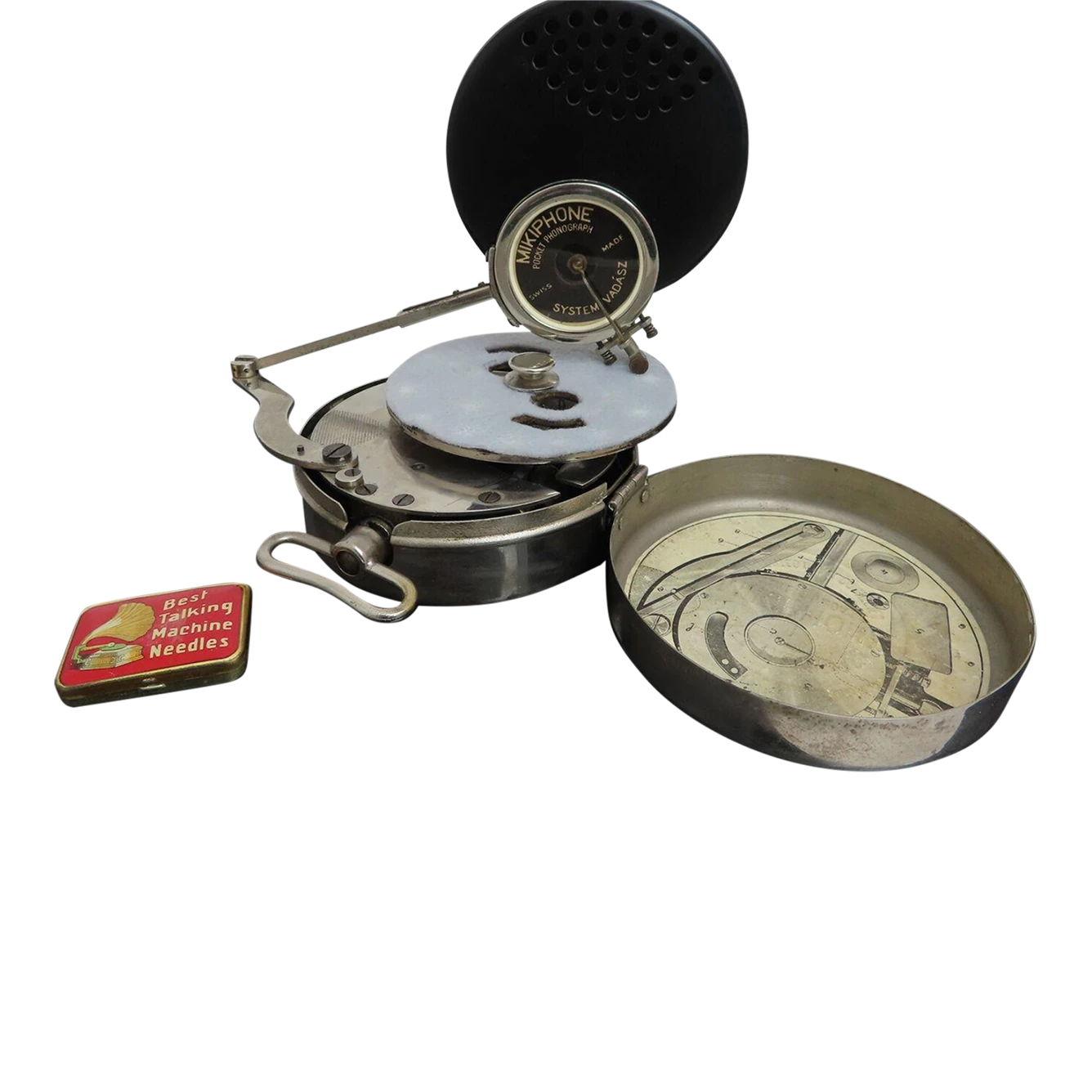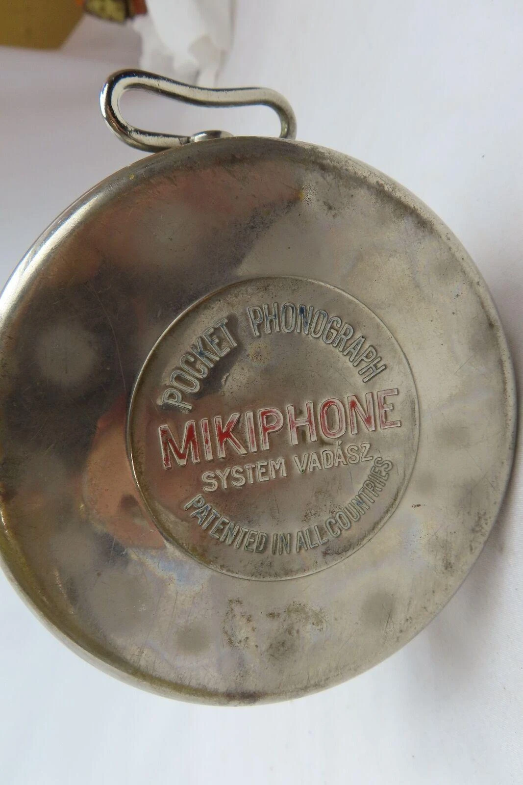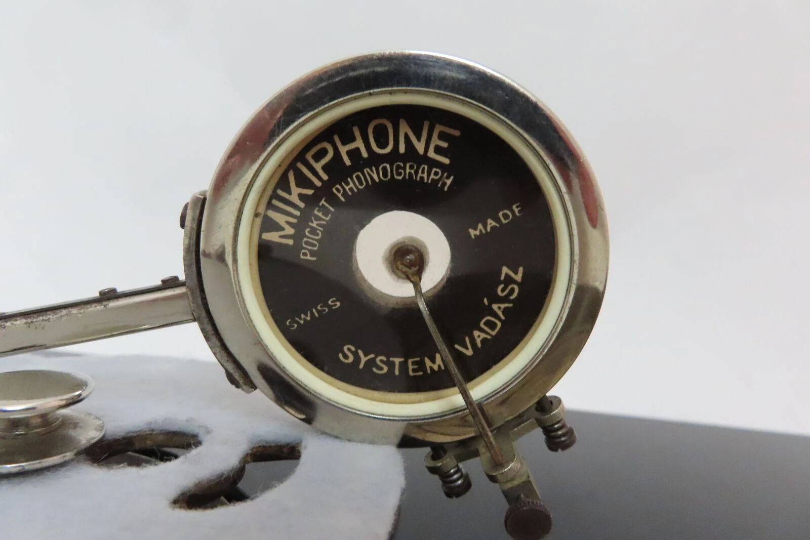 The Mikiphone pocket phonograph was designed by Hungarian brothers Miklós and Étienne Vadász, and mass produced under licence by Masison Paillard of Saint Croix, Switzerland.