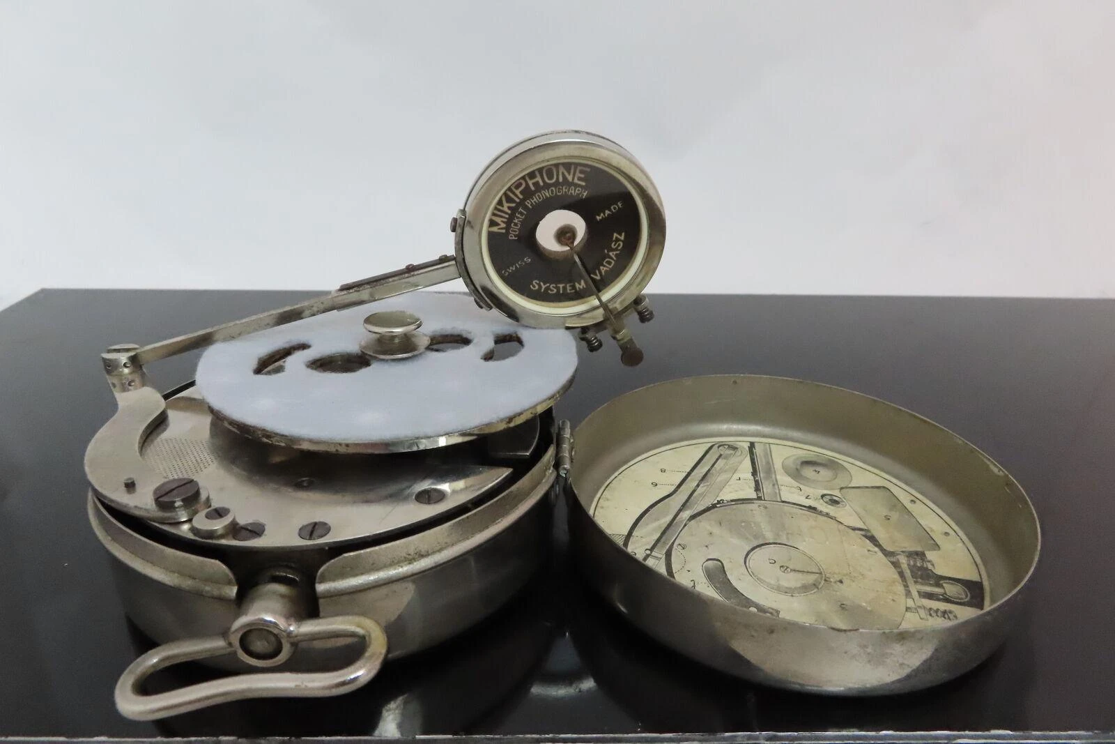 Pocket phonograph made by Paillard in Switzerland, marked “Mikiphone”, “System Vadasz.” Designed by Hungarian designer Miklós Vadász, made in the …