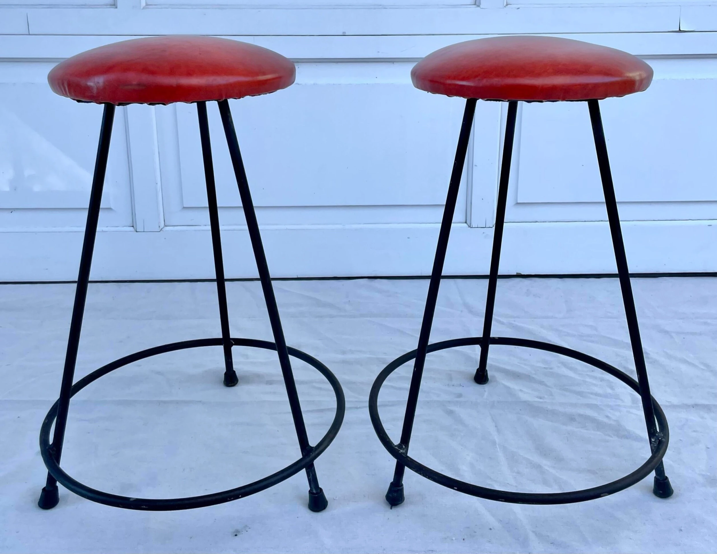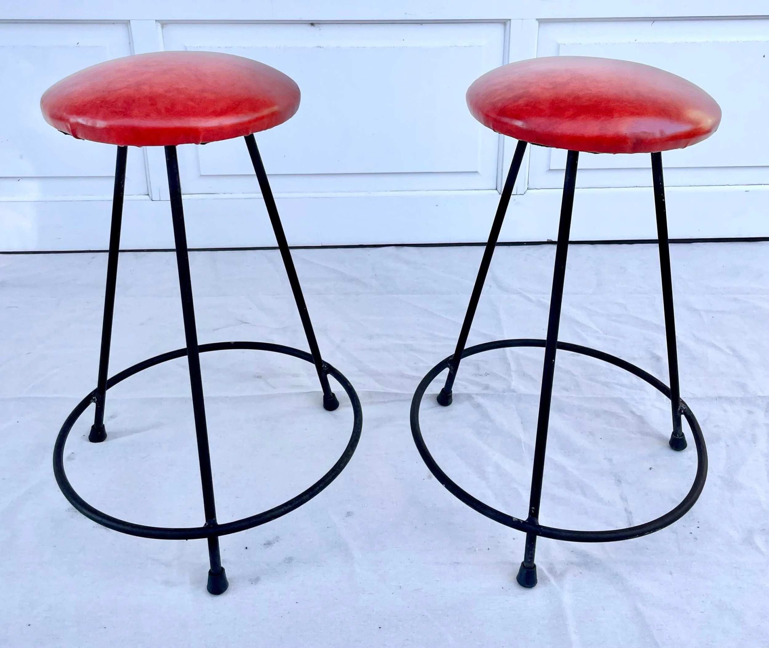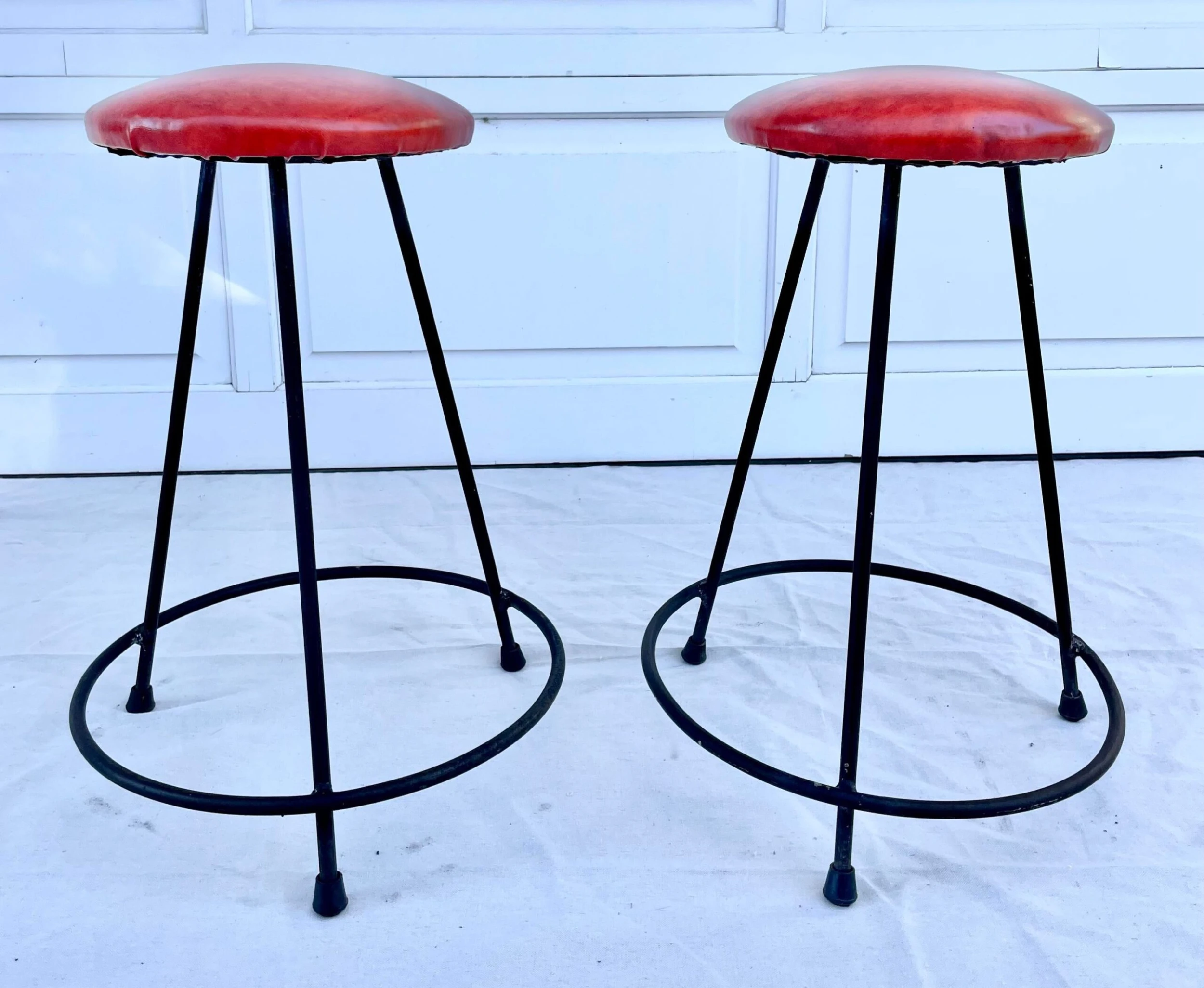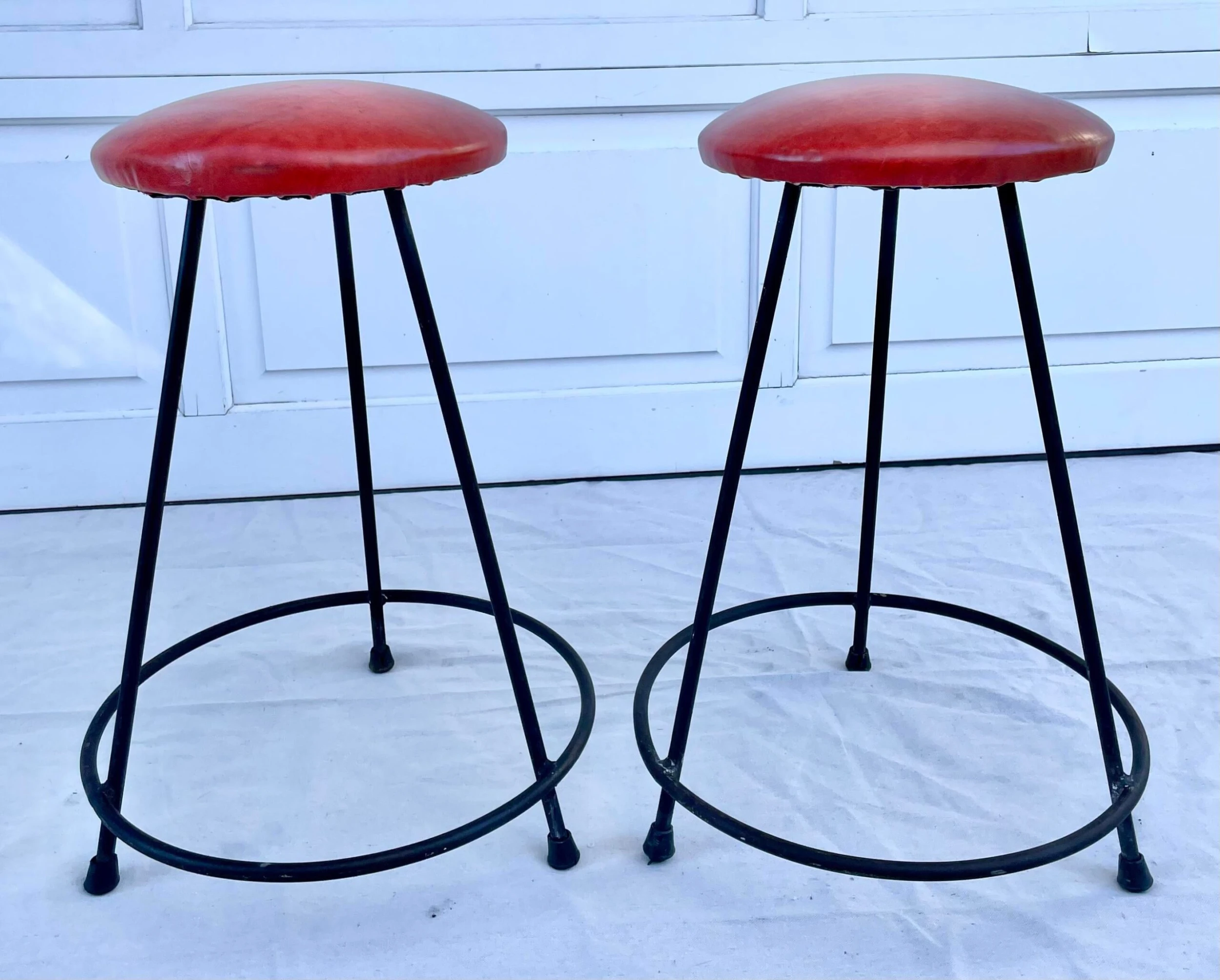Here is a charming set of TWO matching bar stools from the 1950-60’s that have a conical shaped iron base and a round red leatherette padded seat.