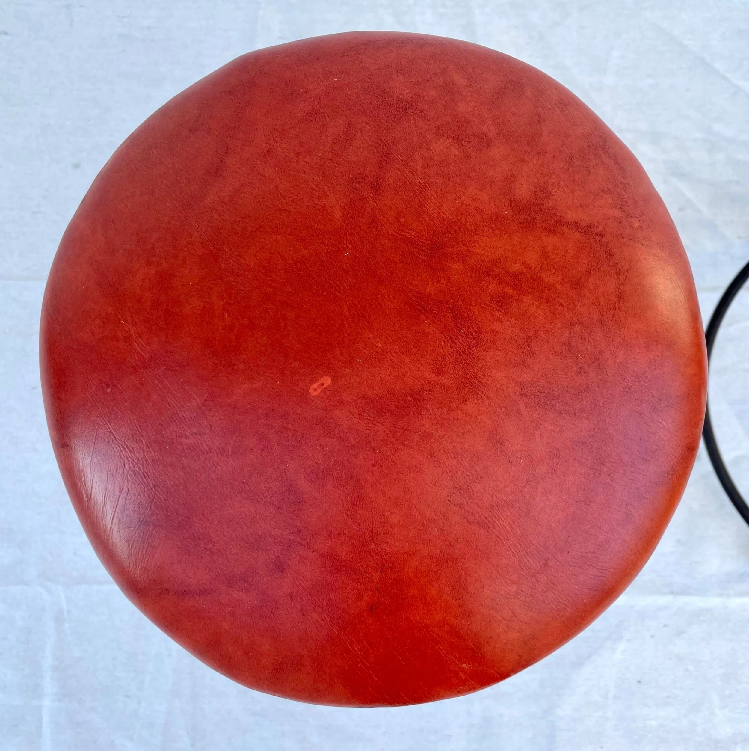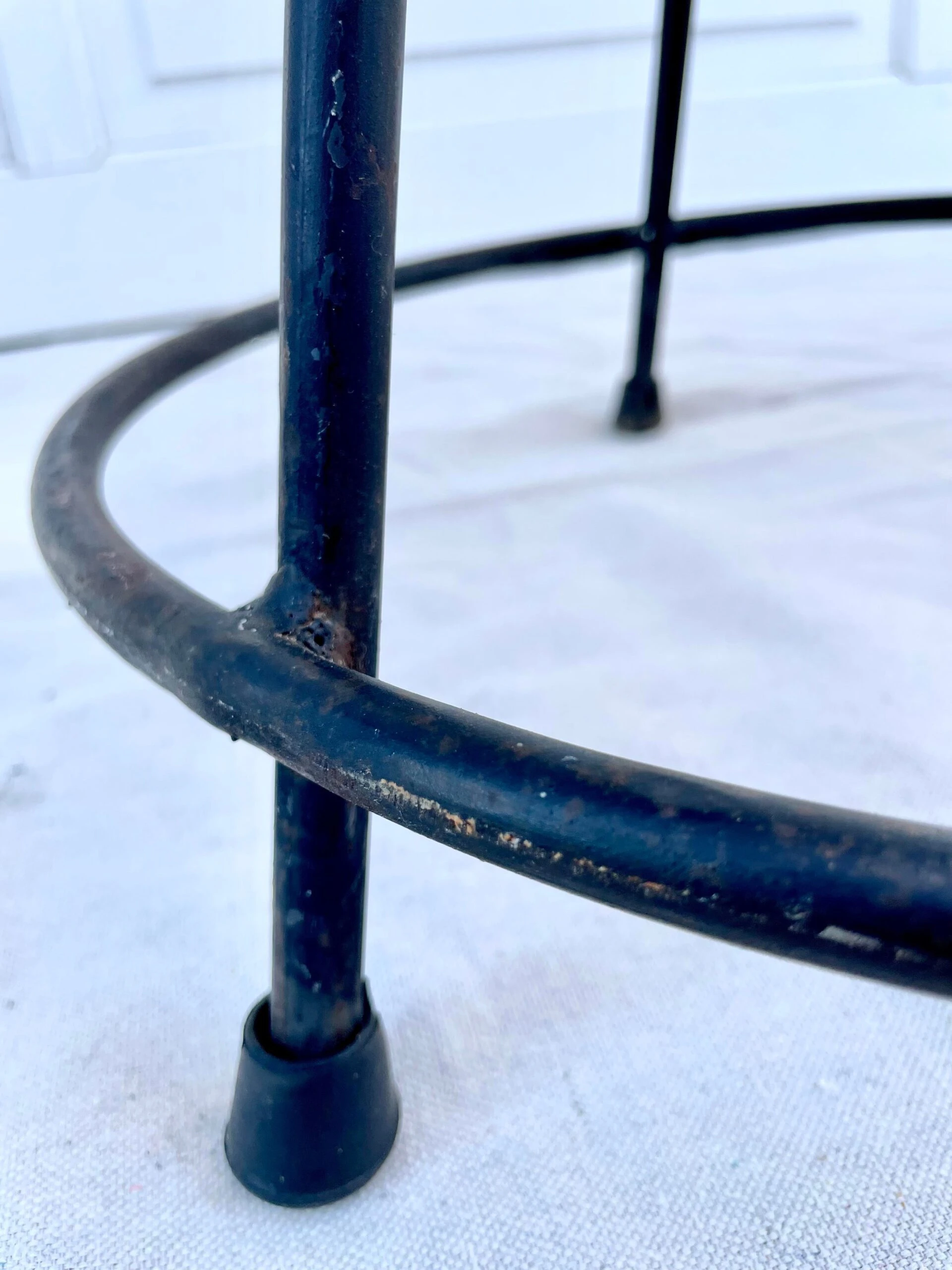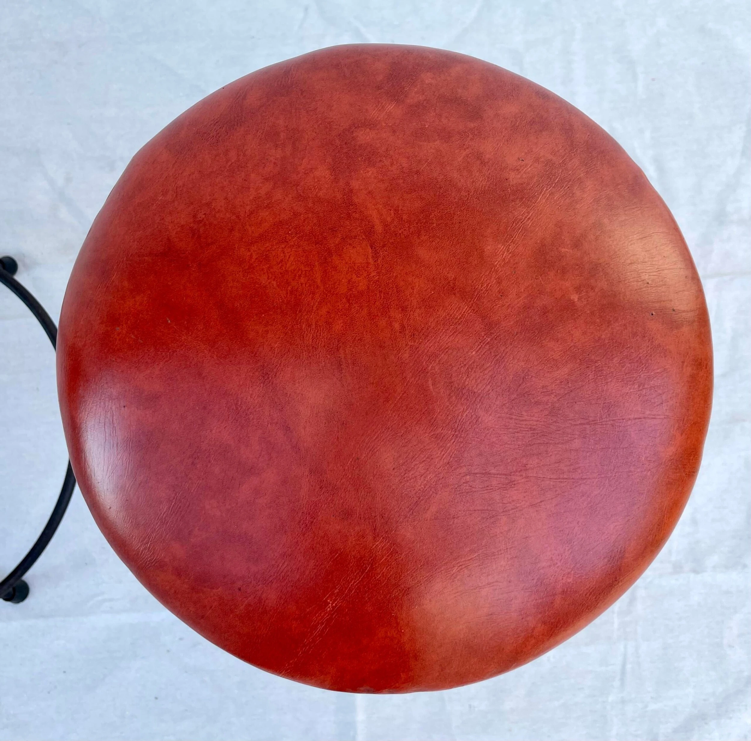 Pieces are structurally excellent and in good vintage condition. The leatherette tops have no tears or rips – just light wear. The iron bases have patina and show age – I think, in a great way. Black rubber feet show wear/age.