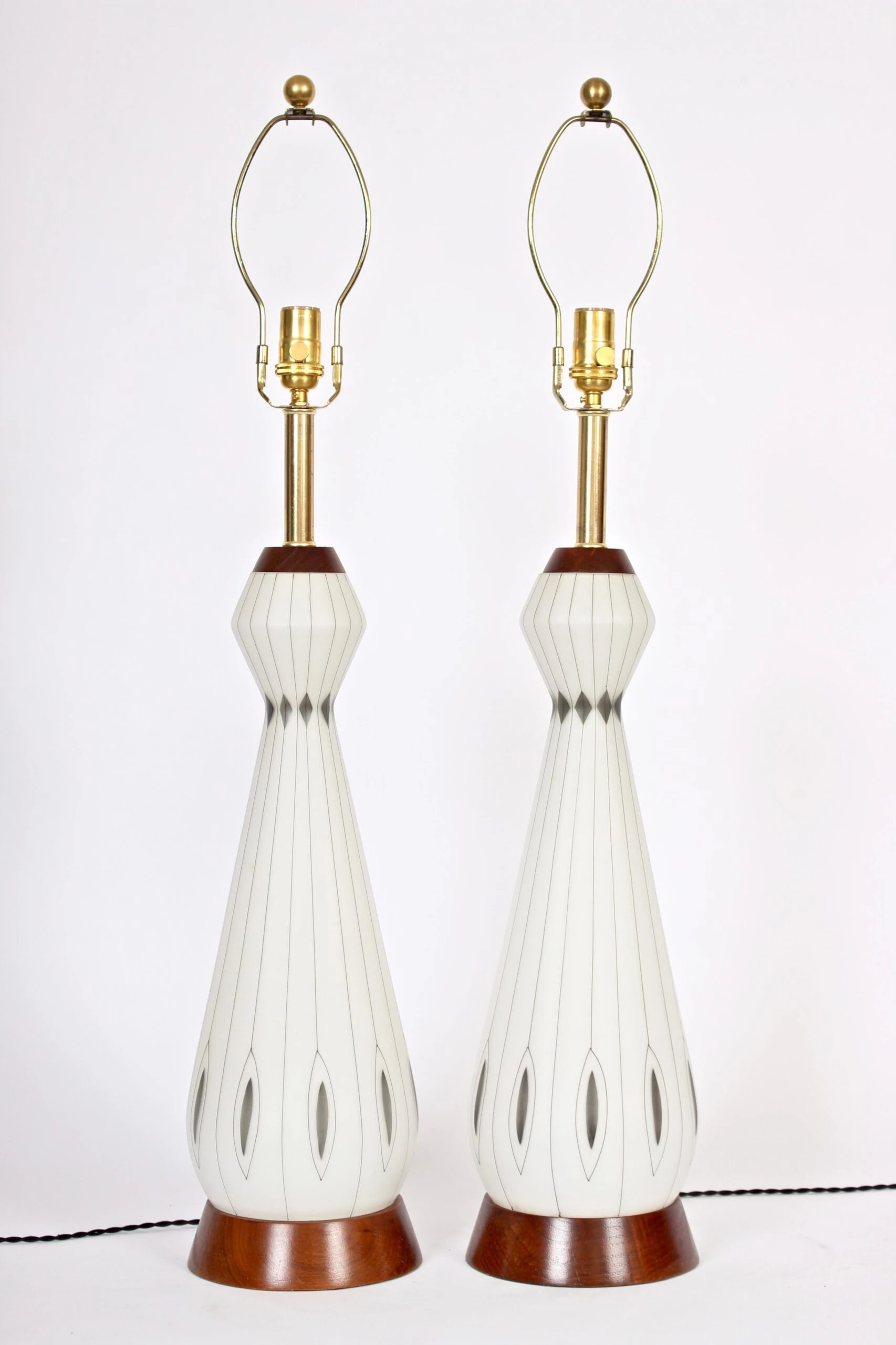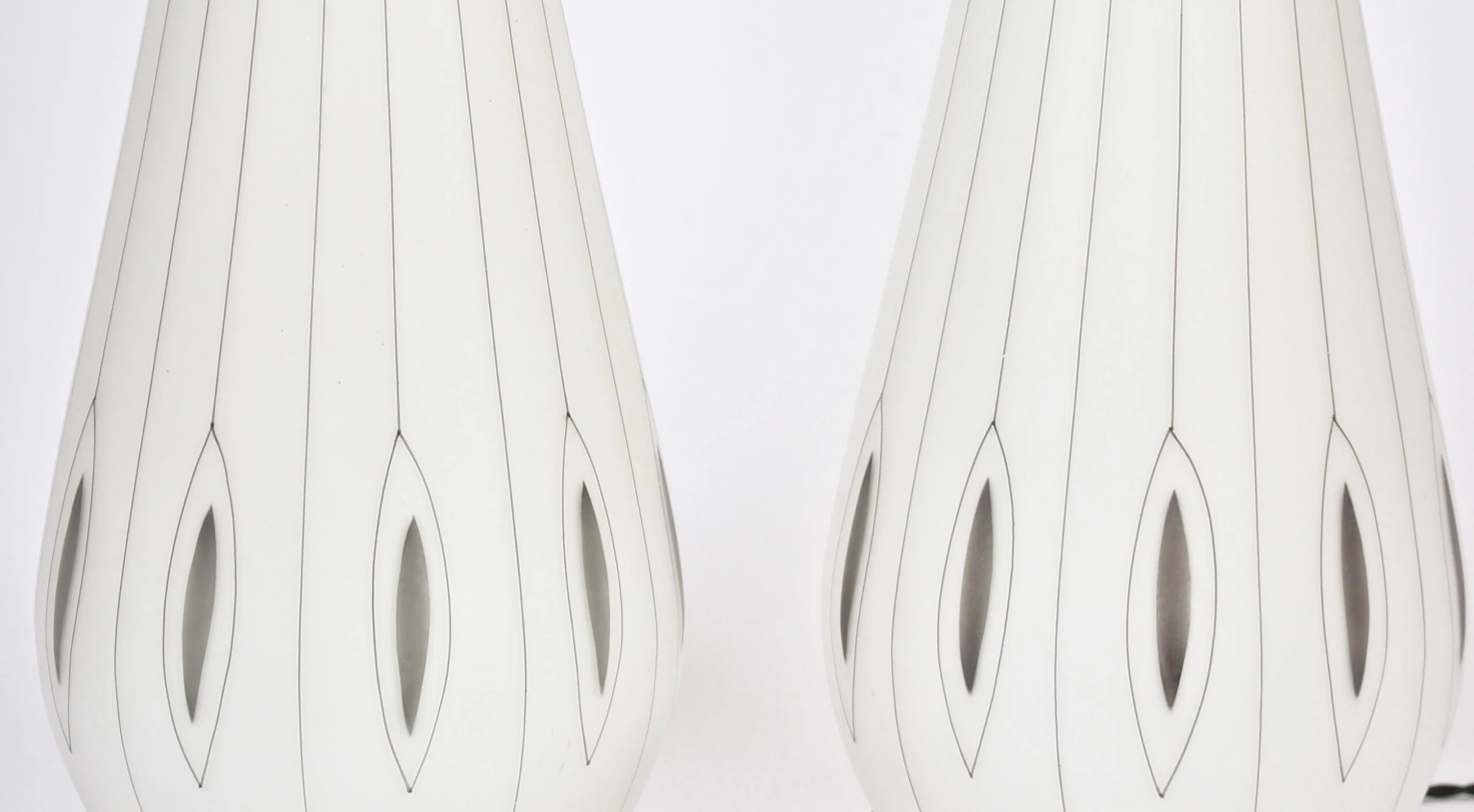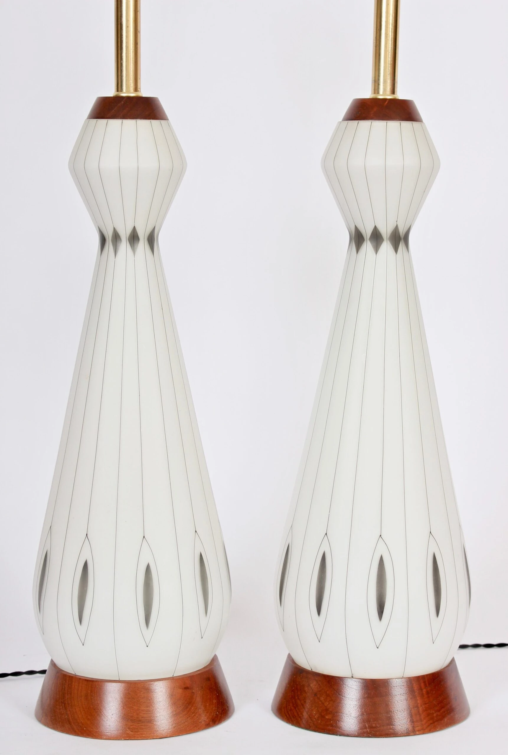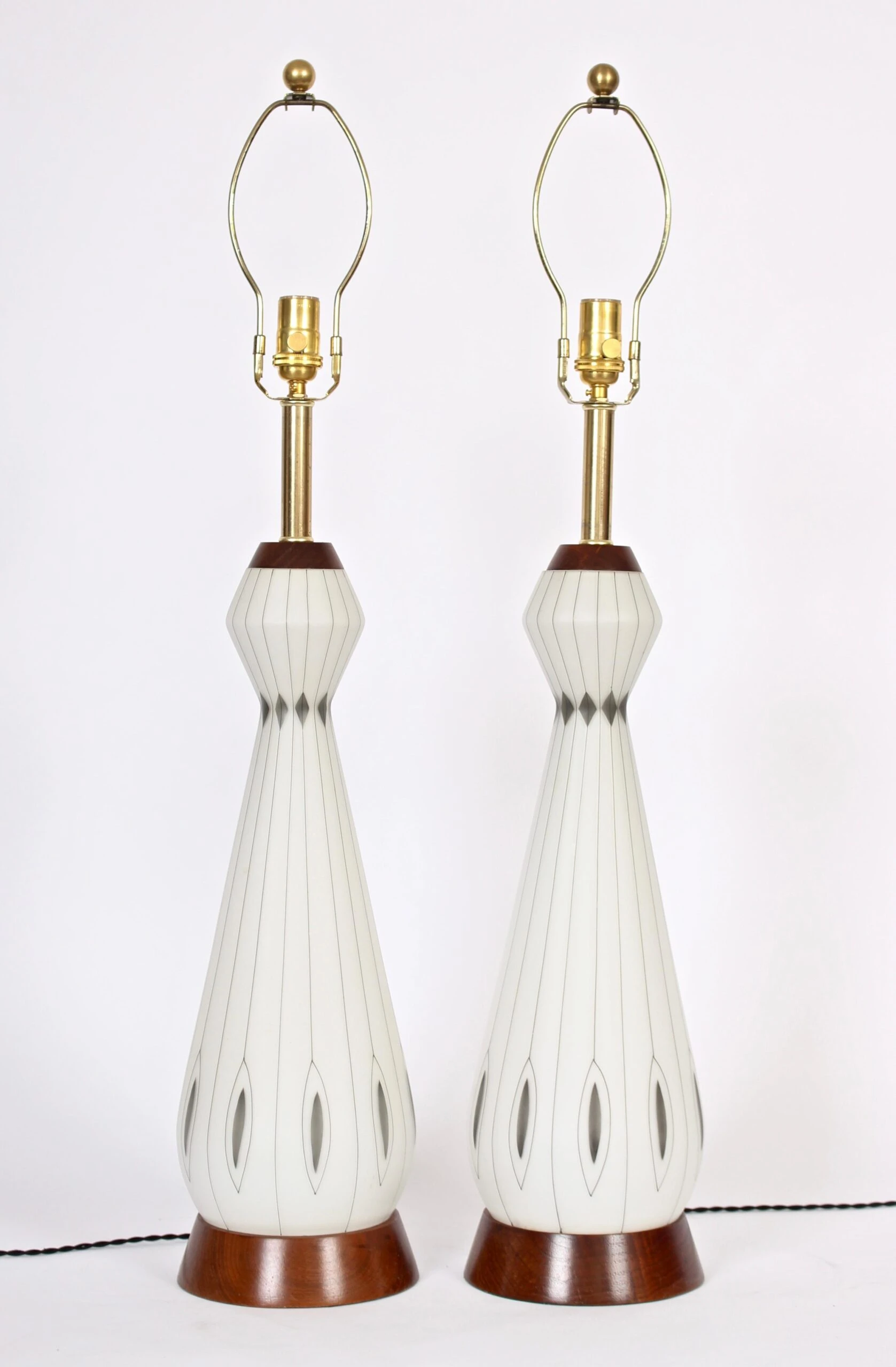 Monumental 36″H pair of white frosted glass table lamps with Sterling Silver line. Featuring a modern translucent white frosted glass form, hand applied vertical silver line and cat eye decoration in patinated silver overlay. With Walnut cap and flared base. Brass neck. Small footprint. 30 H to top of socket. Rarity.