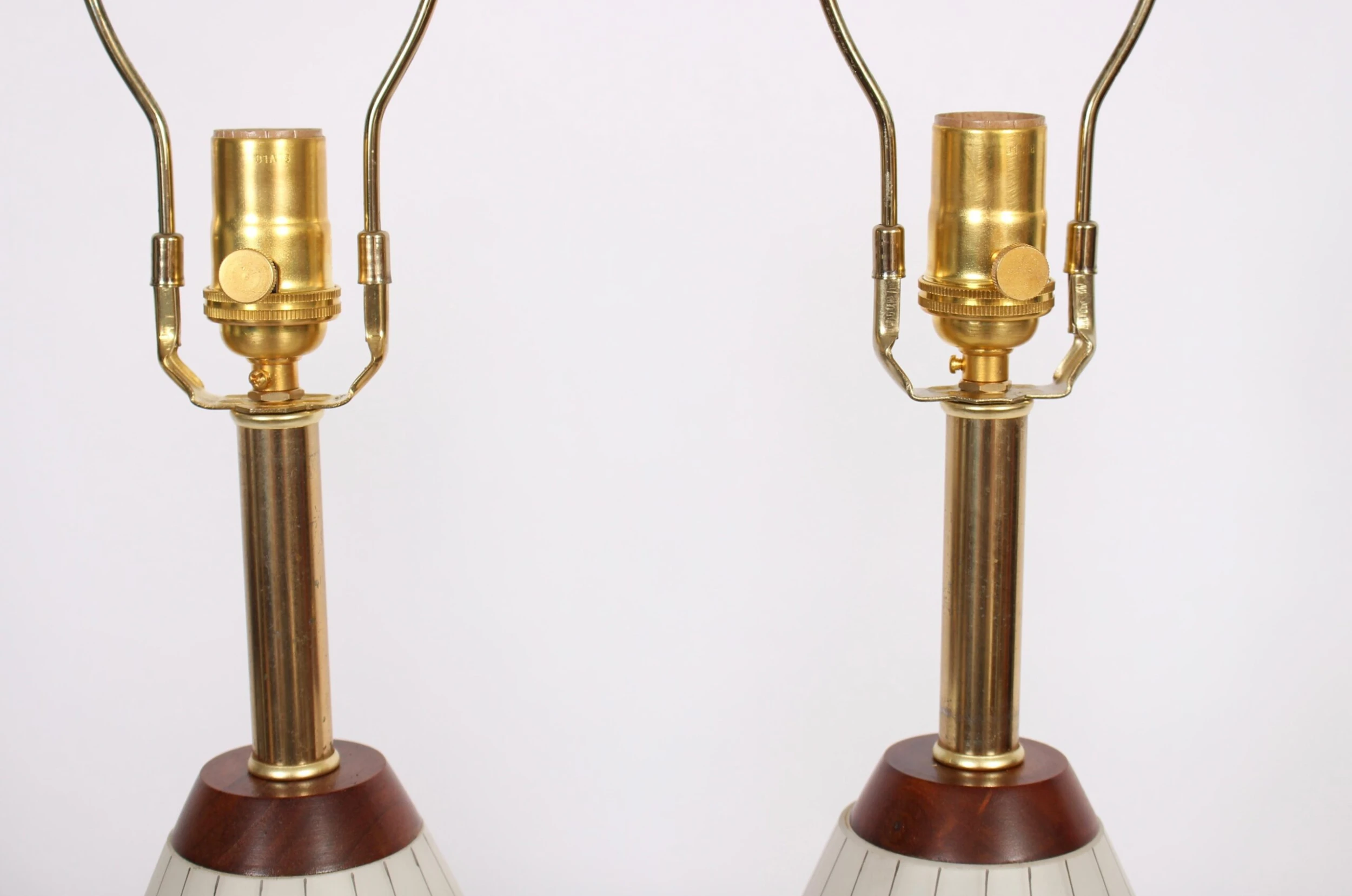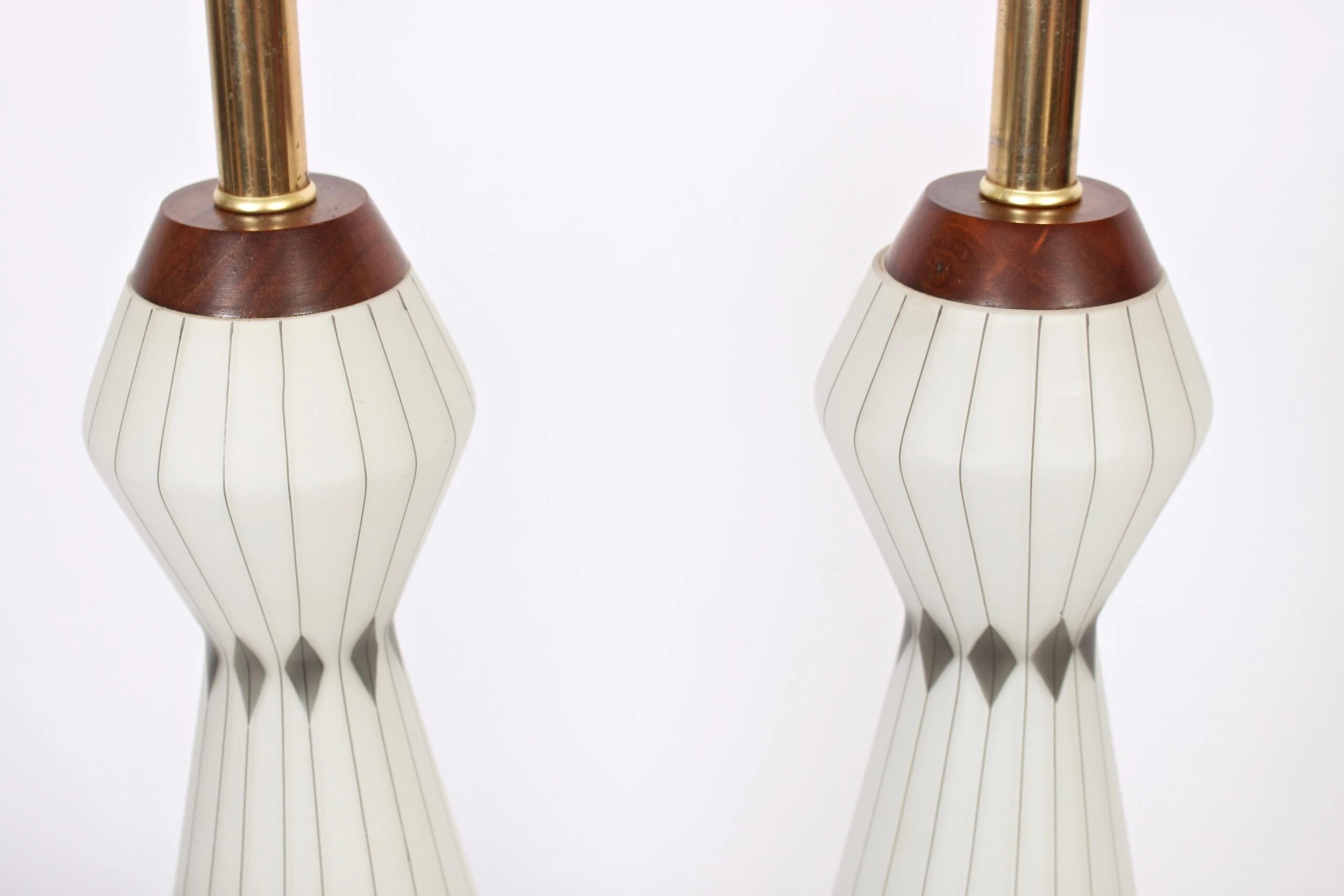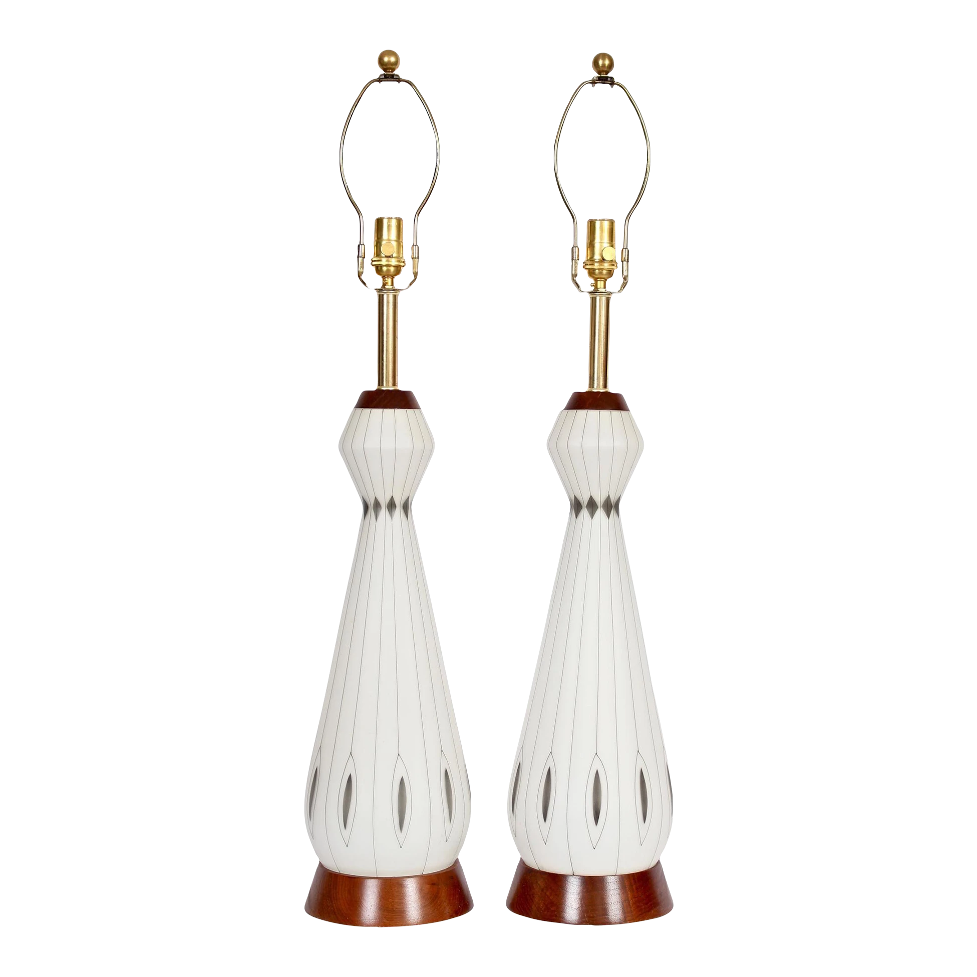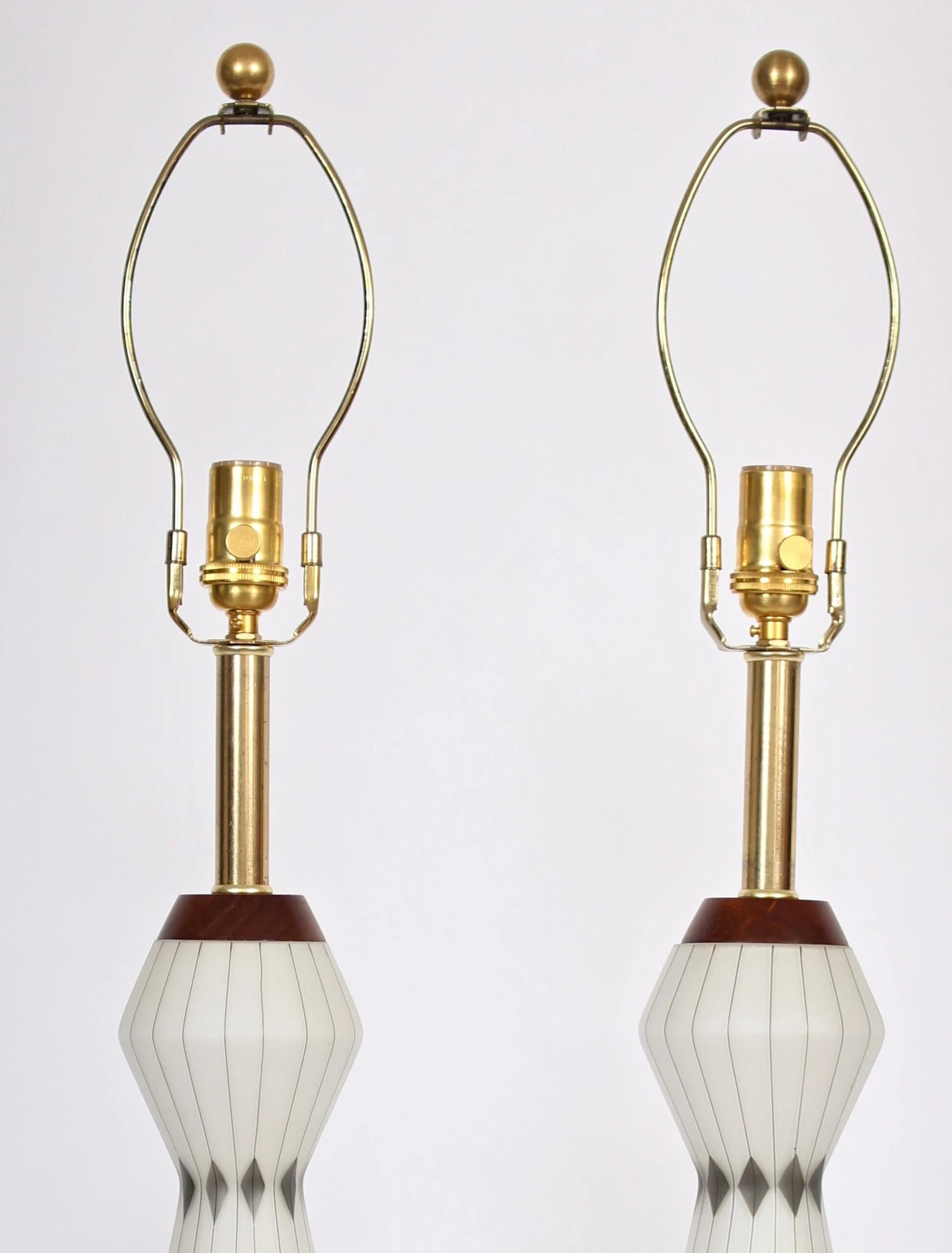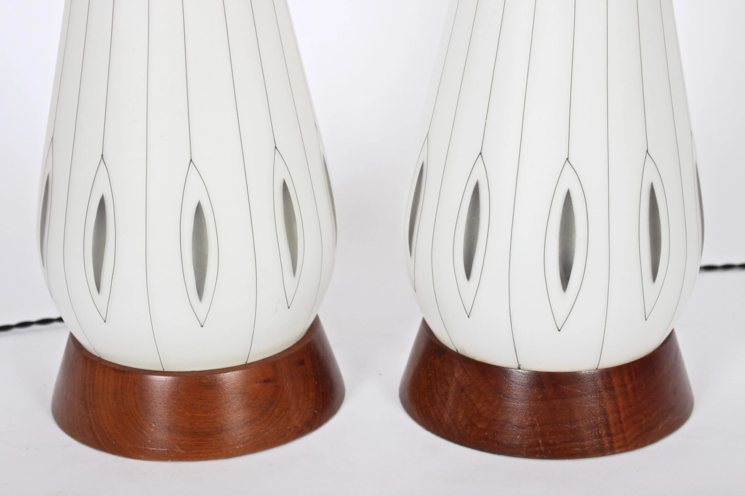 Monumental 36″H pair of white frosted glass table lamps with Sterling Silver line. Featuring a modern translucent white frosted glass form, hand applied vertical silver line and cat eye decoration in patinated silver overlay. With Walnut cap and flared base. Brass neck. Small footprint. 30 H to top of socket. Rarity.