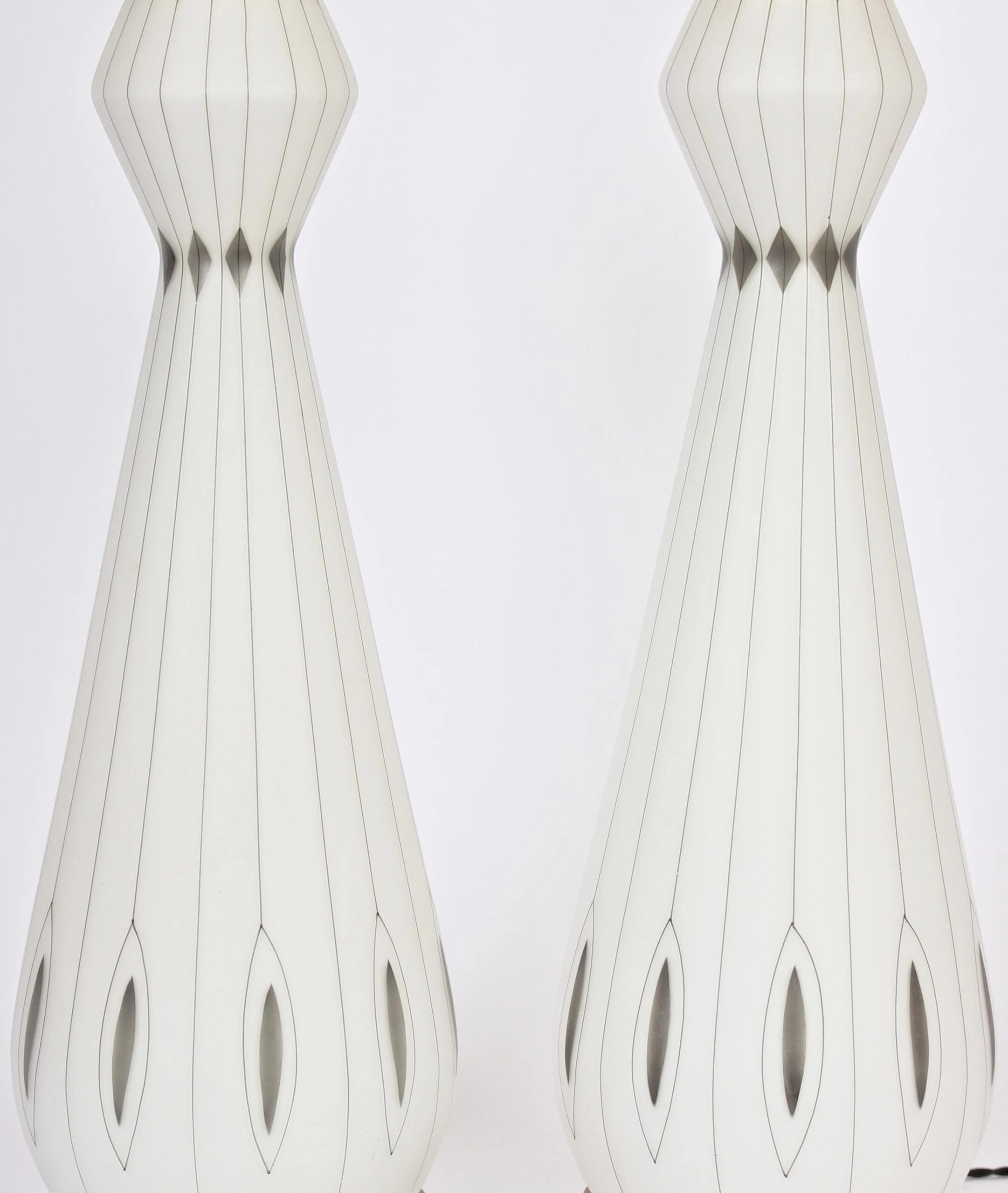 Monumental 36″H pair of white frosted glass table lamps with Sterling Silver line. Featuring a modern translucent white frosted glass …